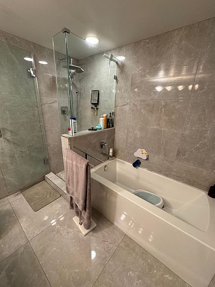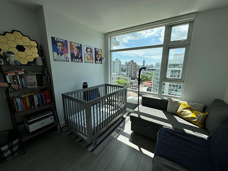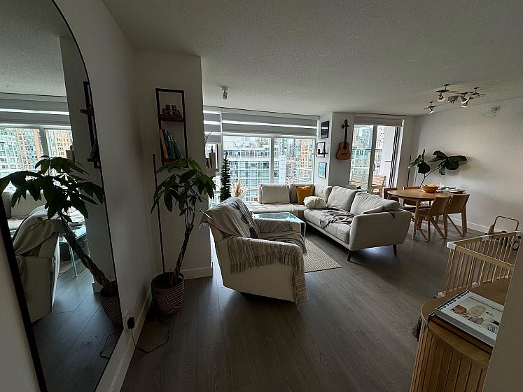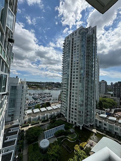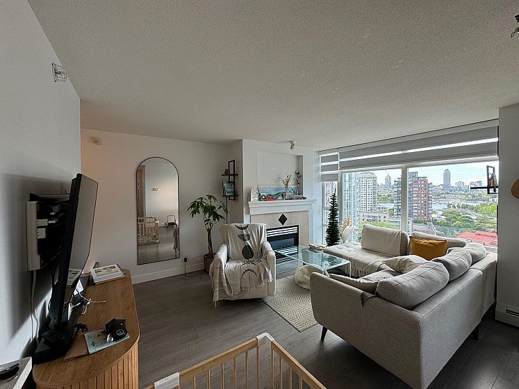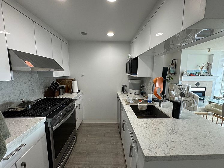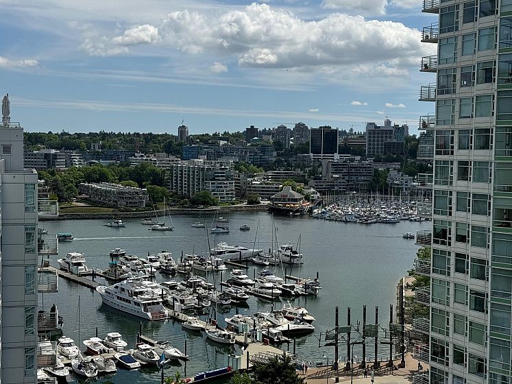 Beautiful, SW facing unit with water views! Fully renovated in 2020, including appliances and flooring, kitchen and both bathrooms. Bright and updated 2 bedroom apt with 2 full baths, fireplace, large den, storage, 2 parking stalls. and views ! Amazing location, just steps to sea wall, parks, Urban Fare, coffee shops and restaurants. Amenities include indoor pool, hot tub, sauna, steam room, exercise room, and concierge.