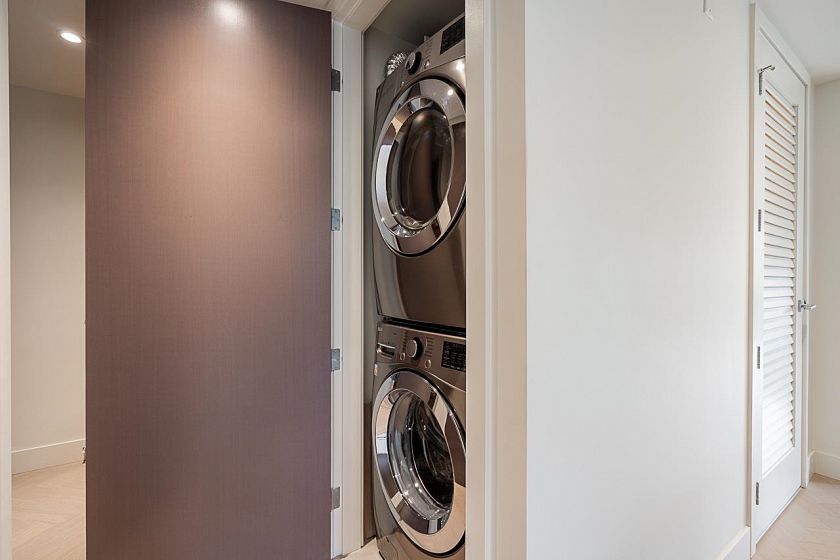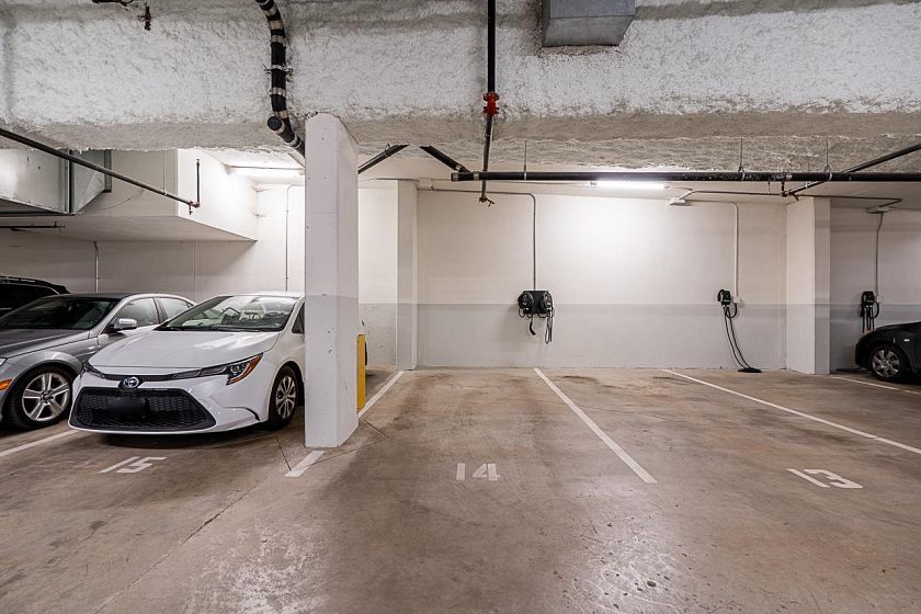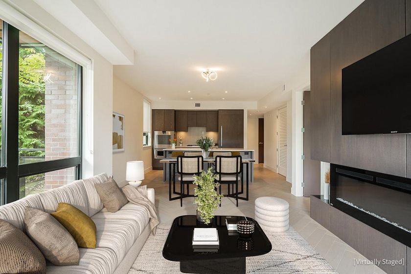 Available now! This elegant 2 bdrm+flex 969sf CORNER SUITE is like NEW, a fashionable design gem … both suite & building! Open concept, it features: a beautiful kitchen w/Caesarstone counters, sleek cabinetry & Gaggenau appliances; white oak H/W flooring throughout, a stylish 72” fireplace, A/C, & is bright from large folding window walls that open for easy access to the wrap-around balcony for year-round enjoyment. Well-separated bedrooms; the primary with spa-inspired ensuite & in-floor heat. Amenities include: communal BBQ area, Fitness Centre, Kids Play Area, & Rooftop garden plots. Secured parking w/EV charging. Pets welcome! Ideal location - close to schools, Canada Line, Cambie Village for cafes, shops & services, Douglas Park, community centre, daycare & more!