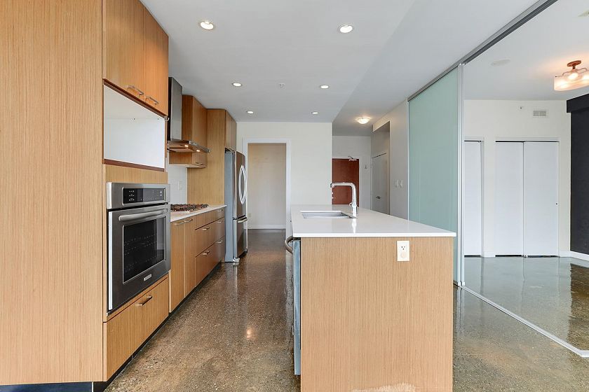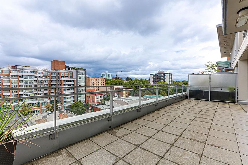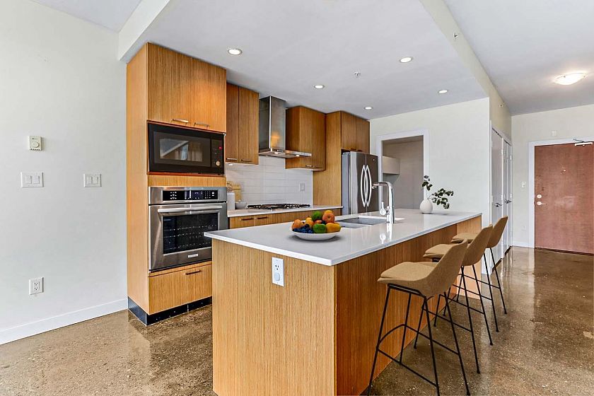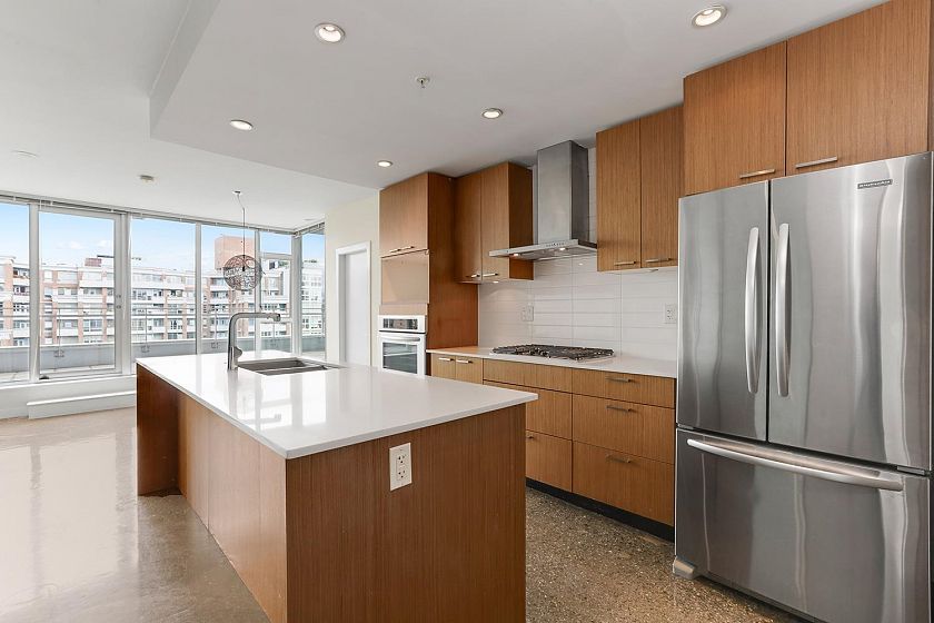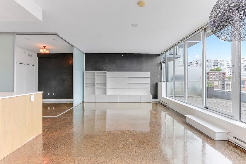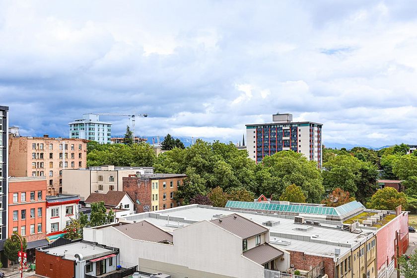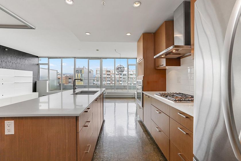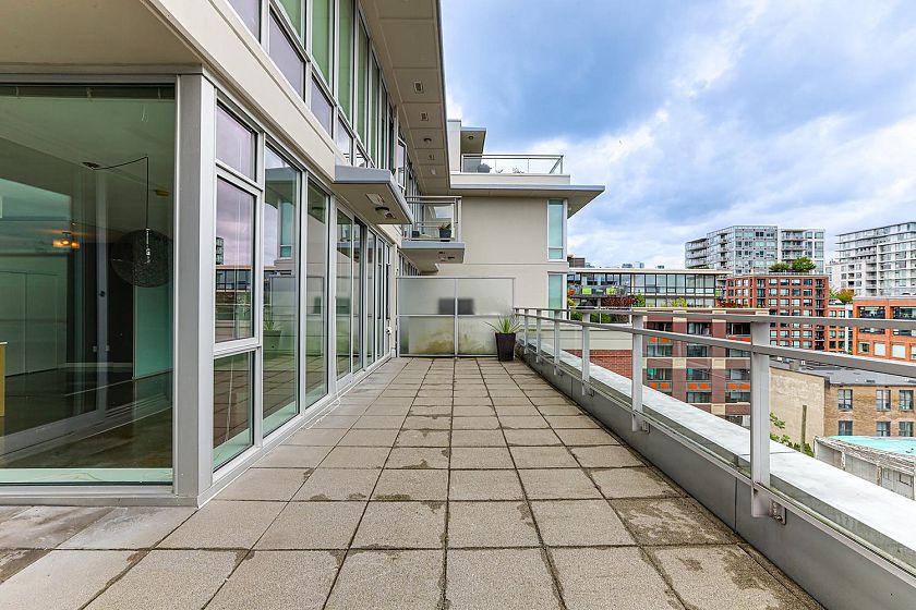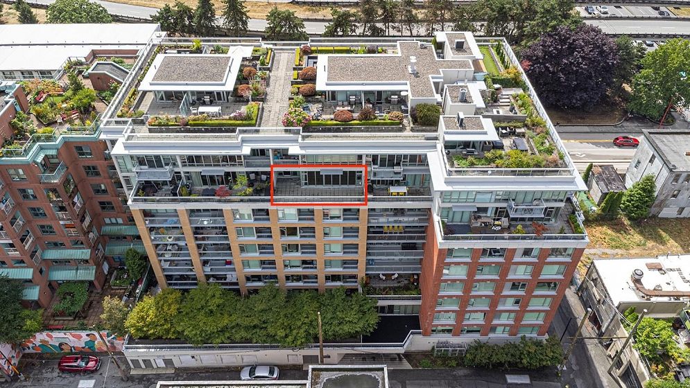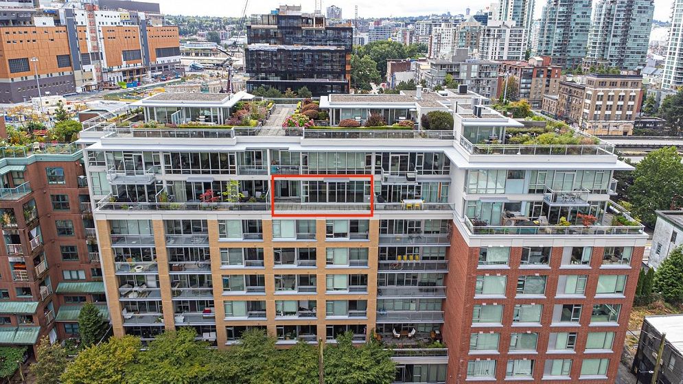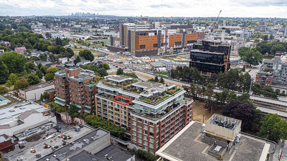 Welcome to V6A where Chinatown & False Creek Flats come together. Located on the quiet North side of the building offering views of city & mountains, this 1,094 sqft 2 bed, 2 bath & flex space unit is looking for a new owner. This Sub Penthouse unit offers a large 355 sqft serene outdoor patio for getting away in the middle of the city. Home features solid composite stone countertops, stainless steel appliances, teak wood veneer cabinetry, & a kitchen island making this unit a chef's dream. Enjoy the convenience of a walk-in pantry or office, gas range & thick reinforced concrete floors & ceilings throughout. The unit boasts a dining area, walk-in closet in the primary & a spa like bathroom w/ separate shower & deep soaker tub offering comfort & style under one roof. OH sunday 1-130 sept21