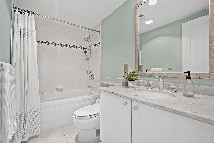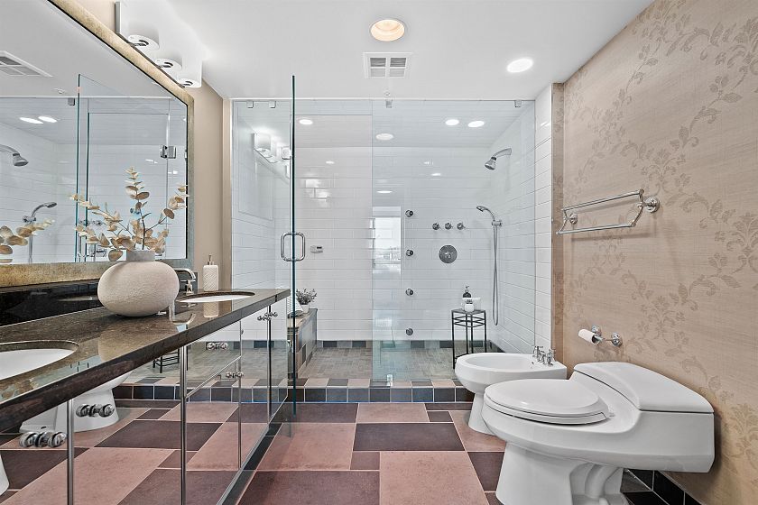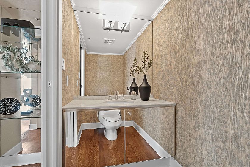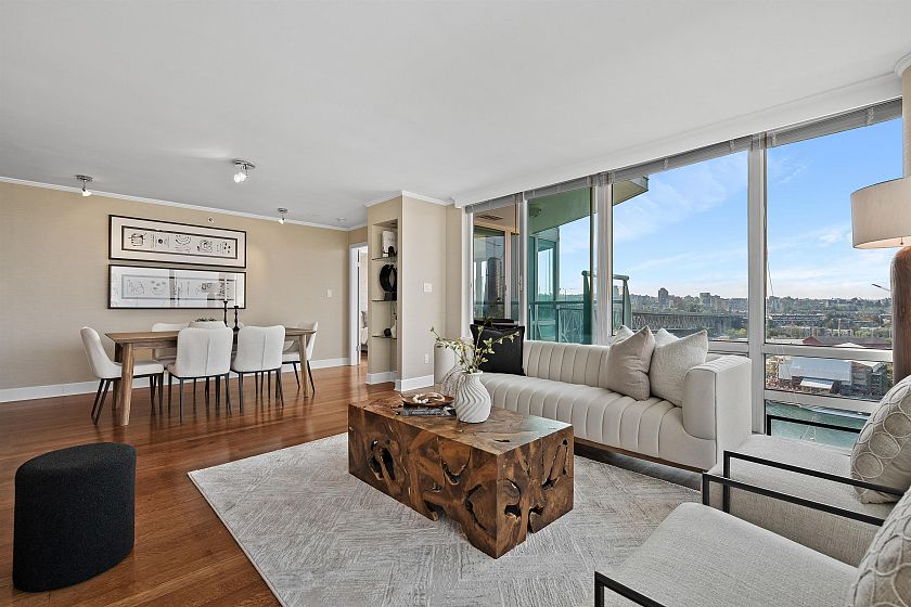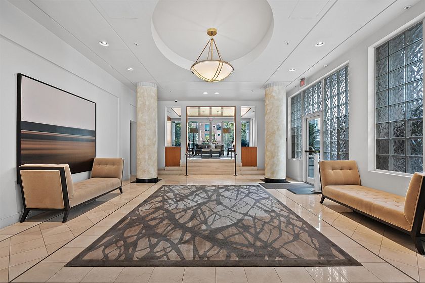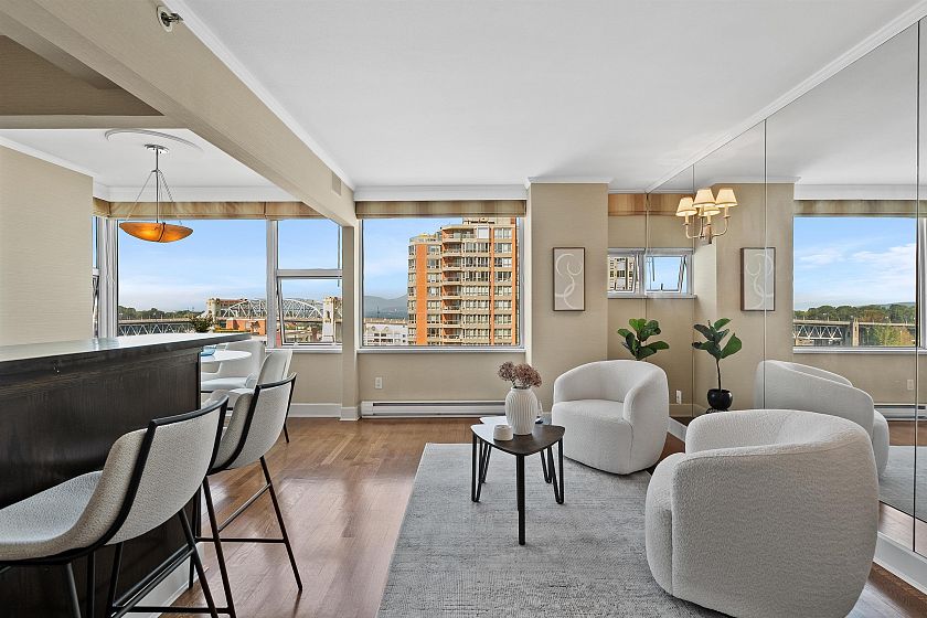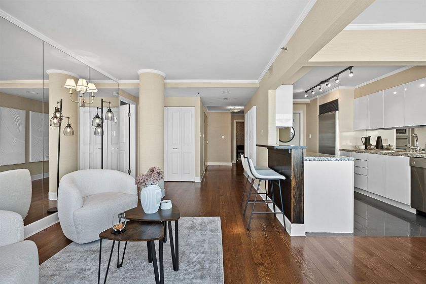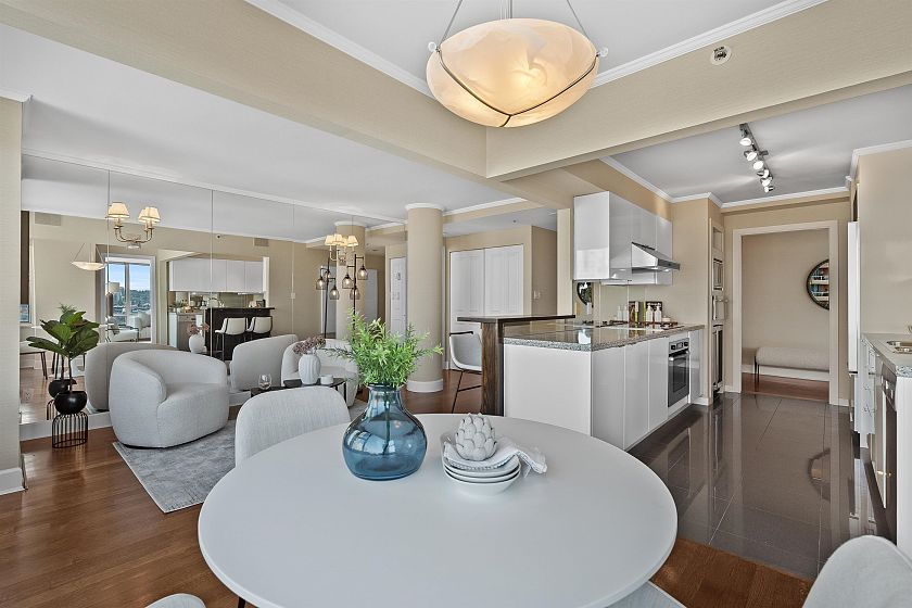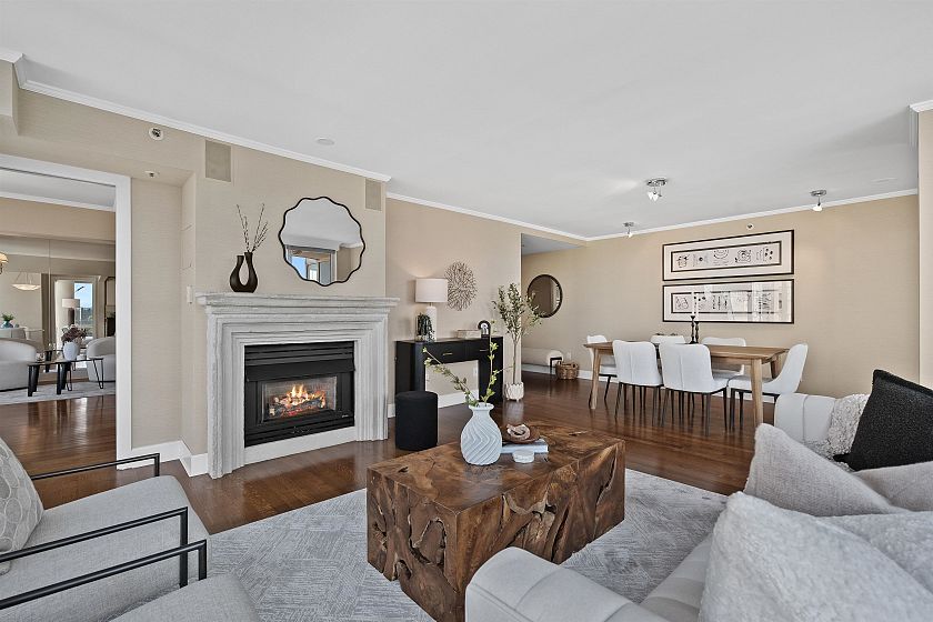 Welcome to this rare 1,620SF corner residence, perfectly designed for downsizers who refuse to compromise on space, style, or convenience. Ideal floor plan- both bedrooms are separated—each boasting its own ensuite and walk-in closet. Natural light pours in this SW facing home with floor to ceiling windows and gas fireplace. The formal living and dining room flow seamlessly into a generous family room and breakfast nook, creating multiple spaces to entertain or unwind. Updates include oak hardwood floors, designer wall paper and galley kitchen with Miele appliances. Quiet building that has undergone rainscreening and major upgrades. Amenities: concierge, indoor pool, gym, new outdoor gardens and water features. 2 parking and locker. Relax and enjoy!