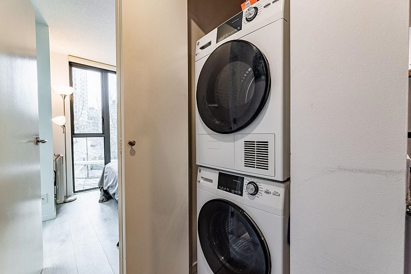 Fantastic Building in an amazing location at "The Pointe". Come and view this well-laid out unit, which has a bright and spacious one-bedroom and an office that could double as a second bedroom with a peek-a-boo view of Coal Harbour! Open kitchen and living room with Newer laminate floors, newer washer, condensing dryer, Stainless Steel Fridge, stove, and dishwasher. The building features a Gym, party room, business center, bike locker, concierge, and visitor parking available. Central location close to seawall, Stanley Park, Coal Harbour Park and Playground, and the business district. This unit comes with one parking spot and a large in-unit storage room.