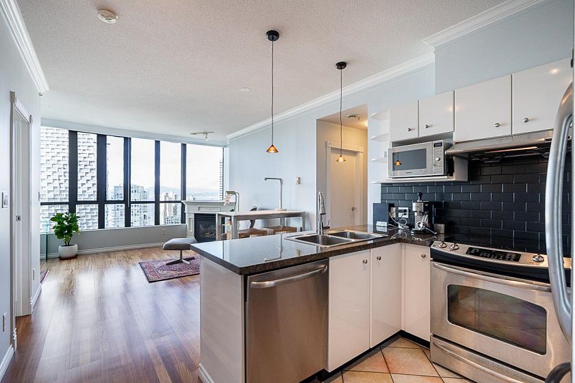 This one-of-a-kind Unit 3202 offers stunning sunset views from its SW corner perch overlooking False Creek & English Bay. This 2 bed, 2 bath + den + office sub-penthouse boasts large windows in every room, breathtaking views throughout. Kitchen features granite counters and S/S appliances. 9’ ceilings, hardwood floors and gas fireplace. Only 2 units on level 32 added privacy! Amenities include concierge, party room, indoor/outdoor pool, Jacuzzi, sauna, gym, guest suite, an elegant lobby with passenger drop-off & and an outdoor courtyard with beach volleyball court. Pets & rentals allowed. Prime location—steps to SkyTrain, dining in Yaletown, grocery shopping & the seawall. George Wainborn Park is one block away Bonus:* 2 parking 1 storage locker.