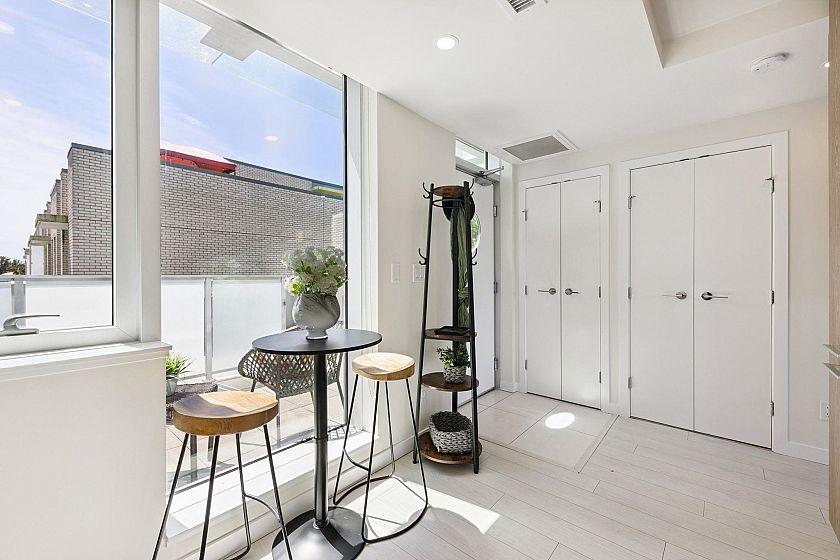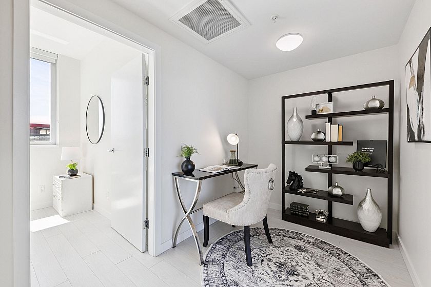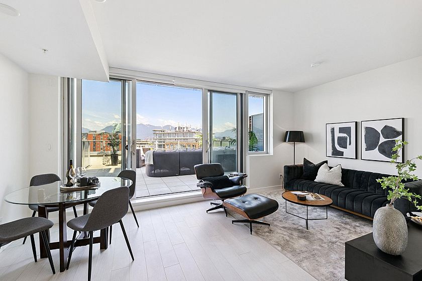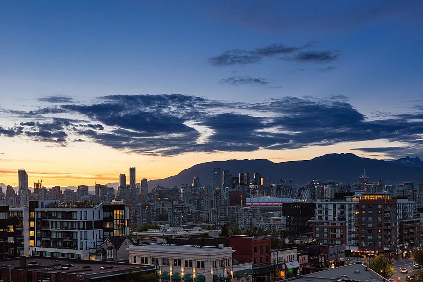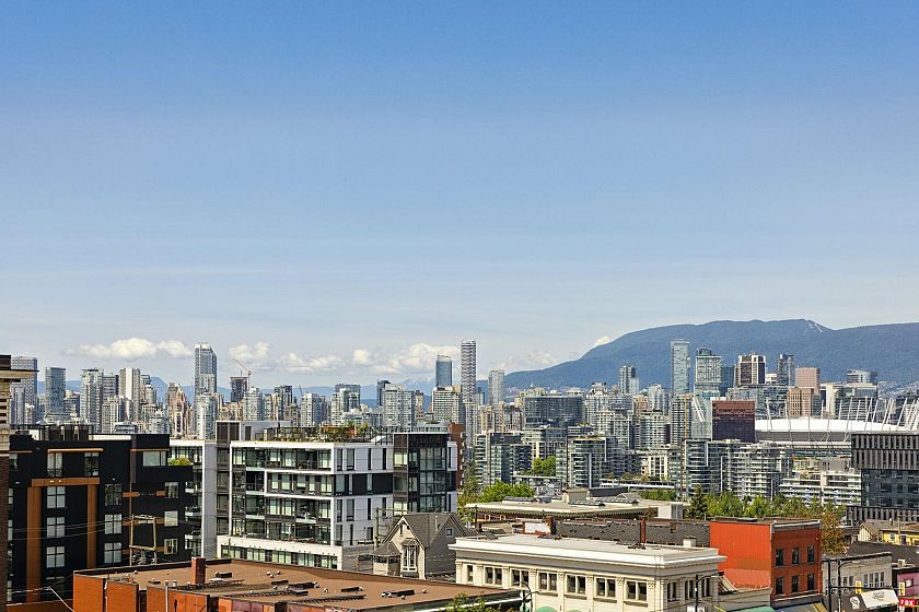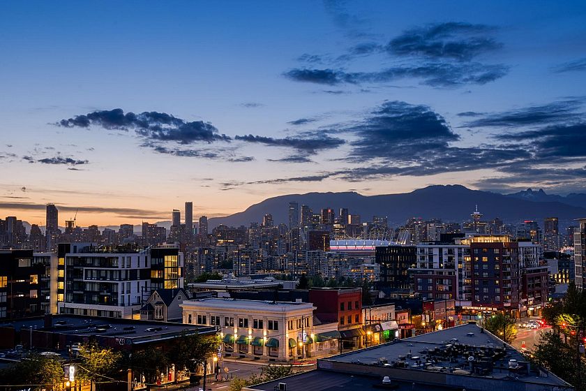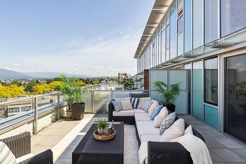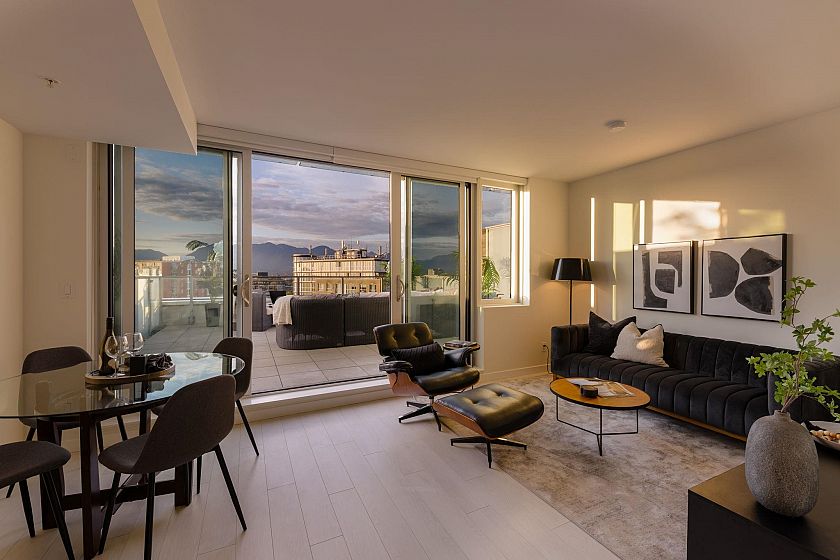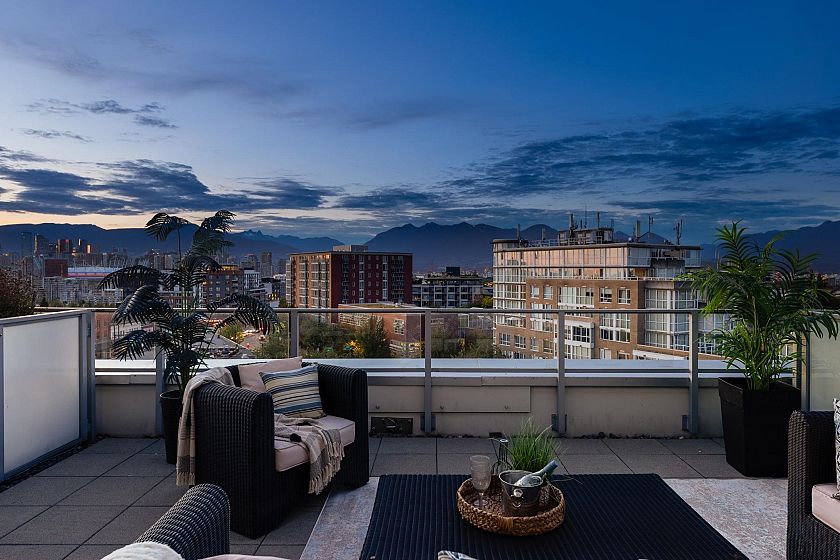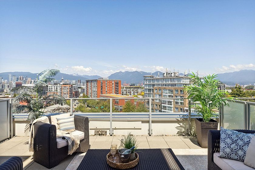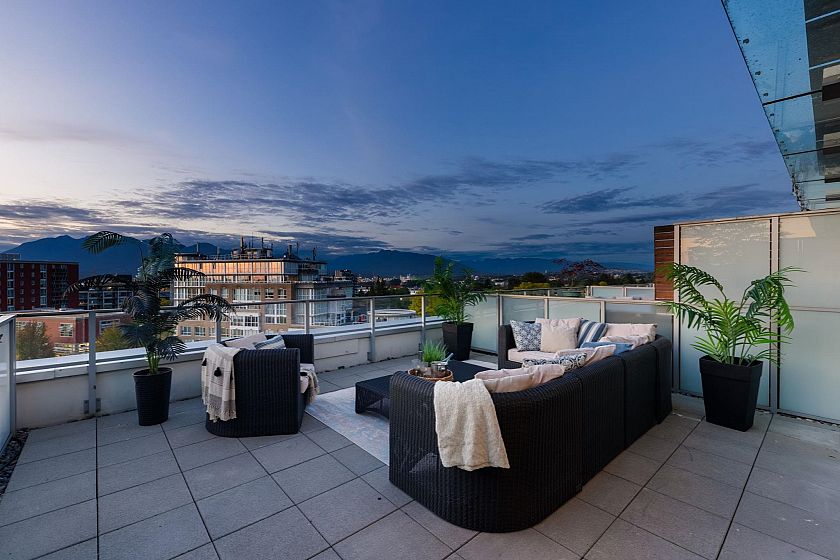 Elevated. Unrivaled. Captivating. This coveted 2 BED + DEN Podium Penthouse offers 1065 SF of modern living inside plus a BONUS 484 SF of outdoor space. Savor morning coffee w/courtyard views, host sunset dinners against the downtown skyline, or lounge & unwind under the stars - your TWO expansive deck areas offer the perfect backdrop for every moment. Enjoy soaring panoramic windows, A/C & a sleek Italian kitchen w/clean modern lines. Upstairs, 2 en-suited bedrms & an open DEN provide space to recharge & relax. 1 parking & 1 locker. BEST amenities: 3,000 SF lounge w/kitchen & meeting room, gym, guest suite, hobby room, 20,000 SF courtyard w/BBQs, dog wash, community gardens, kids play area. 100 Walkscore in the heart of this vibrant urban community & new Skytrain Stn.