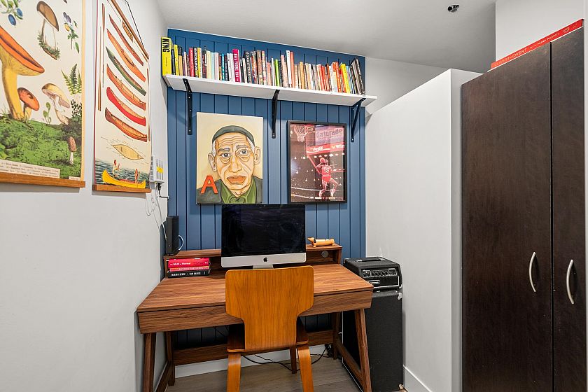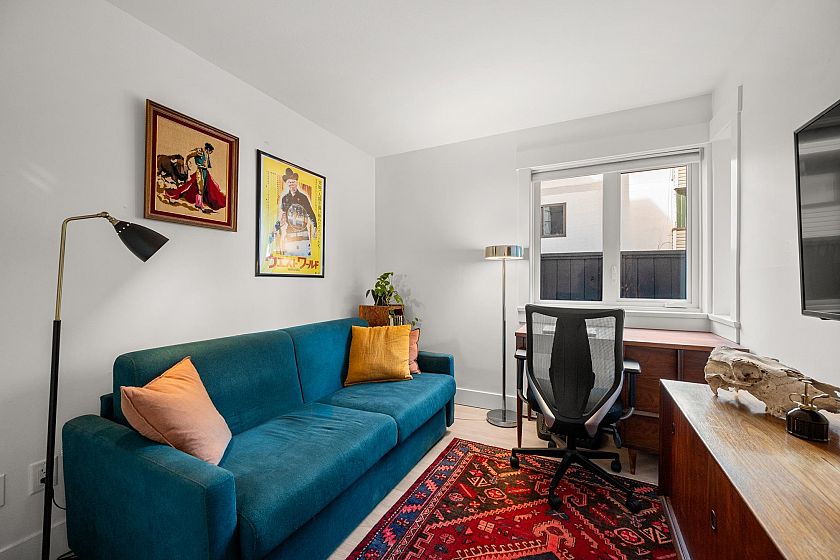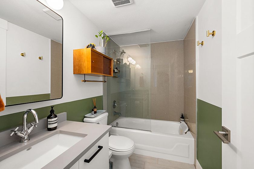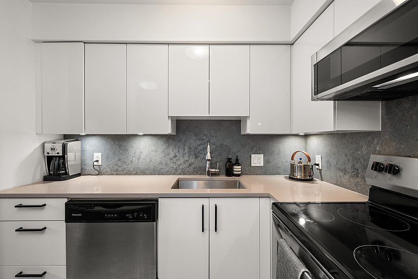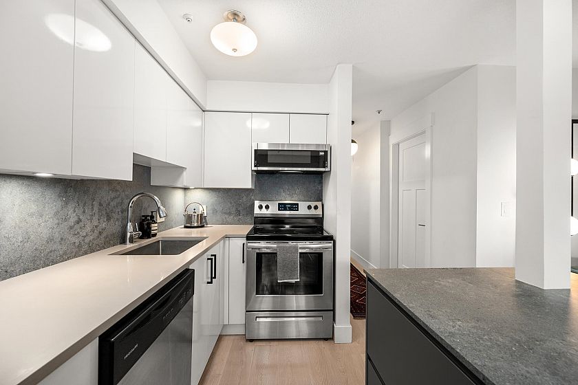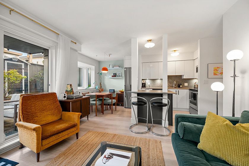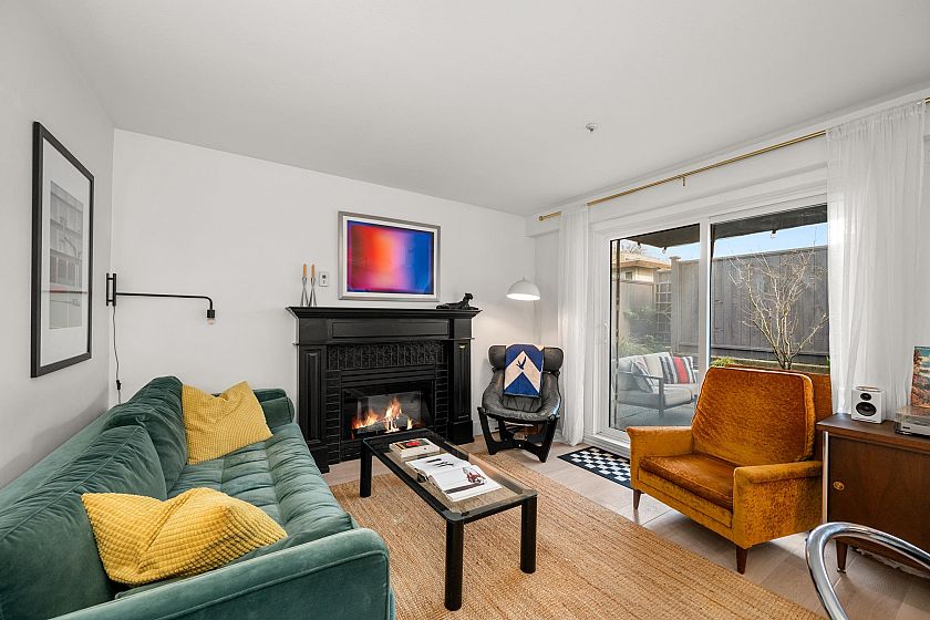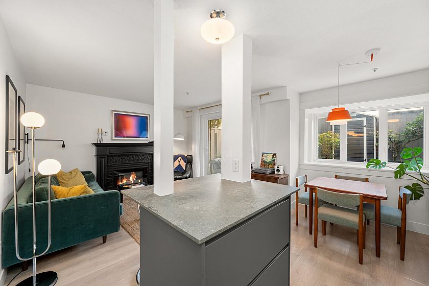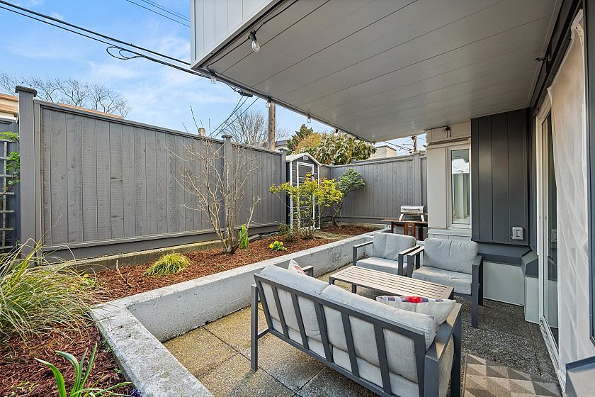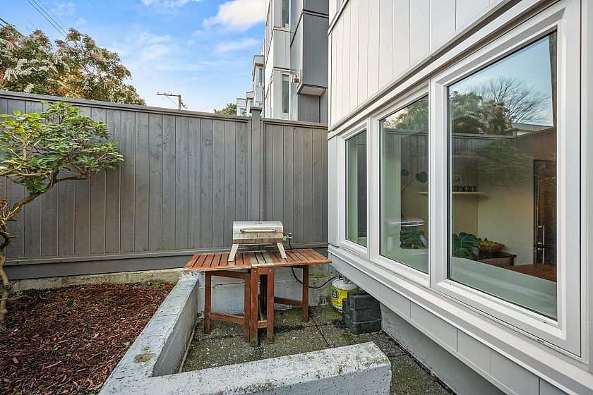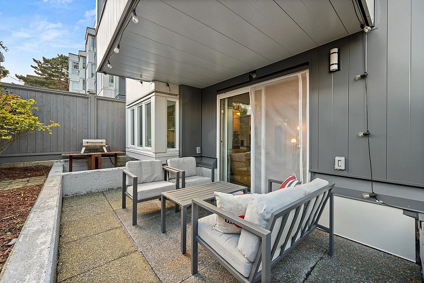 On the QUIET SIDE! Welcome to this updated, 2 bed & den, ground floor apartment in this wonderful community that’s pet friendly & minutes to downtown. Recently updated bathroom incl: tile floor, tile surround and tub w/ glass doors, floors throughout, open kitchen w/ custom cabinets, quartz countertops, S/S appliances, island to entertain at, baseboards, door trim & closet doors throughout. Enclosed den serves as an office or nursery & large patio for those needing to entertain – room to BBQ or garden & even put in your own storage shed. Rain-screened in 2021, including windows/patio doors & roof, front entrance upgrades in progress. Transit out front to easily get DT, bike storage, restaurants, grocery, close by with community rooftop patio.