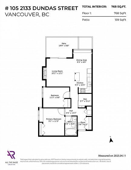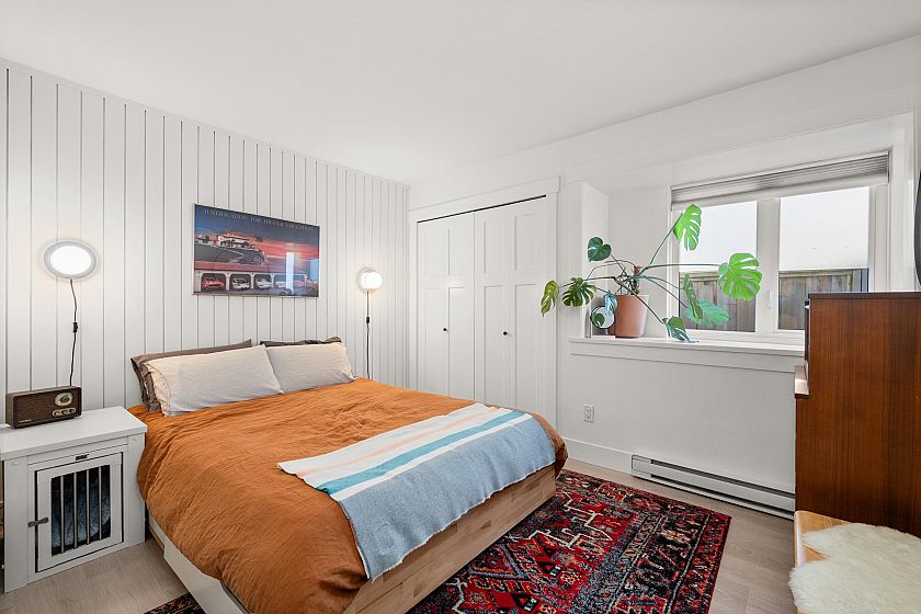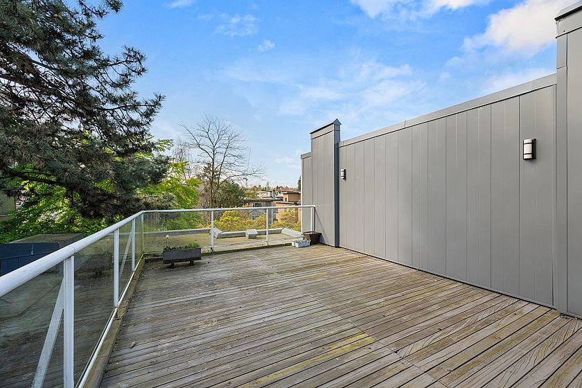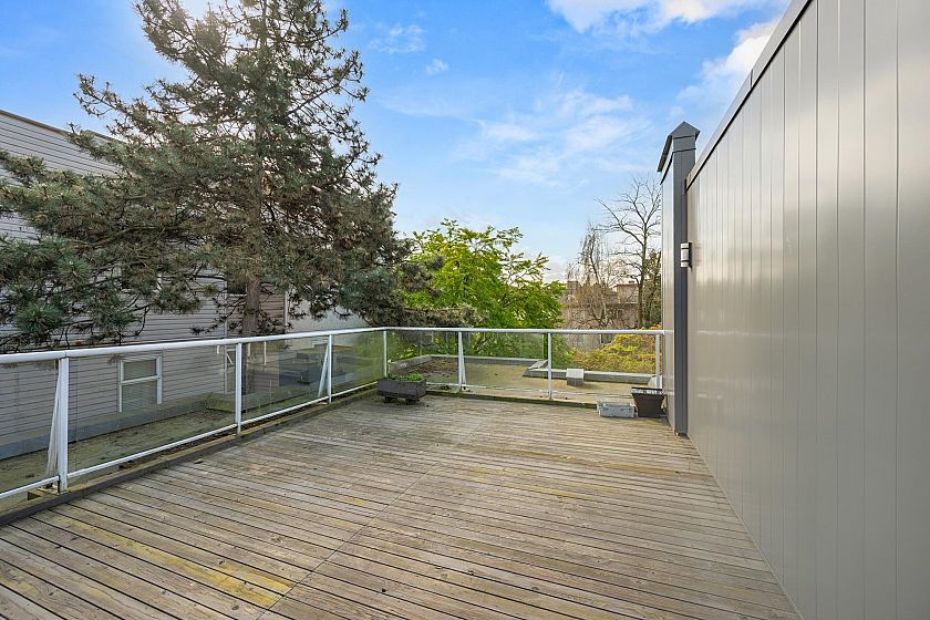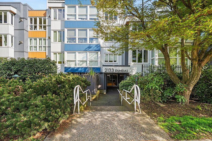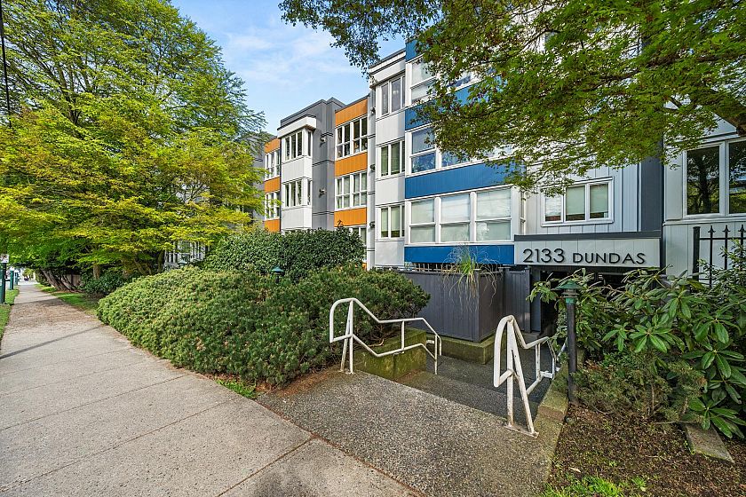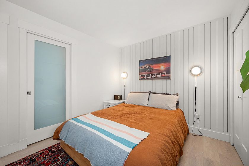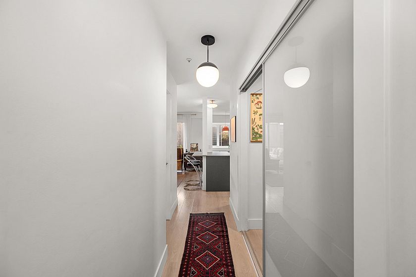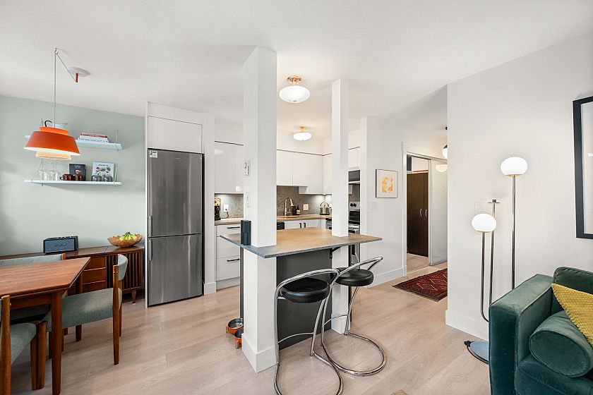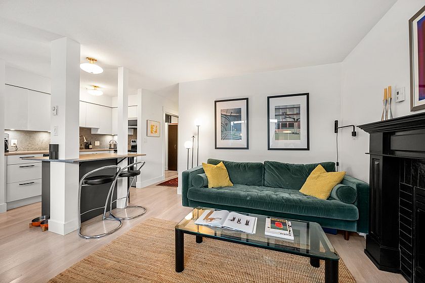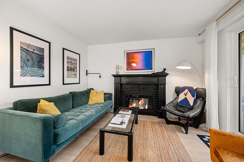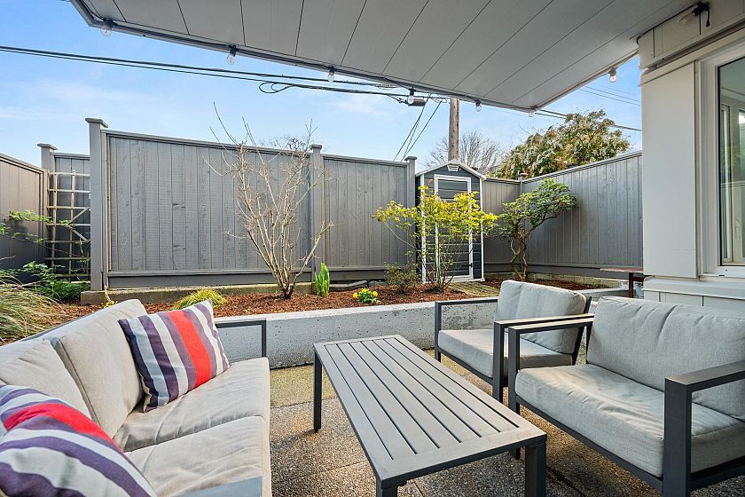 On the QUIET SIDE! Welcome to this updated, 2 bed & den, ground floor apartment in this wonderful community that’s pet friendly & minutes to downtown. Recently updated bathroom incl: tile floor, tile surround and tub w/ glass doors, floors throughout, open kitchen w/ custom cabinets, quartz countertops, S/S appliances, island to entertain at, baseboards, door trim & closet doors throughout. Enclosed den serves as an office or nursery & large patio for those needing to entertain – room to BBQ or garden & even put in your own storage shed. Rain-screened in 2021, including windows/patio doors & roof, front entrance upgrades in progress. Transit out front to easily get DT, bike storage, restaurants, grocery, close by with community rooftop patio.