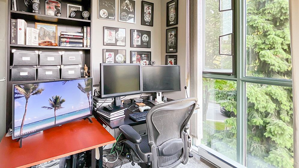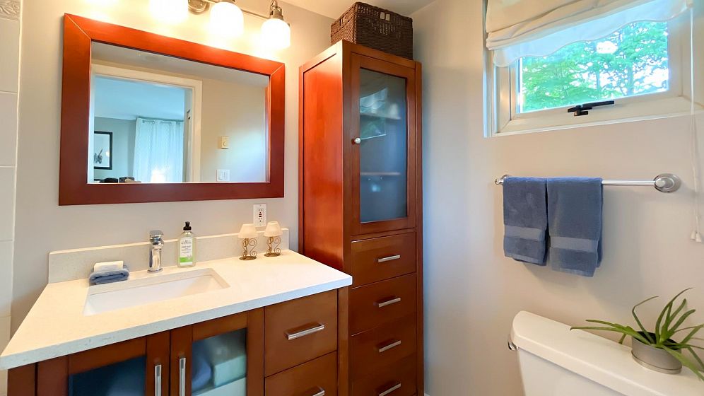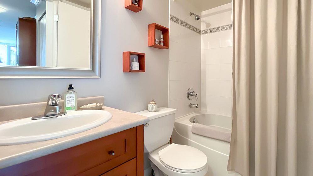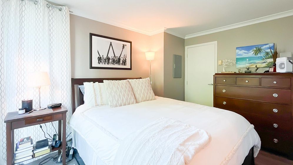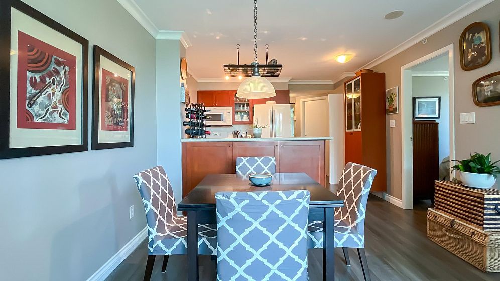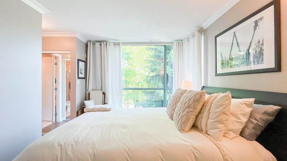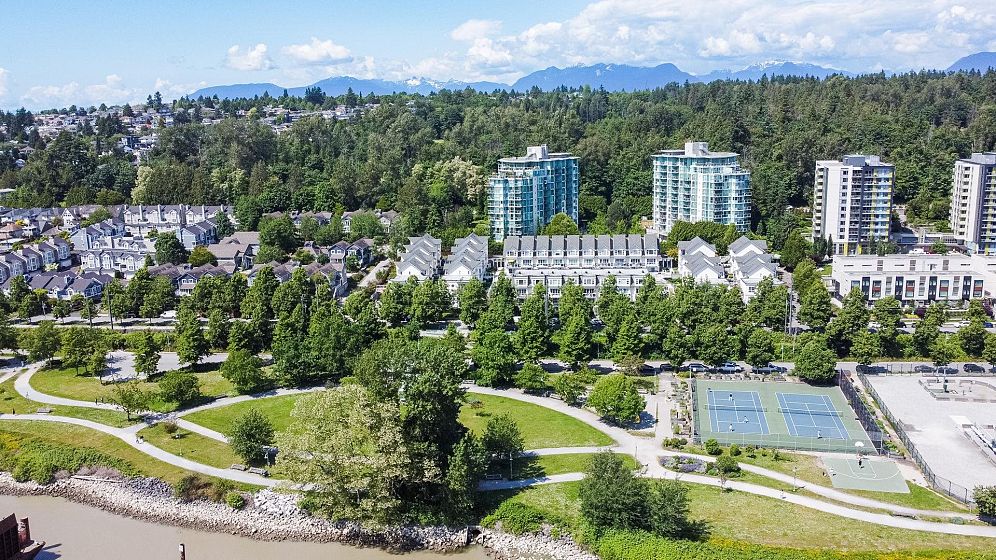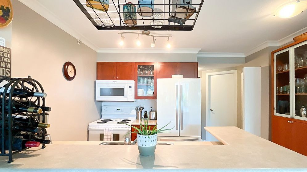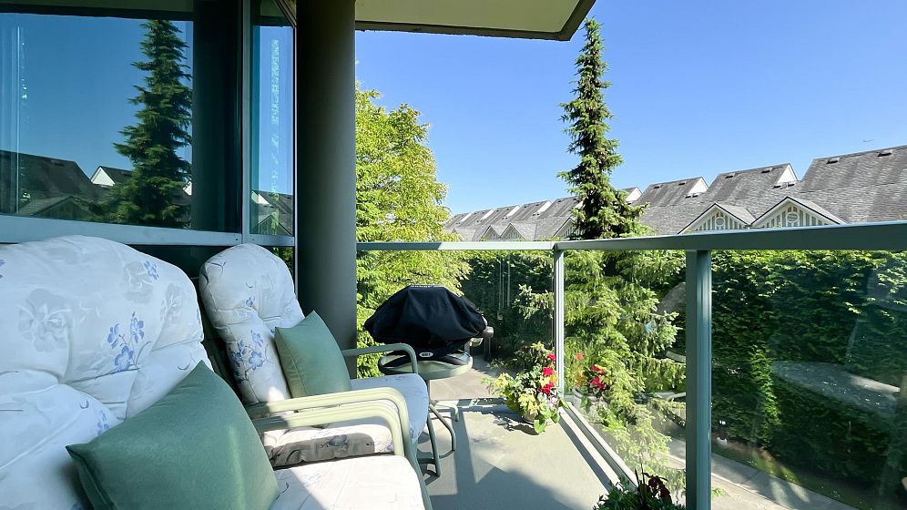 Welcome to tranquil living just steps from the river and nature trails. This beautifully maintained 2-bedroom, 2-bathroom corner unit, condo offers a peaceful garden outlook, filling the home with natural light and calm. Enjoy an open-concept layout with a functional kitchen, spacious living area with gas fireplace, and private patio perfect for morning coffee or evening relaxation. Both bedrooms are generously sized, with the primary featuring an ensuite and ample closet space. Nestled in a quiet enclave just a short walk to the vibrant River District, you'll have shops, dining, and amenities at your fingertips—while still enjoying the beauty of riverside living. Unit has monitored alarm system in a great building with a gym, secure bike storage, 2 parking, 1 locker.