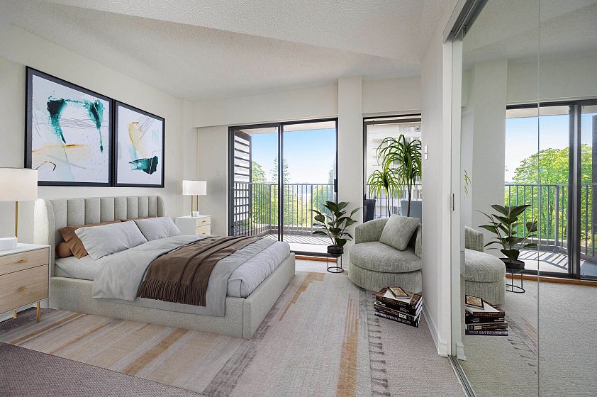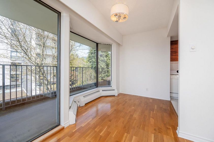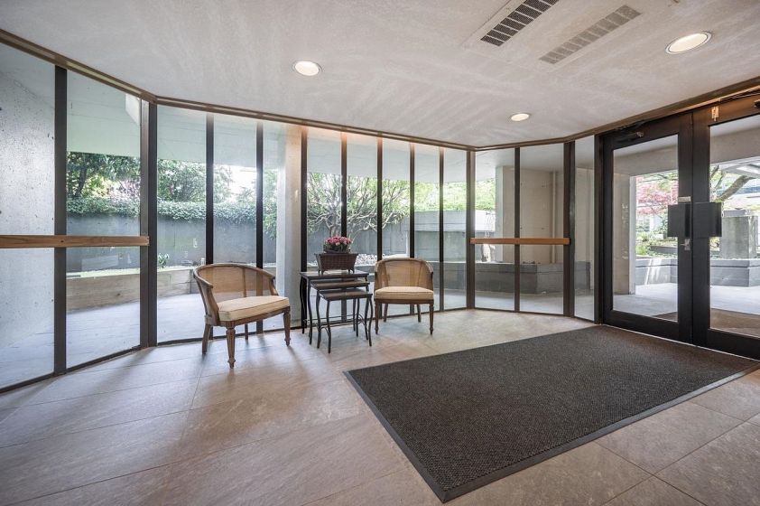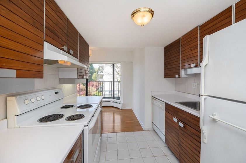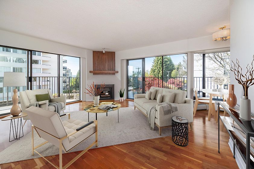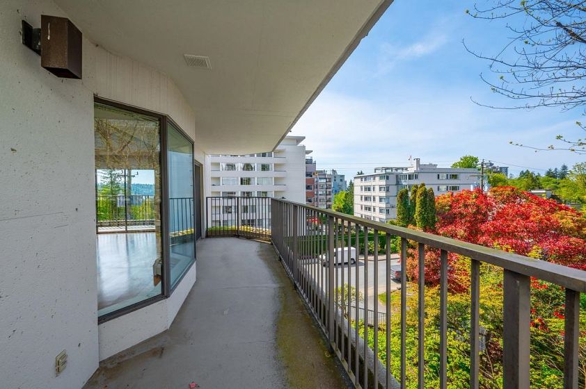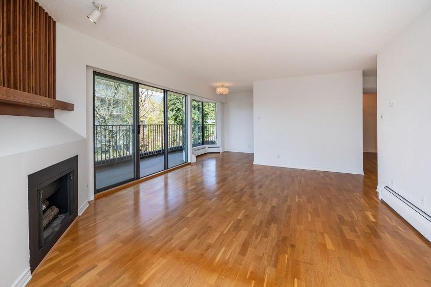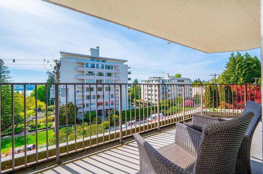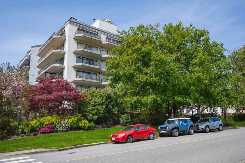 **$135K BELOW ASSESSMENT!** PETS ALLOWED. Nestled in the heart of Ambleside, this south facing 2 bedroom with 1.5 bathrooms, upper corner apartment in the Wesmoor building, offers an abundance of natural light, two generous sized bedrooms and two large covered patios to enjoy the partial bridge and ocean view! Spacious living room w/ hardwood floors and a beautiful comer gas fireplace that adds ambiance and warmth. NEW CARPETS and JUST PAINTED throughout! Excellent CONCRETE low-rise building with only 18 units on 7 floors. Enjoy the beautiful grounds and water feature at front entrance. Walking distance to all the best Ambleside has to offer - top amenities, shops, restaurants,seawall, parks and the beach!Rentals allowed. EXCEPTIONAL VALUE!