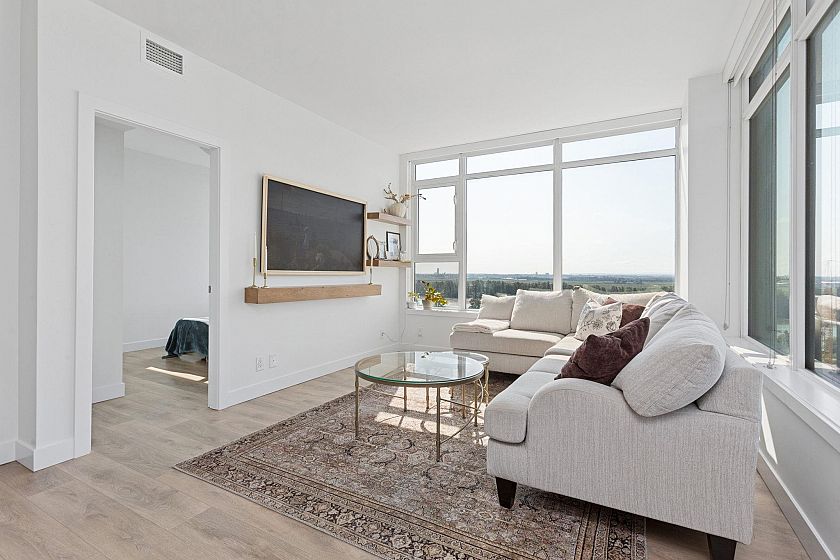 Welcome to One Town Centre located in the River District. A RARE sub-penthouse corner unit. Offering 180 degrees of unobstructed and panoramic waterfront views, this 2bed + 2bath and den is in a league of its own. Offering 200 sqft + of additional outdoor living space this unit is the perfect family entertainer. Throughout the shared living space, you're equipped with top of line kitchen appliances both Jennair gas cooktop and refrigerator. Full-size washer/dryer. Paired with well-proportioned bedroom sizes both in the master bdrm and secondary bdrm. If convenience is what you're looking for, look no further everything is at your fingertips, Save-On-Foods, Starbucks, restaurants, banks and all other amenities. Heat pump equipped, 1 storage locker and 1 parking available. OH Sat/Sun 2pm-4pm