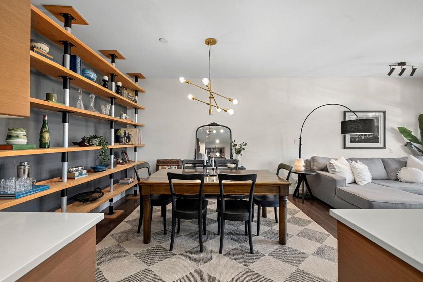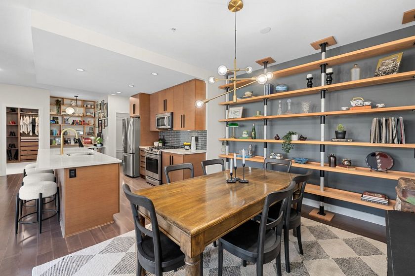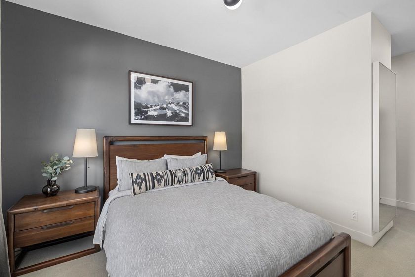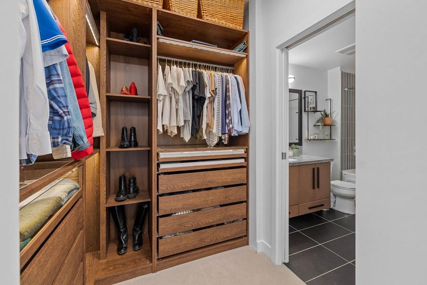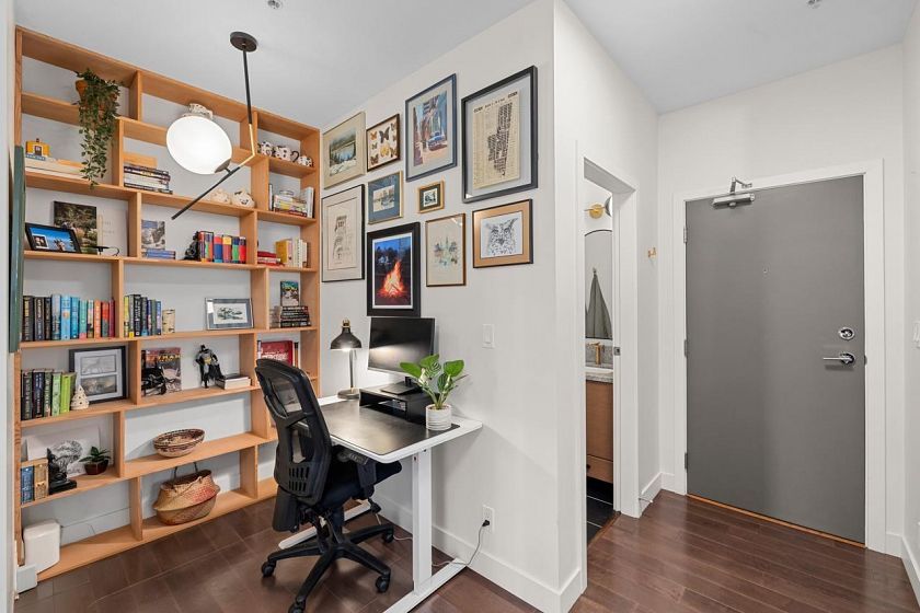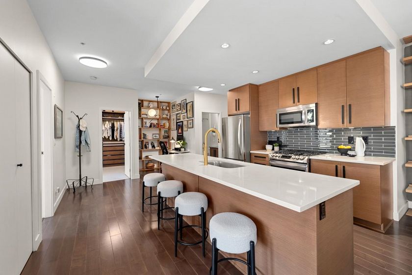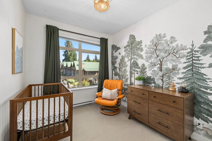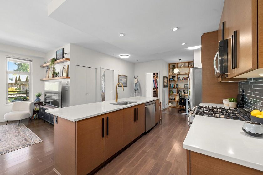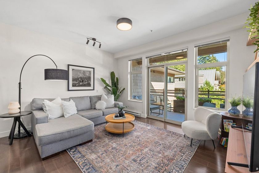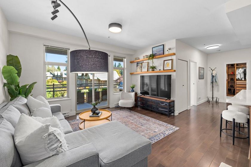 This stylish 2-bedroom + den home offers 1,095 sq ft of refined living space w/ 9-ft ceilings & a modern open-concept layout, perfect for entertaining. Enjoy high-end stainless steel appliances, quartz countertops & custom fir shelving. Relax in the sun on the oversized covered patio. The spacious primary bedroom features a custom walk-through closet leading to a generous ensuite. The office nook is ideal for those that work from home & need dedicated workspace but don't want to sacrifice the 2nd bedroom. Nestled in a Whistler-inspired complex that backs onto forest trails bordering the Northlands Golf Course, just minutes from the Deep Cove and Parkgate Shopping Centre. 2 parking stalls w/ EV charging, a storage locker, guest suite & gym. Open Saturday September 27 1-2:30pm