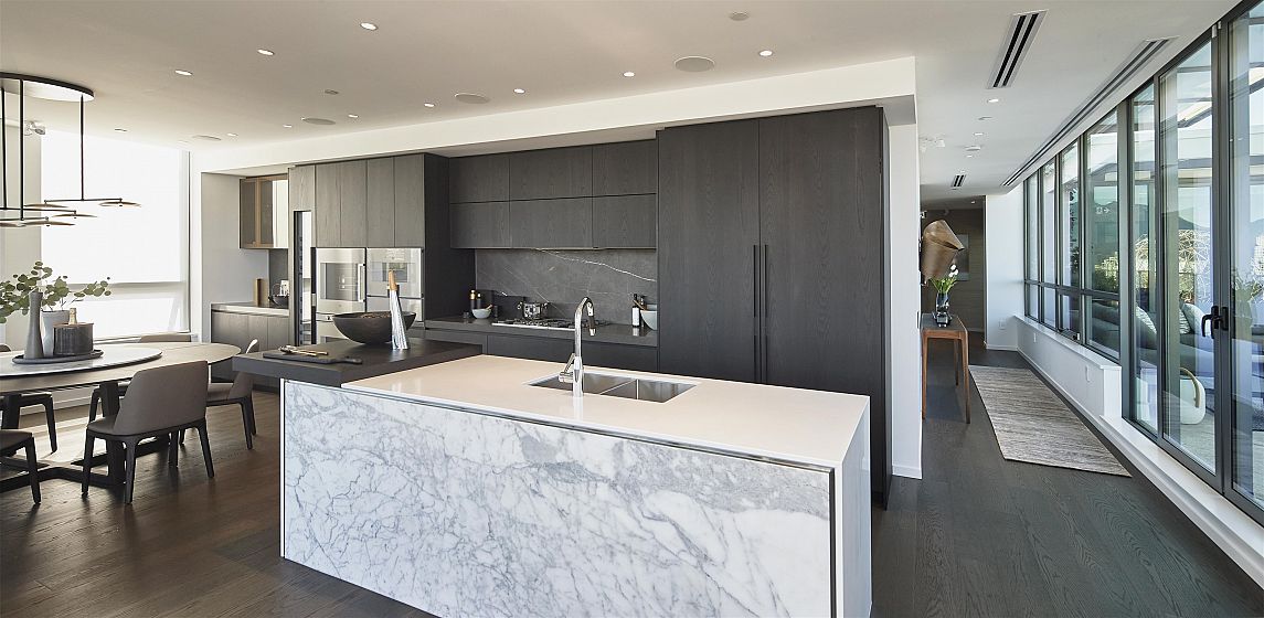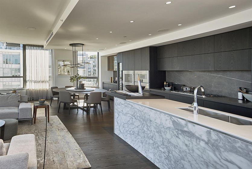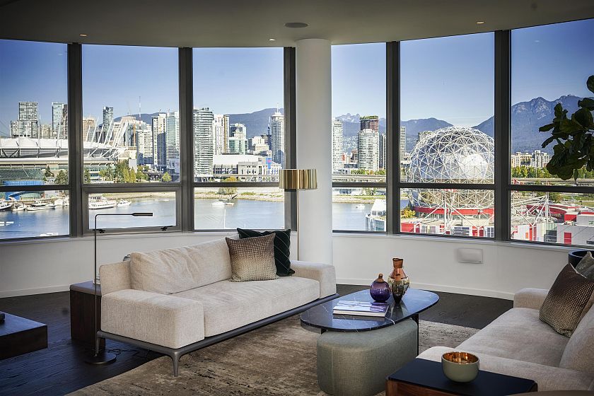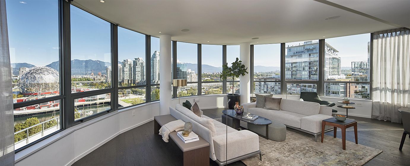 Elegant curved windows open this spacious Penthouse to views of the ocean, mountains and city skyline. Navio North claims enviable location on the Seawall in vibrant SE False Creek, next to a future 6-acre park. The 2035sf 2-large sized Bedrooms, 2.5 Bath residence also comes with a 526sf terrace. Featuring a spectacular Poliform kitchen with top-of-the-line Gaggenau appliances, double wall oven and an impressive marble slab island. Poliform closets, including walk-in. This rare offering also includes: 10’ ceilings, wood flooring, generous in-suite storage, A/C, 3 parking stalls (1 is EV ready) and private locker. Developed by award-winning Concert Properties and completed in 2018, this prime home was a developer hold-back as it was the previous Tesoro display suite. BUYER INCENTIVE 5%!
