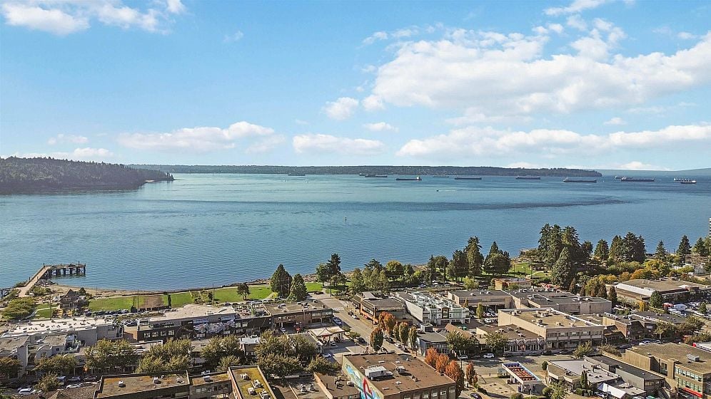 Views from Sea to Sky! This lovingly cared for 2 bedroom sub-penthouse features sweeping ocean views with floor to ceiling windows on one side of the home & beautiful mountain views on the other! With only 2 units per floor, this West facing unit offers tons of natural light and serenity. A welcoming atmosphere in a space that feels like a home. Perfect for downsizers! Spacious and functional layout with a bright living area, dining room, and a huge covered balcony that can be enjoyed year round. This well-maintained building has had many updates including rainscreening, a new elevator, EV charging capability, & pet-friendly (1 dog or 1 cat). Insuite laundry, 1 parking spot near gate, & large storage locker. Walkable to all Ambleside has to offer! Open House Saturday November 1 1-3pm.