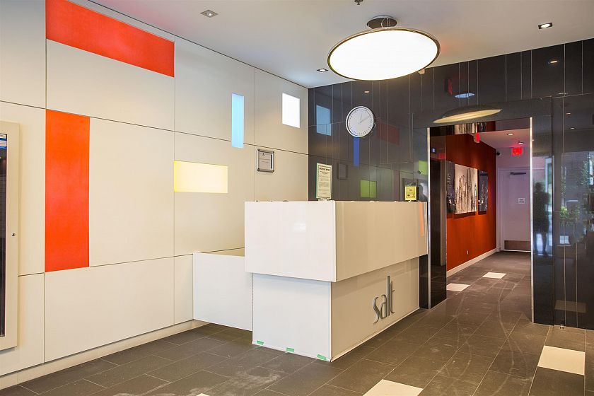 Trendy downtown living at SALT by Concert Properties! This bright SE-facing 2 bed + den corner unit offers stunning city skyline and water views. Thoughtfully designed layout with no wasted space, a sleek open-concept kitchen, spacious balcony, and one parking stall. Enjoy integrated European appliances, quartz counters, and modern finishes throughout. Building features a well-equipped gym, rooftop garden, party lounge & concierge. Walk to shops, seawall, dining, transit & more.