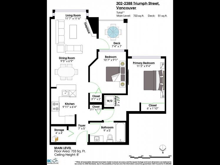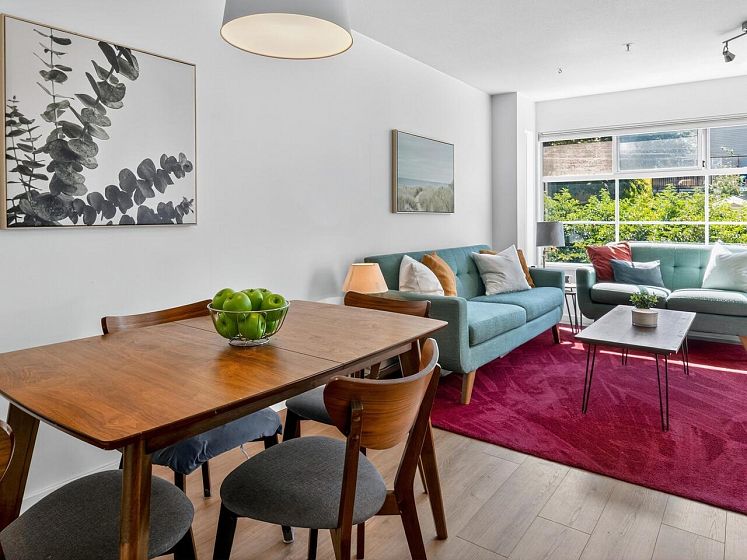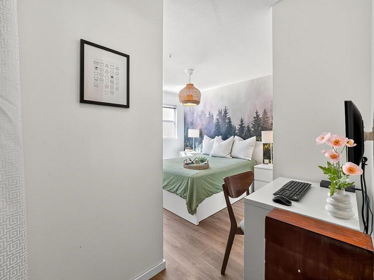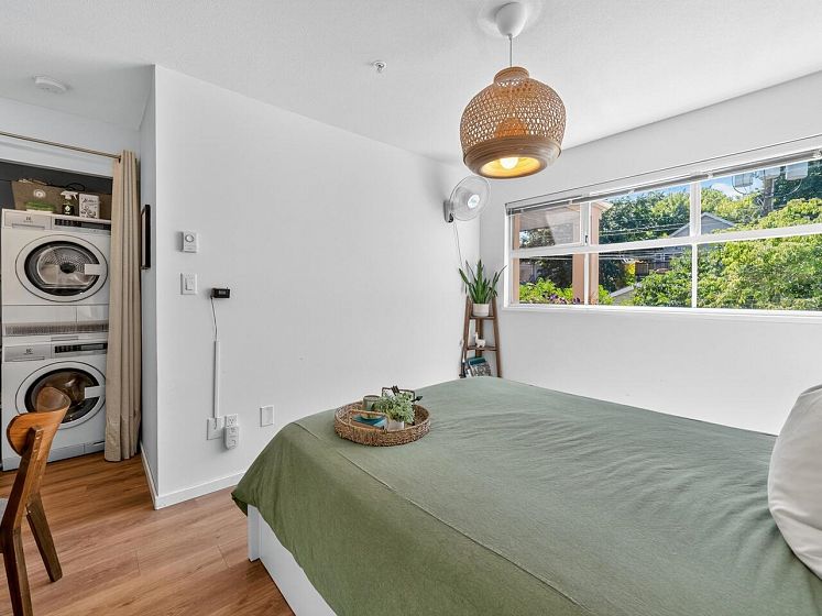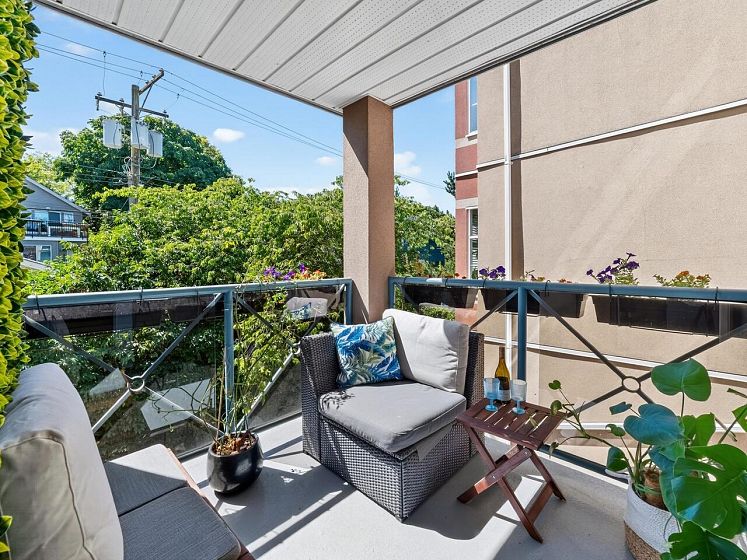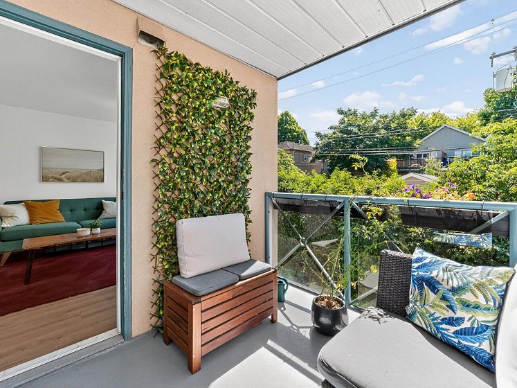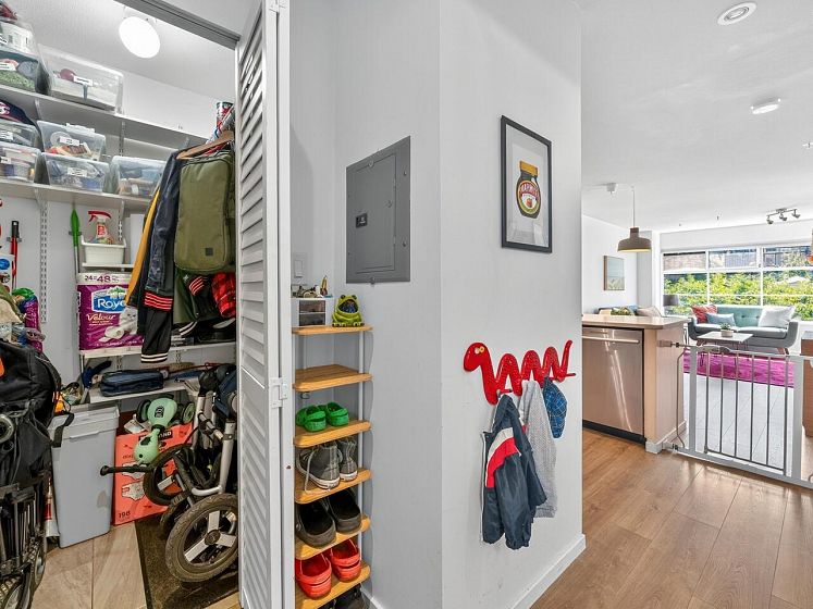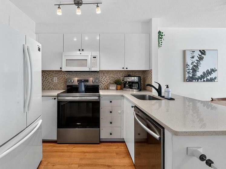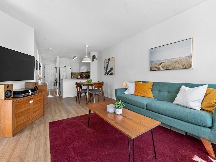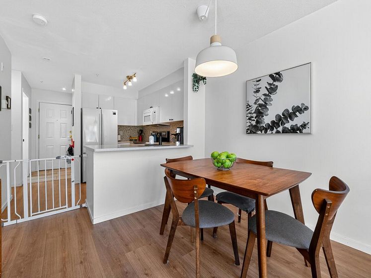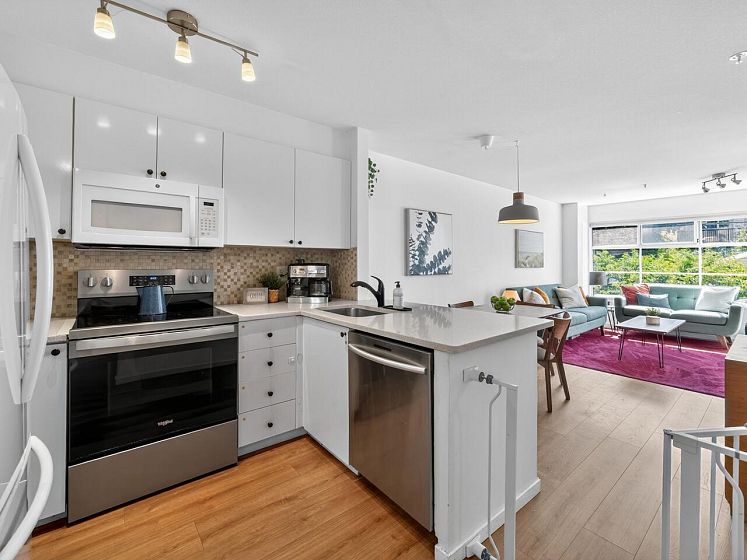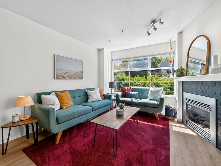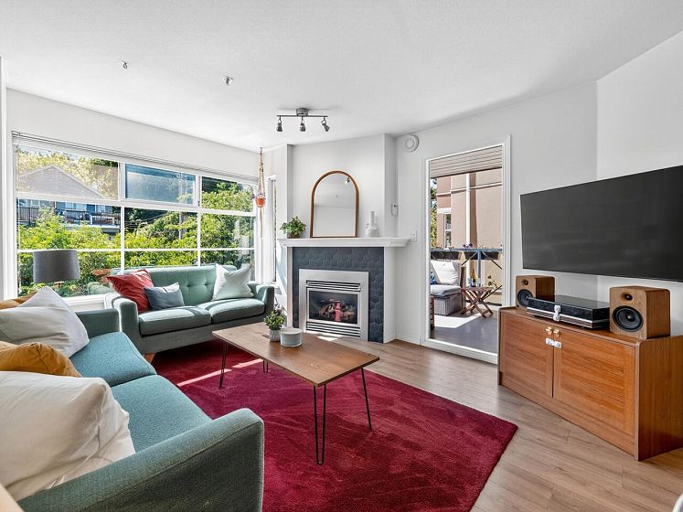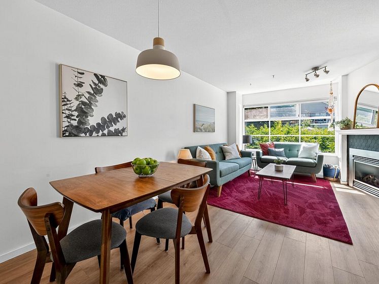 This charming south facing home checks all the boxes! No wasted space, 733 sq ft feels much larger – the spacious kitchen is open to the dining and living areas, perfect for entertaining or keeping an eye on the kids! A cozy gas fireplace completes the living area with ample room for lounging. Spacious primary has a work from home nook and a cheater ensuite bathroom. With insuite laundry, internal & external storage, this fully renovated home with newer laminate wood floors throughout is freshly painted – move in ready! The perfect starter home with room to grow in a solid building - rainscreened, re-piped and parking membrane done with an A+ location close to amenities along Hastings Street including the beloved Donald’s Market.