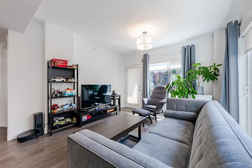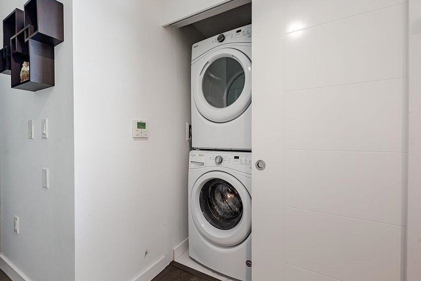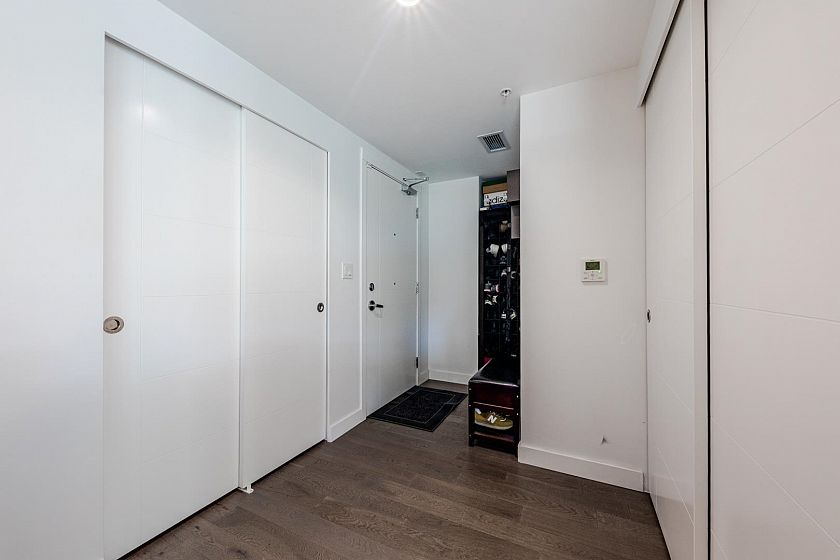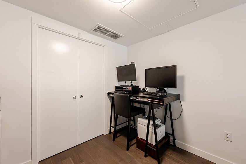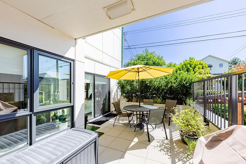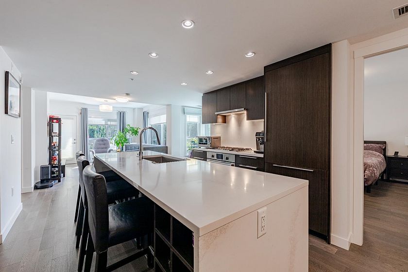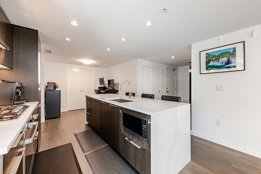 Welcome to The Leveson, nestled in the vibrant South Granville neighborhood. This QUIET (away from Granville) ground-floor, single-level 2 Bedroom + Office home boasts 460 sq ft of private outdoor space. With its elegant, contemporary A/C design and dual access from the street and building, it feels more like a townhome. The chef-inspired kitchen features premium Bosch appliances, a gas cooktop, and quartz countertops with a sleek waterfall edge. The spacious primary bedroom easily fits a king-sized bed, includes a large walk-in closet, and a luxurious double vanity ensuite. Two generous patios with gas hookup are ideal for BBQs and entertaining. Unbeatable location near transit, shops, dining, and top Vancouver schools. Includes 1 EV parking and upgraded locker attached to the stall.