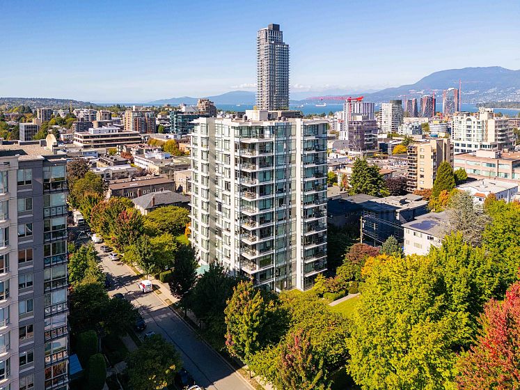 Endless views and timeless sunsets - welcome to Sakura, a collection of 63 luxury residences in the heart of Fairview, Vancouver. Unit 1102 occupies the coveted NW corner of the building and boasts panoramic mountain, city and ocean views. With floor to ceiling windows, 9' ceilings, an open floorplan and 1,360sf of space, this well designed 2 bed + den home offers great natural light, yet is extremely private. Hardwood flooring, granite counters, high-end appliances (gas stove), spa-like baths, electric fireplace, an office and large balcony compliment the space. Both bedrooms face West for amazing views & sunsets. Extremely well run building w/ beautiful gardens. Every convenience nearby. 2 parking (1 EV ready) + 1 storage. Quiet peaceful luxury. Showings available by appointment.