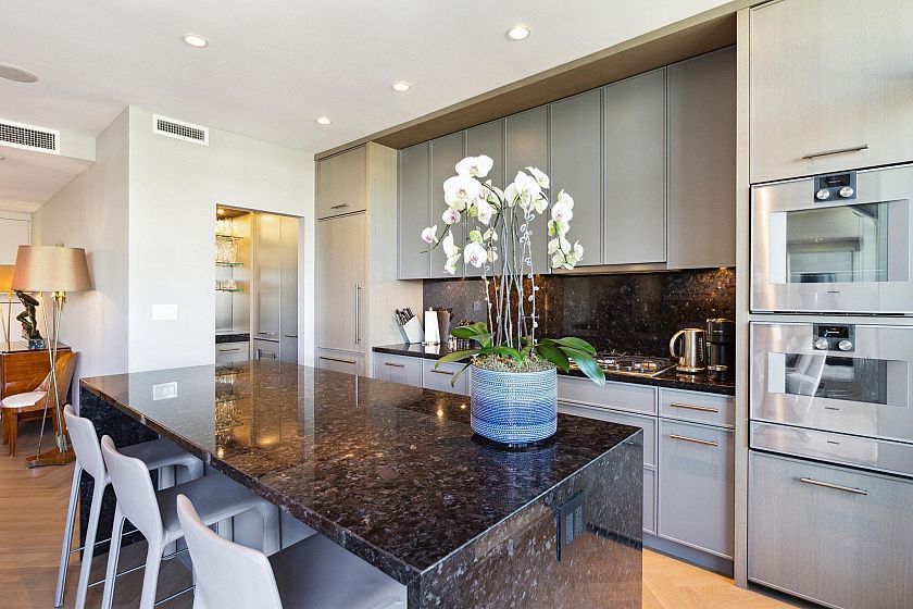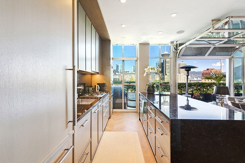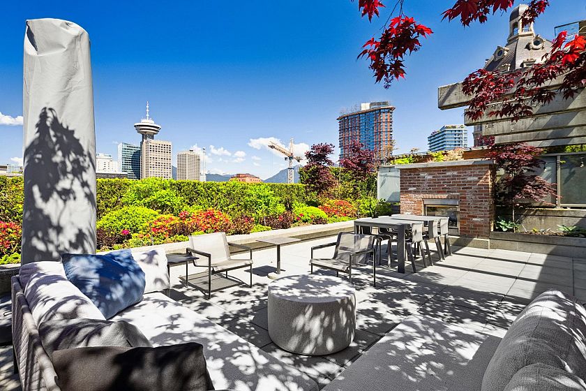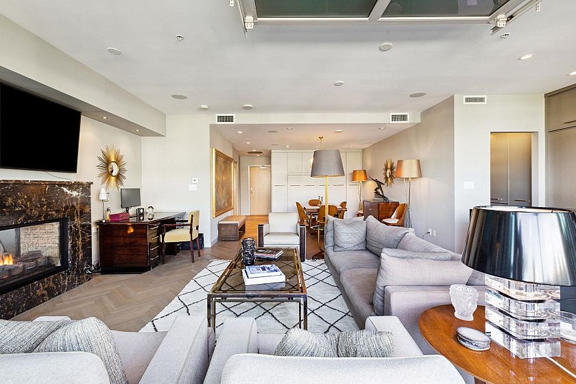 Experience elevated indoor-outdoor living at The Crane. This renovated sanctuary features a gourmet kitchen with Gaggenau/Subzero appliances, custom cabinetry, granite counters, and a wine fridge. A garage-style door opens to 300+ sq ft of patio space. Inside, herringbone oak floors and a Murphy bed offer style and flexibility. The second bath includes a steam shower, while the spacious primary boasts a marble fireplace and spa-like ensuite with soaker tub and marble finishes. The 600+ sq ft rooftop patio offers stunning North Shore and downtown views.