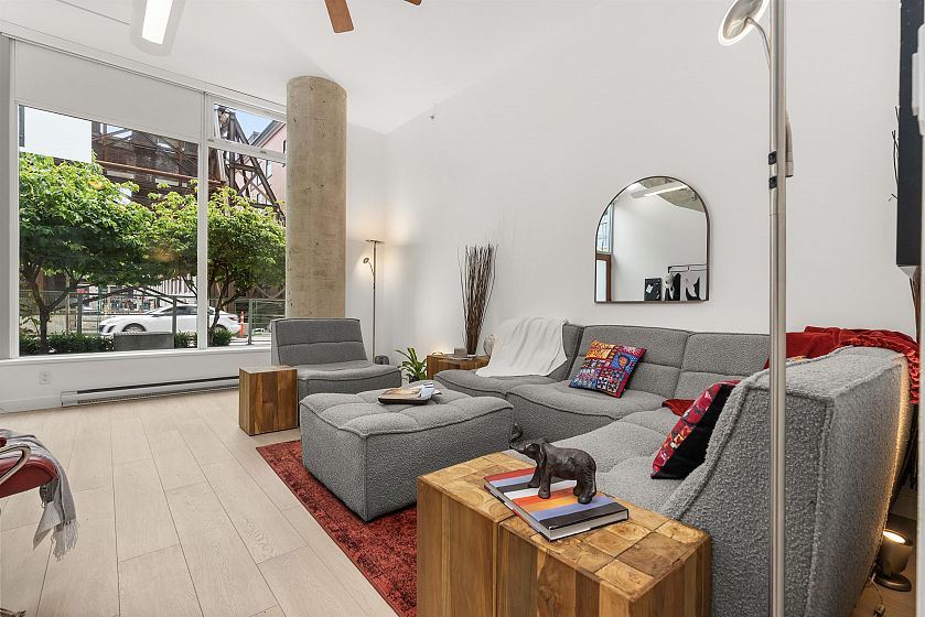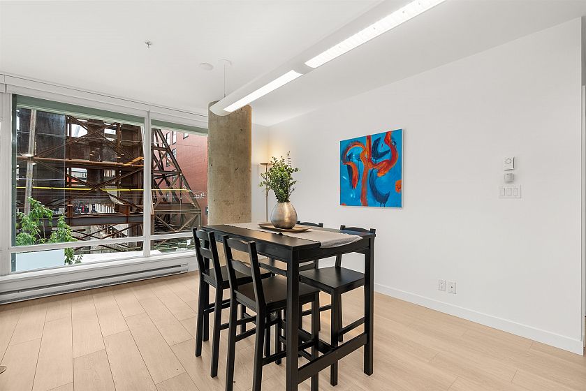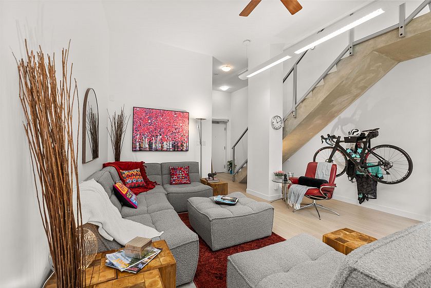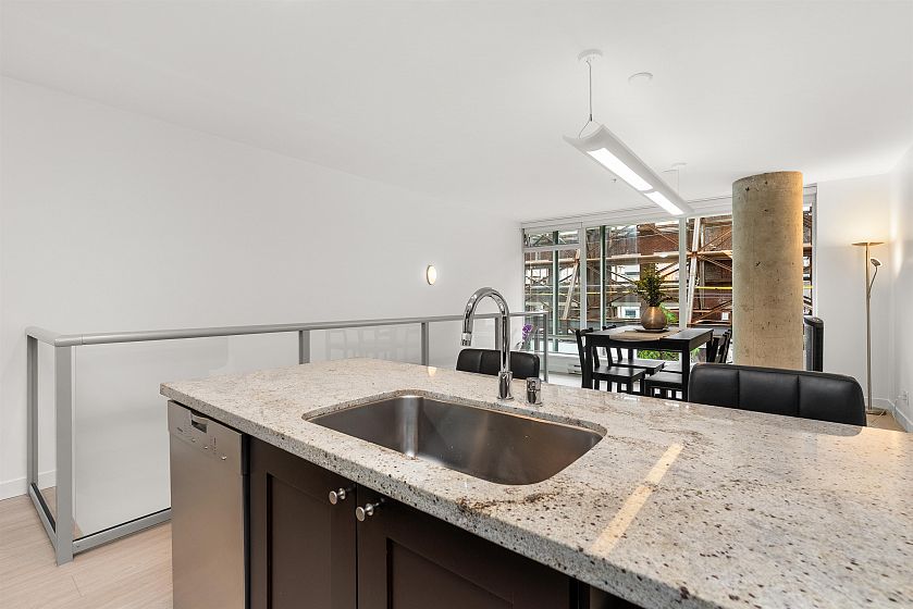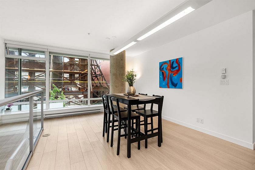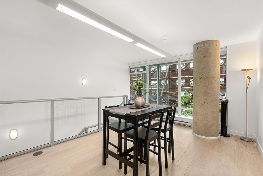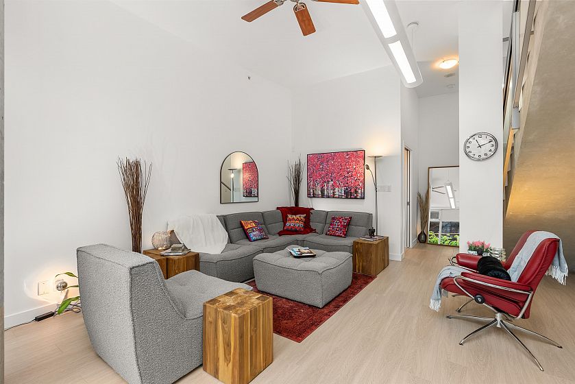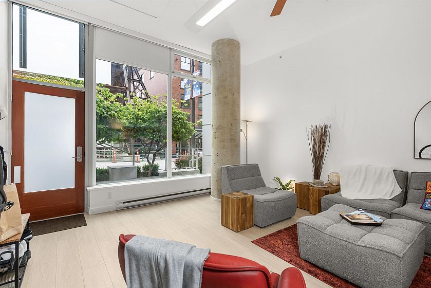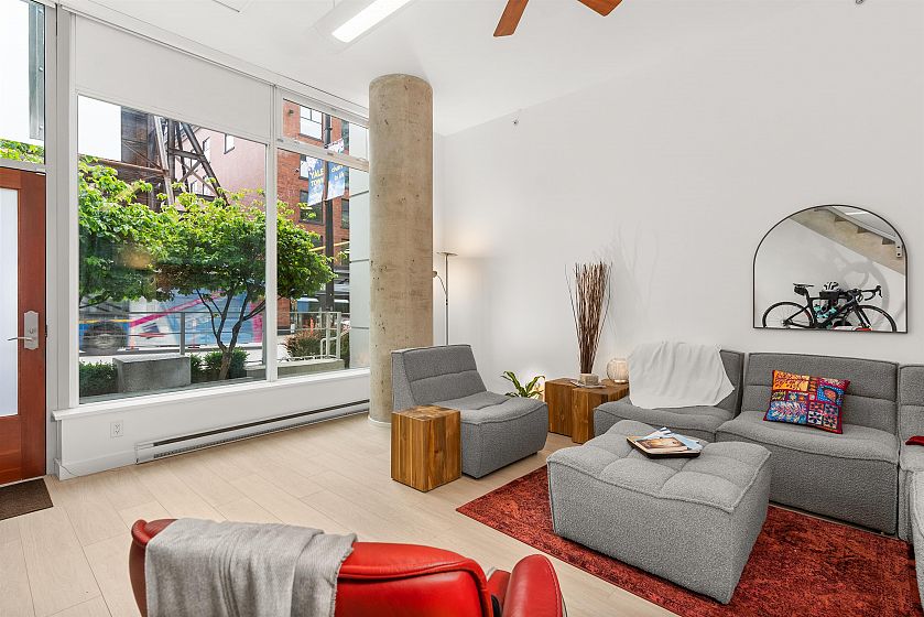 LIVE/WORK New York–style townhouse at Raffles...exceptionally rare! Offering 1 (or easily 2) bedroom, 2 bathrooms and 1183 sqft on the edge of Yaletown. The main level features soaring 13’ ceilings, floor-to-ceiling windows and a bright, flexible open space ideal for a studio, office, gallery or client-facing business. Upstairs is a private 1-bedroom suite with full bath, brand new washer/dryer, 9.5’ ceilings and a stylish kitchen with granite counters and breakfast bar. Recent updates include new laminate flooring, fresh paint and new blinds throughout. Each level has its own entrance — live upstairs and work below, or enjoy the whole home as a sophisticated urban residence. Proactive strata with concierge, one parking, and currently not subject to EHT. A truly unique offering!