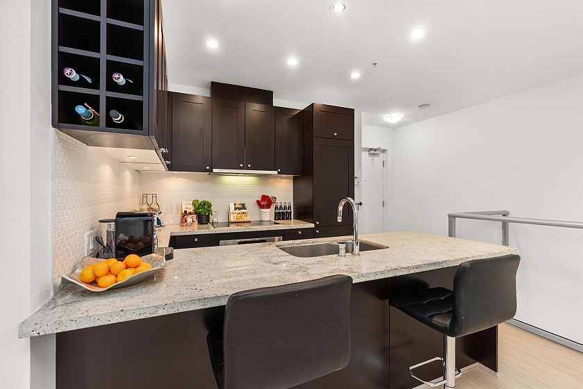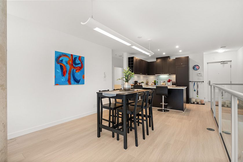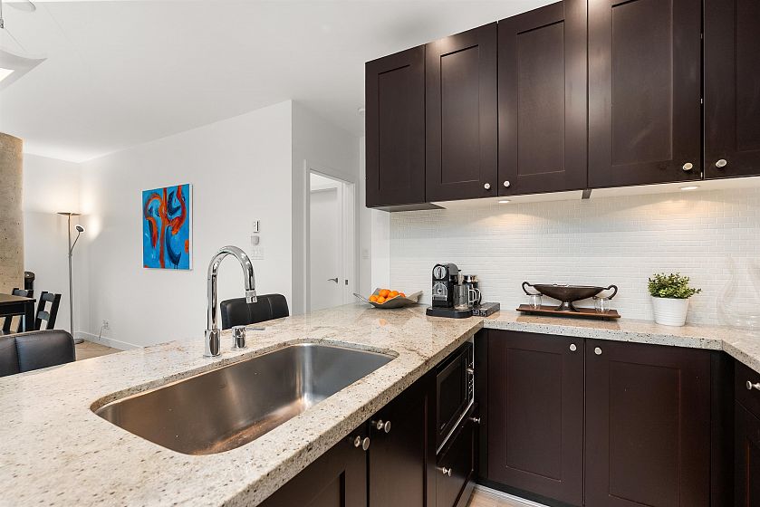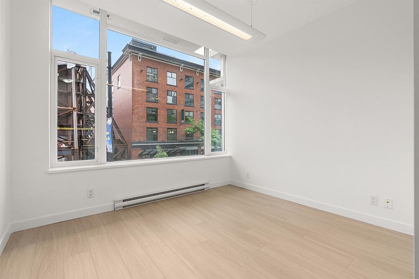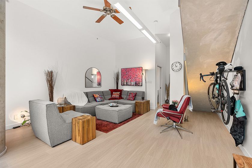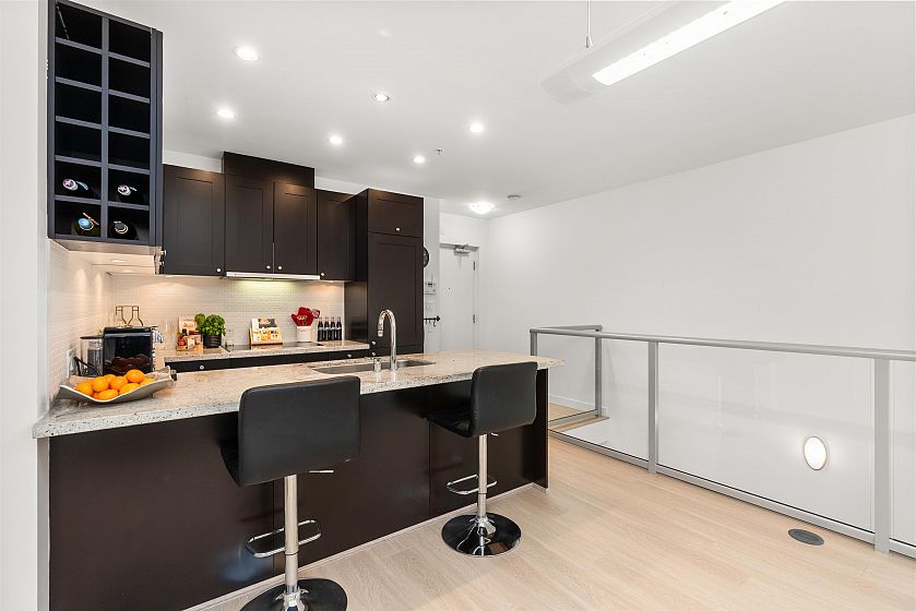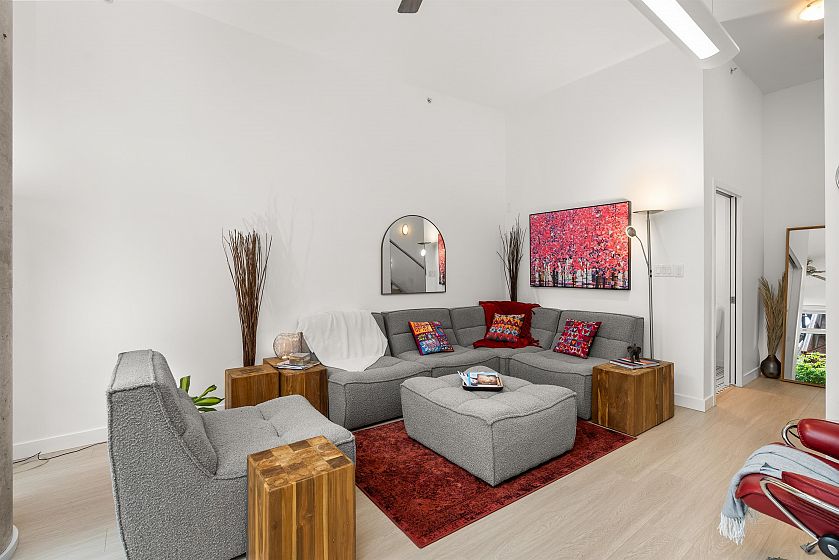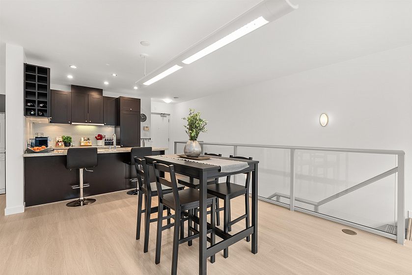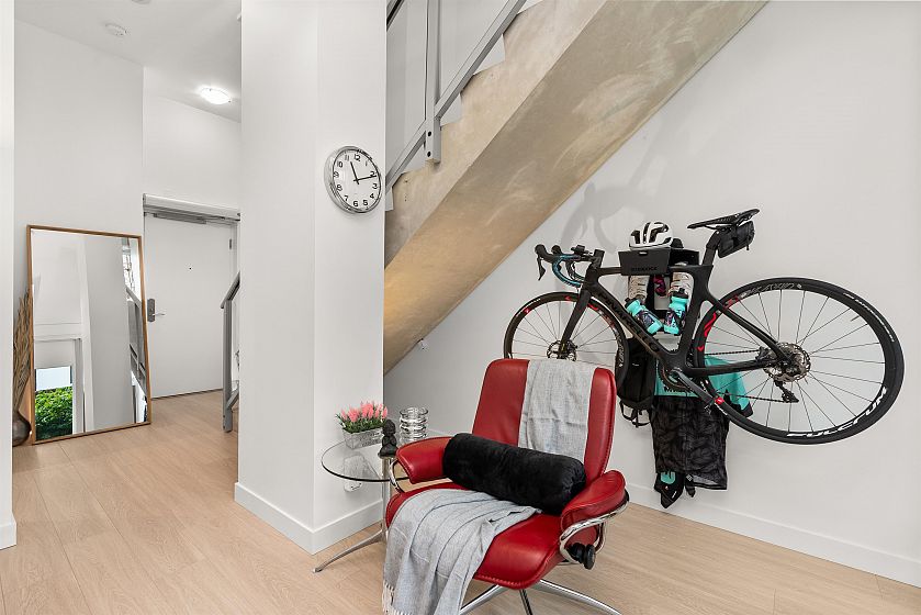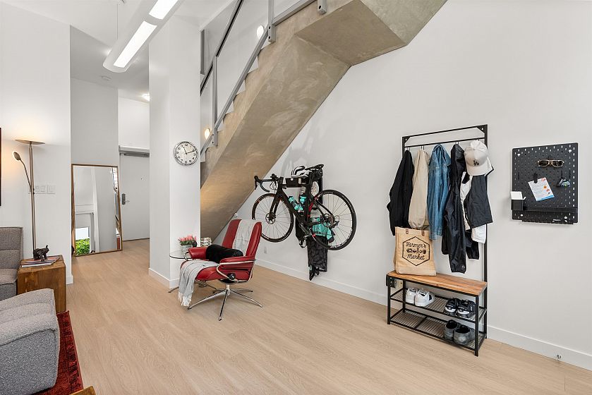 LIVE/WORK New York–style townhouse at Raffles...exceptionally rare! Offering 1 (or easily 2) bedroom, 2 bathrooms and 1183 sqft on the edge of Yaletown. The main level features soaring 13’ ceilings, floor-to-ceiling windows and a bright, flexible open space ideal for a studio, office, gallery or client-facing business. Upstairs is a private 1-bedroom suite with full bath, brand new washer/dryer, 9.5’ ceilings and a stylish kitchen with granite counters and breakfast bar. Recent updates include new laminate flooring, fresh paint and new blinds throughout. Each level has its own entrance — live upstairs and work below, or enjoy the whole home as a sophisticated urban residence. Proactive strata with concierge, one parking, and currently not subject to EHT. A truly unique offering!