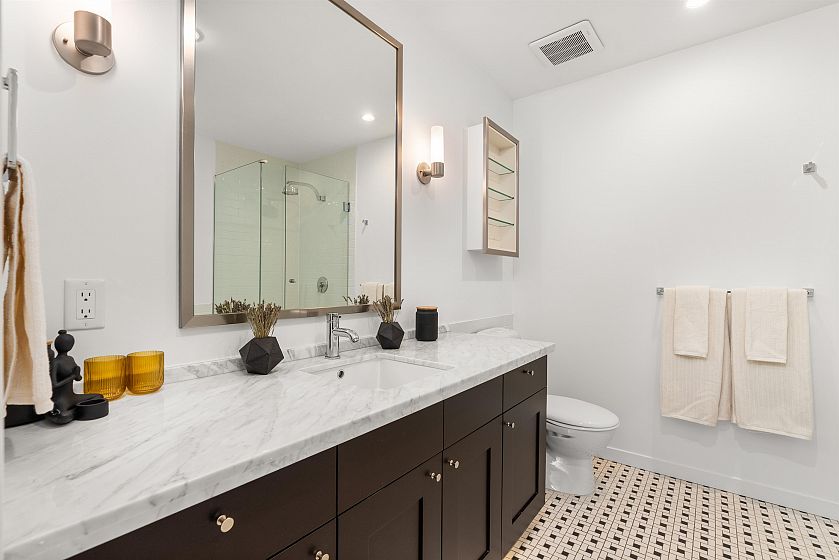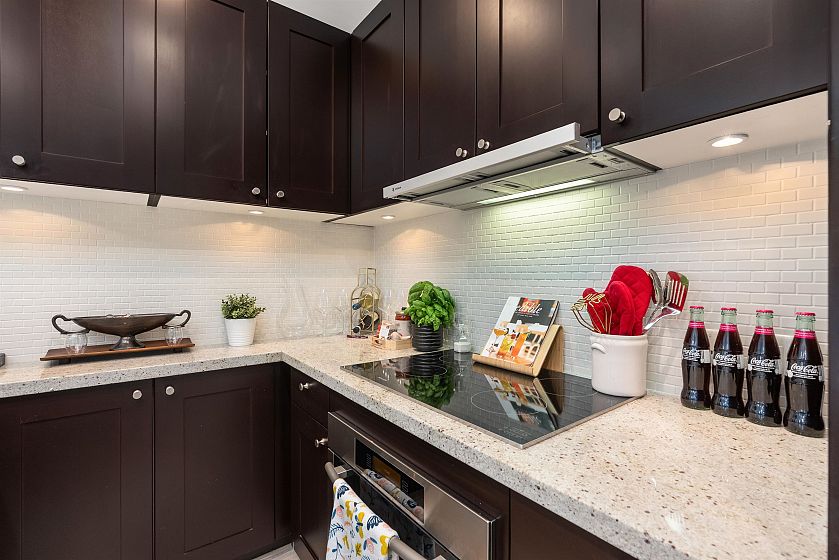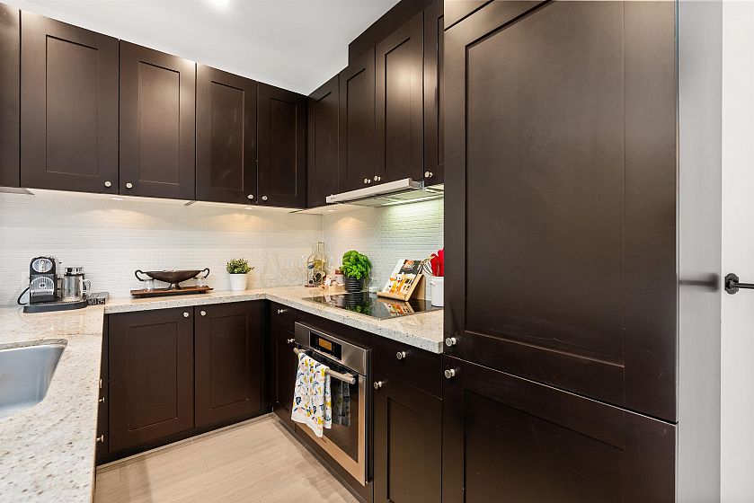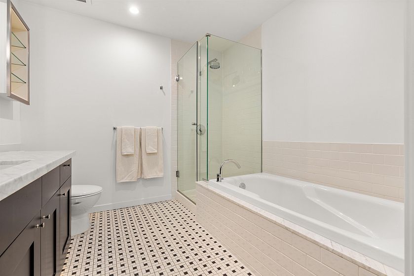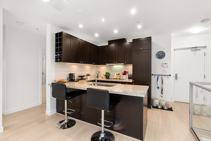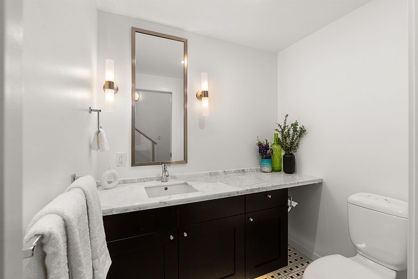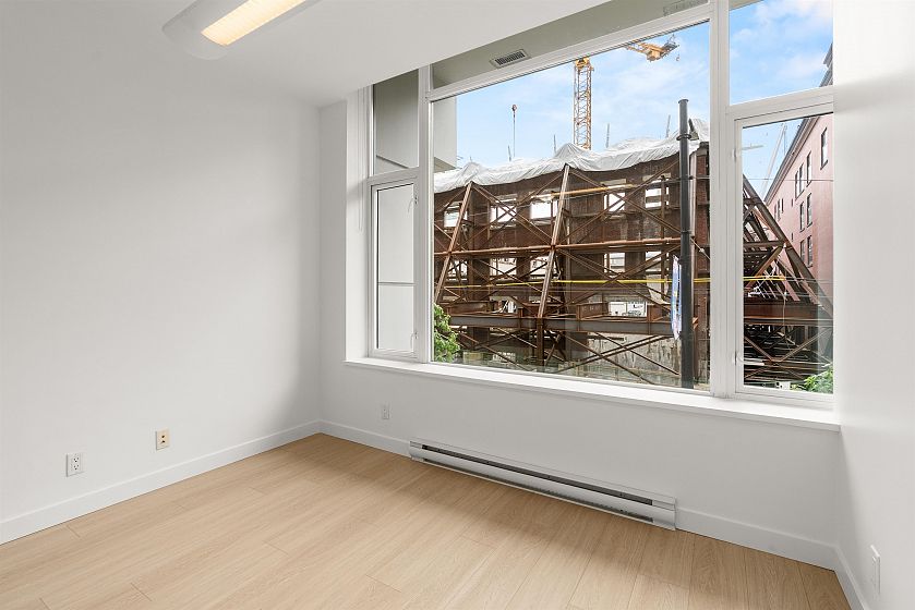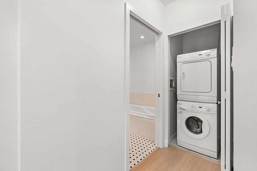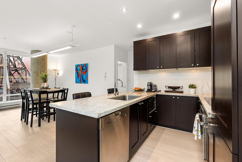 LIVE/WORK New York–style townhouse at Raffles...exceptionally rare! Offering 1 (or easily 2) bedroom, 2 bathrooms and 1183 sqft on the edge of Yaletown. The main level features soaring 13’ ceilings, floor-to-ceiling windows and a bright, flexible open space ideal for a studio, office, gallery or client-facing business. Upstairs is a private 1-bedroom suite with full bath, brand new washer/dryer, 9.5’ ceilings and a stylish kitchen with granite counters and breakfast bar. Recent updates include new laminate flooring, fresh paint and new blinds throughout. Each level has its own entrance — live upstairs and work below, or enjoy the whole home as a sophisticated urban residence. Proactive strata with concierge, one parking, and currently not subject to EHT. A truly unique offering!