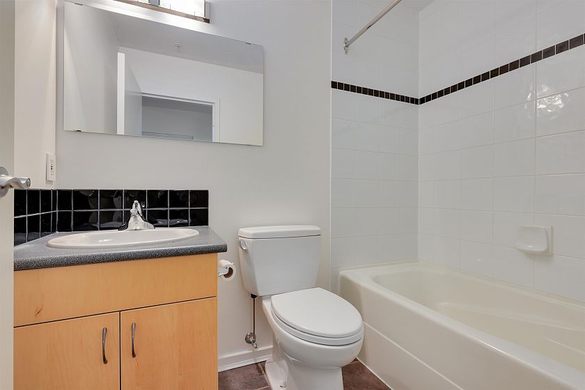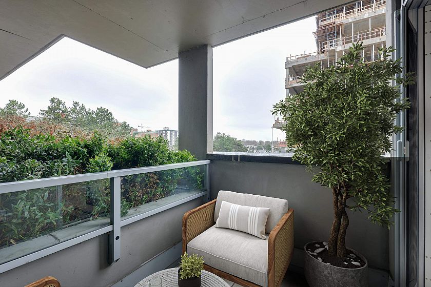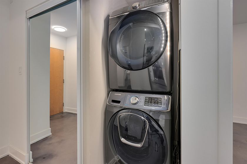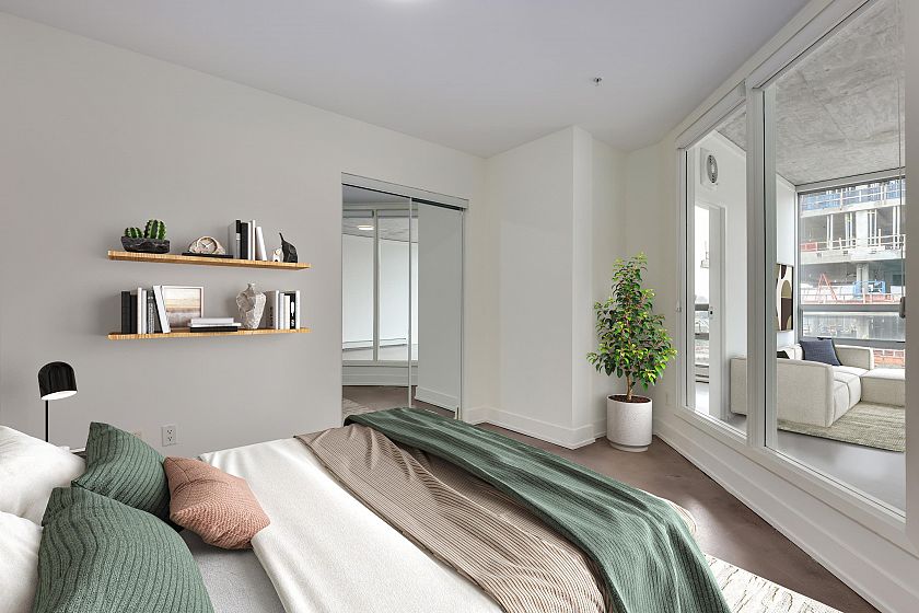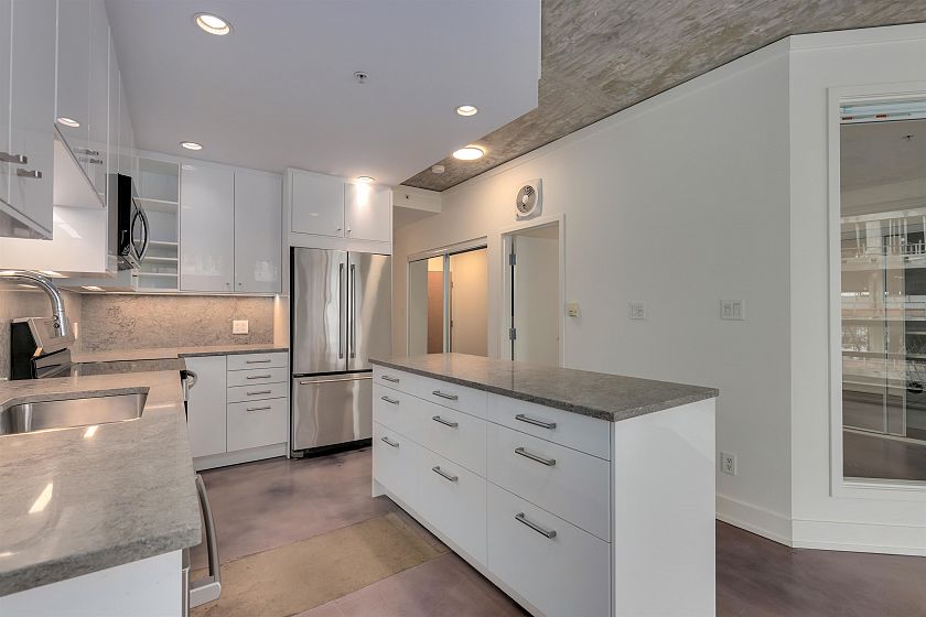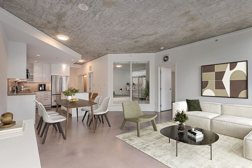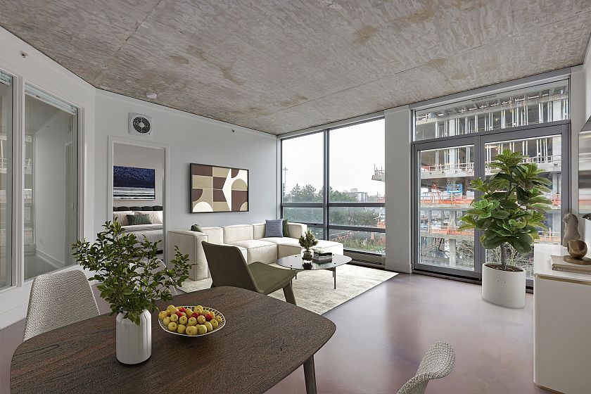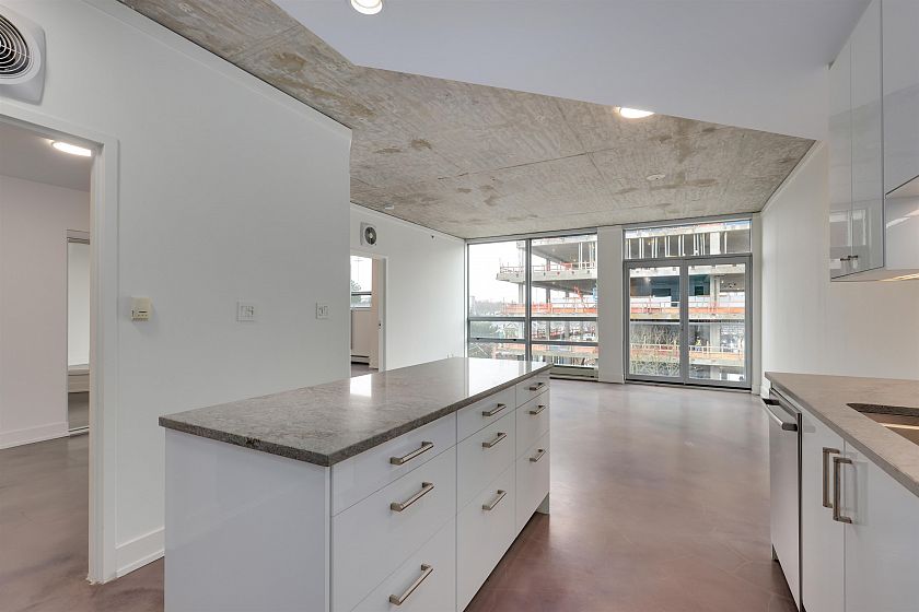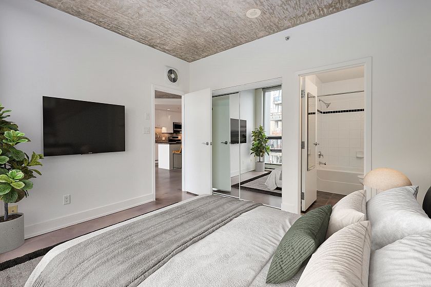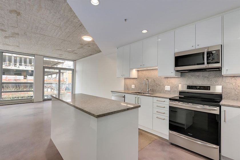 Discover this stunning 2-bedroom, east-facing, corner unit at "The Left Bank", boasting floor-to-ceiling windows and soaring 9’ concrete ceilings. Featuring an open-concept living space with polished concrete floors and modernized kitchen (complete with quartz countertops, stainless steel appliances, and custom tiling), the home exudes a modern and sophisticated vibe. The spacious bedroom, with its own private ensuite bathroom and patio, can easily accommodate a king-size bed. Enjoy the convenience of ample in-suite storage, laundry, and secure parking. Located in the heart of the new False Creek Flats Plan, this property offers easy access to the Seawall, Olympic Village, Skytrain, and future medical campus, with solid investment potential.