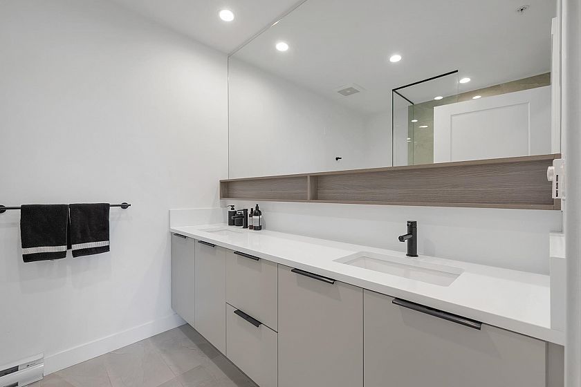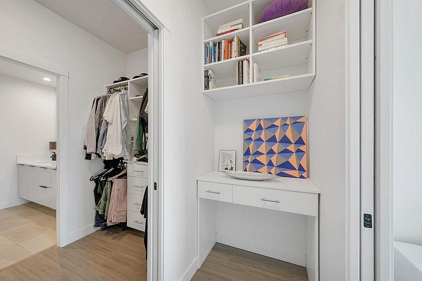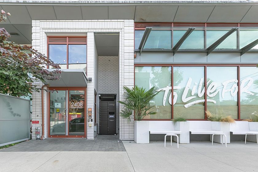 Welcome to Ella by Trillium, where lifestyle comes first! Gather with friends in the resident lounge, get inspired in the co-working space, or pop downstairs to the ground-level shops. Located steps from The Drive, with bike routes, transit, and highway access nearby, convenience is built in. This top floor 2 beds + den & 2 baths, features 9-ft ceilings, expansive windows, a modern kitchen with quartz counters, stainless steel appliances, & gas stove. Enjoy a bonus pantry, a welcoming dining area, spacious primary bedroom with ensuite, an office nook, & flexible second bedroom. The quiet east-facing balcony w/ gas hookup, perfect for morning coffee or evening BBQs. Added perks include pet-washing station, Modo carshare, 1 parking, 2 storage lockers, and a 2/5/10 warranty. OPEN Sun OCT 19th