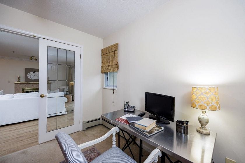 Warm & inviting ...this 55+ COMPLEX IS FOR YOU Top floor penthouse unit west facing to peek a boo ocean views and stunning mountain vistas. Freshly painted and new vinyl flooring enhance its spacious sunny rooms, One bedroom and 2nd space could be either a bedroom (complete with murphy bed, window and closet)or den. Comes with 2 parking stalls.gas fireplace and huge storage room. Fantastic location across from WV Seniors centre near library & shopping and so much more.