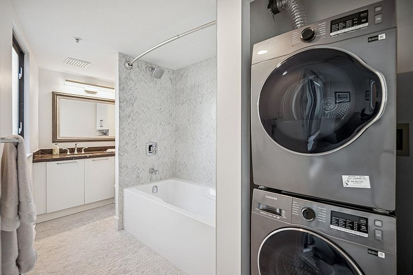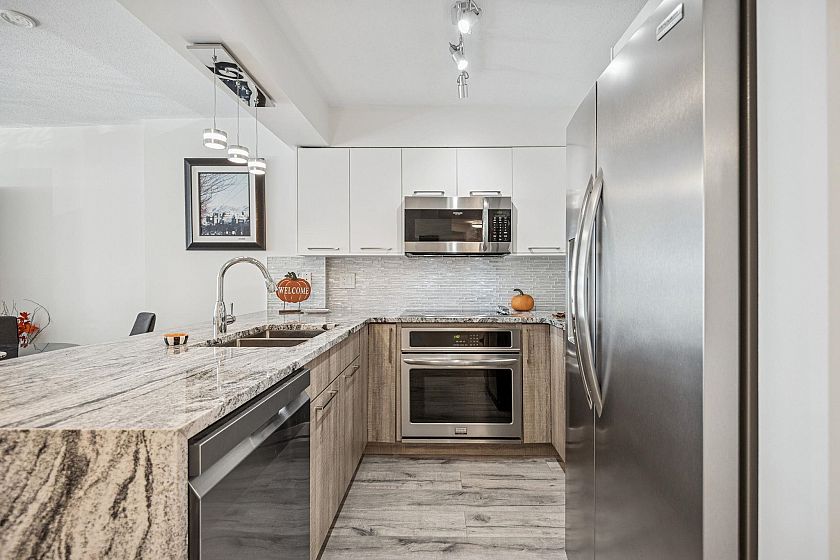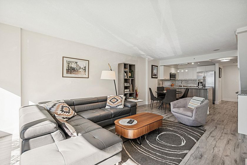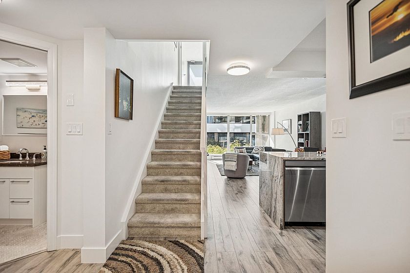 Completely renovated TWO LEVEL city condo with Mountain & City views. This 2 bedroom & flex, 2 full bathrm home features new kitchen with granite counters, fresh paint, vinyl flooring, roller shades, built-in wine fridge, custom tiling. 2 spacious bedrooms each with their own separate large balconies on 2 sides, north side has Mountain and City views, showcased by serene treed landscaping, south side has big sunny balcony off 2nd bedroom. Located on a quiet tree lined street on the top level with no one above. Steps to Broadway & Kits shopping, skytrain, entertainment. Building features a gym, sauna, bike rm, major renos done: exterior (2023), roof (2019), pipes (2012), hallways (2018). EV Charging. 2 PARKING, 1 storage locker. Pets & rentals allowed. OPEN HOUSE SAT/SUN OCT 11/12, 2-4 PM.