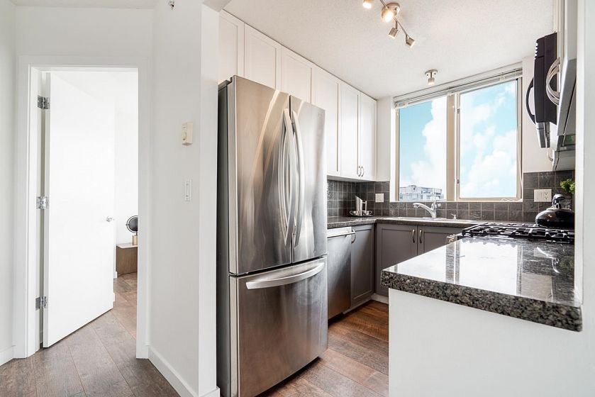 Luxury corner sub-penthouse with beautiful ocean, mountain, and city views at the posh “Compton”, a high-quality, concrete Polygon building located on a quiet tree-lined street in the highly-desirable South Granville area. Great layout includes 2 spacious bedrooms (primary bedroom accommodates king bed), 2 bathrooms + den + flex room, open-concept floorplan with gas fireplace. Bright kitchen features s/s appliances and granite counters. Situated just blocks to cafes, shops, theatre, and restaurants on Granville Street, and easy stroll to Granville Island and seawall. Nearby bus stops and coming-soon subway station. 1 parking (potential EV chrg). Pets: 1 dog or 2 cats allowed. Perfect for those seeking a very elegant home in a lovely walkable neighbourhood.