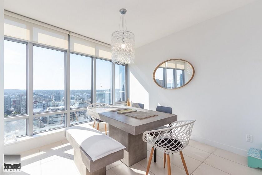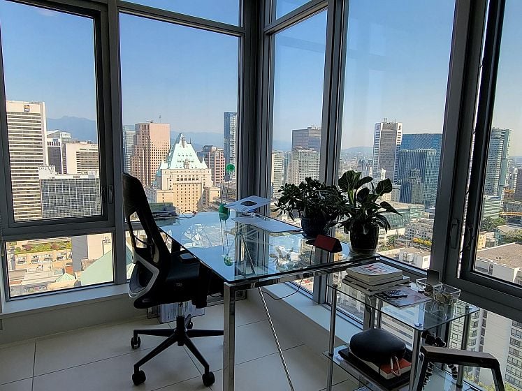 Dynamic city lifestyle at Patina, built by Concert Properties in 2011. NE Corner unit, which offers stunning, unobstructed views of the city skyline, sparkling waters, and majestic mountains. This 1,322 SF spacious 2-bedroom/Den/flex room with 2 parking stalls (S-b-S) features quality finishes and spacious living; geothermal heating, AC, 9 ft. high ceilings, Italian porcelain tile, brushed Oak floors, Miele appliances. Amenities: bike room, fitness centre, social room, party room, landscaped garden, playground, and Concierge. PATINA building situated adjacent to the Robert Lee YMCA at the heart of Downtown Vancouver, an unbeatable location to restaurants, shopping, museum, theatre, parks, and all kinds of entertainment. Walk & Transit Score 100, Bike Score 91!