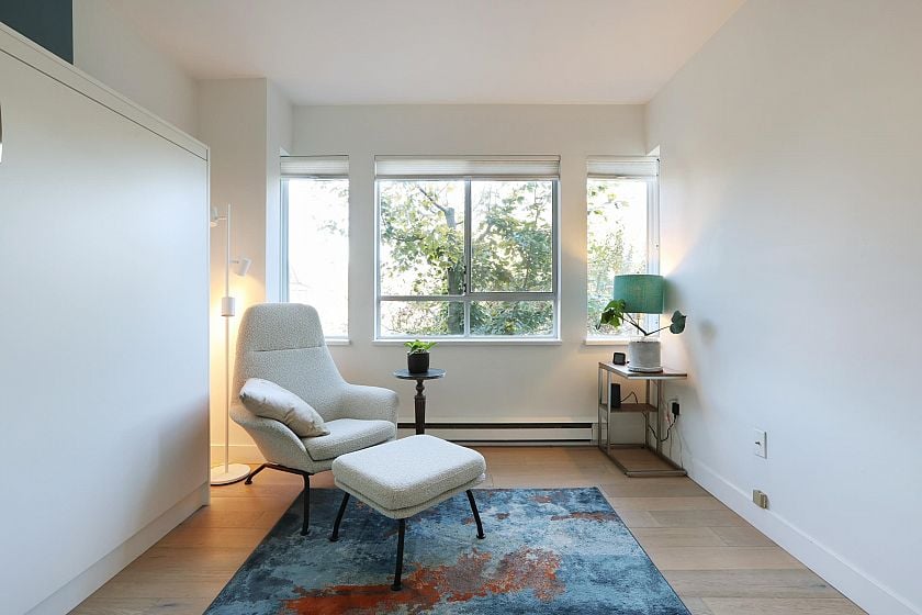 Exceptional Value! This beautifully renovated, quiet 1,100 sq. ft. 2-bedroom, 2-bathroom plus den (easily a 3rd bedroom) view home offers the perfect blend of comfort and functionality for families or downsizers alike. Enjoy a true house-like feel with a welcoming courtyard entry, spacious rooms that fit full-sized furniture, and an ideal open layout. Features include a large kitchen with built-in oven and cooktop, generous primary ensuite, ample storage, and a large covered balcony. Soak in city and mountain views from every room. This rainscreened building is well maintained. Walk score 99! Two pets welcome. Parking and storage locker included. 1st showings Thurs Oct 16 from 5-6pm. Open Sat/Sun Oct 18/19 from 3-4pm.