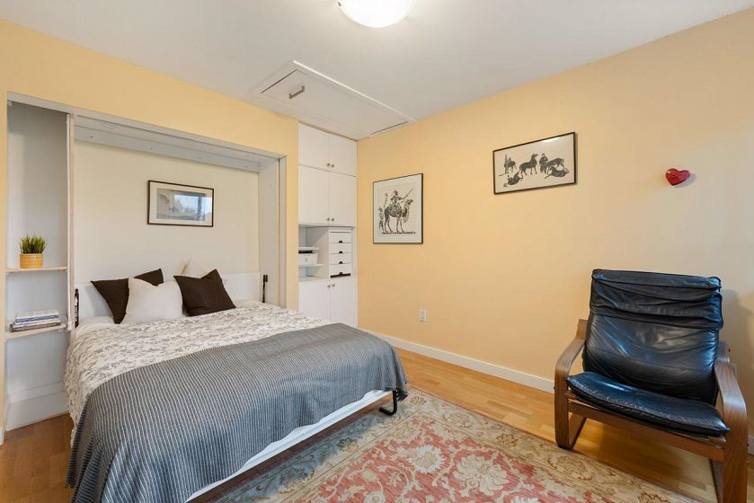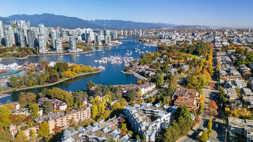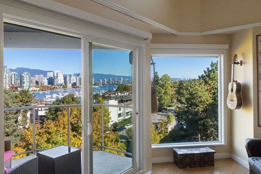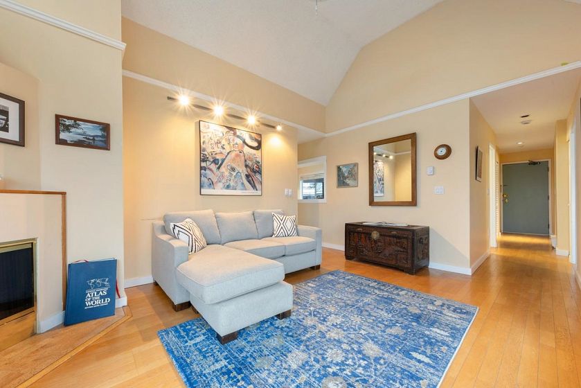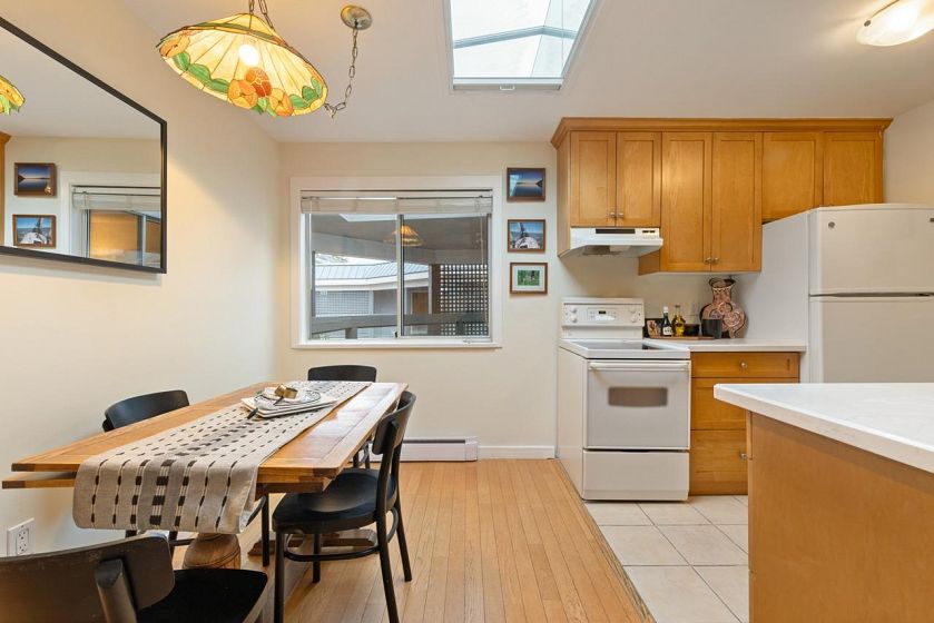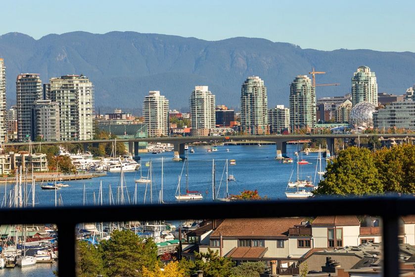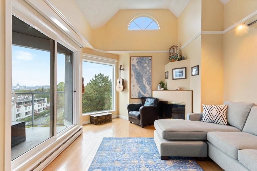 Discover top-floor living at Granville Island Village, where comfort and location align. This bright and airy 2-bedroom, 1-bath quiet corner penthouse showcases unobstructed views of False Creek, the city skyline, and the North Shore mountains. Oak hardwood floors flow throughout the home, while the living area boasts vaulted ceilings and a distinctive half-moon window, anchored by a wood-burning fireplace. The spacious primary bedroom provides plenty of room to relax, while a large skylight fills the dining area with natural light. Enjoy peaceful mornings or vibrant sunsets from your private balcony overlooking the water, and extra storage in the nearly 300 sq ft attic. In a well-maintained, recently rainscreened building, this is Vancouver living at its best.