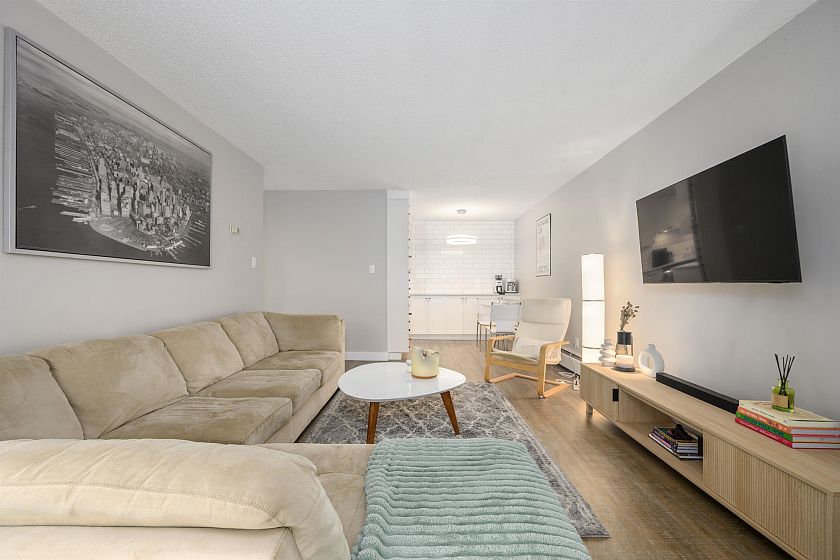 Rare ground level condo w/ great outdoor space in Lower Lonsdale! This 2 bedrm, 2 bathrm, 869 sqft home is beautifully updated, & enjoys superior outdoor space w/ a private, fully turfed patio – ideal for entertaining or pet owners. The home showcases a fully updated living space featuring new vinyl flooring, kitchen w/ solid wood cabinets, quartz counters, S/S appliances, & tiled back splash that extends across the back wall for added counter space & storage. Can’t forget about the cozy gas FP w/ new surround, spacious living rm w/ private outlook to the patio, large primary w/ 2 pc ensuite, & lots of storage. The home comes w/ 1 parking, storage locker, has in suite laundry, allows bbqs, & 1 cat or dog (any size!). Steps to everything Lower Lonsdale, you can't beat this one!