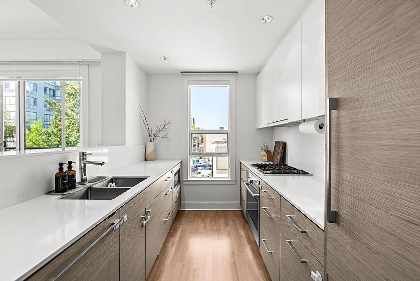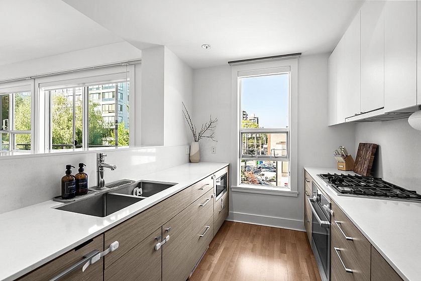 Perfect lifestyle for downsizers or growing families at Kerrisdale Gardens. BRIGHT & SPACIOUS 2-bed+den CORNER home w/ OVERHEIGHT ceilings, floor-to-ceiling windows, A/C & TWO private balconies overlooking stunning green canopy & North Shore mountains. Open chef’s kitchen w/ custom European-style cabinetry, quartz counters, gas cooktop & integrated appliances. Open plan flows to dining w/ built-in shelving & airy living space perfect for entertaining. Primary bed w/ SPA-LIKE ensuite featuring marble vanity & glass shower. Flexible 2nd bed+home office/den ideal for WFH. Boutique building steps to Arbutus Greenway, Kerrisdale’s best restaurants, cafes, parks & top schools (Point Grey & Quilchena). Easy access to UBC & downtown. EV Parking & Storage. Pets OK. Low-maintenance luxury living.