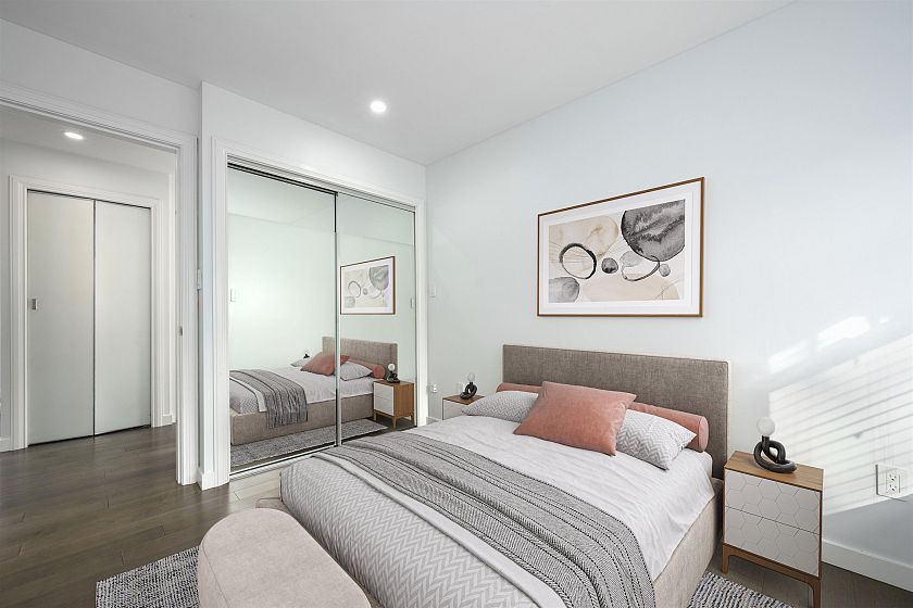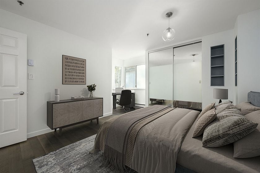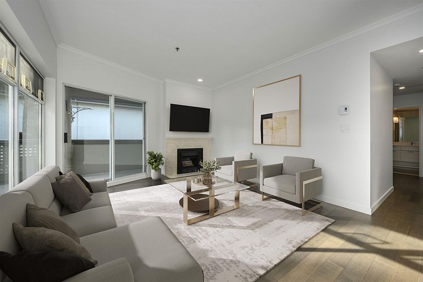 NORTH OF 4TH – Stunning TOP FLOOR CORNER 2 Bedroom home nestled on a quiet, tree-lined street. Fully renovated with an open kitchen featuring quartz counters & stainless steel appliances. Bright & airy with 9' ceilings, hardwood floors, spacious living/dining areas & cozy gas fireplace. Bright SW exposure fills the home with natural light and extends to a large wraparound deck showcasing peek-a-boo mountain views. King-sized primary suite with spa-inspired ensuite incl. rain shower, soaker tub & heated floors. Large 2nd bedroom offers ample comfort plus custom built-ins in all closets for extra storage. Includes 1 parking, 1 locker & in-suite laundry. PET-FRIENDLY building in unbeatable Kitsilano location—steps to W 4th shops, cafes & a short stroll to the beach!