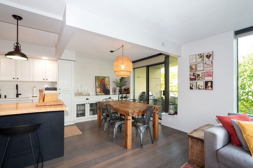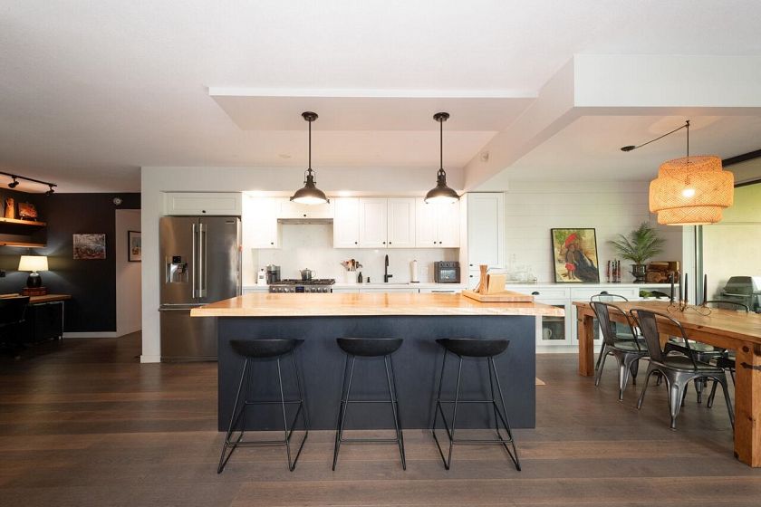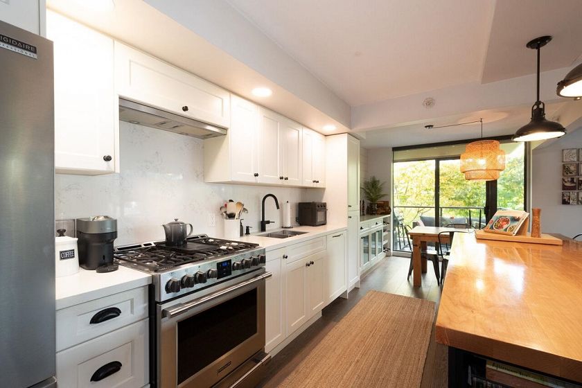 This beautifully renovated 1,214 sq.ft. corner residence showcases floor-to-ceiling windows, sophisticated finishes, and an exceptional open layout. The 2-bedroom, 2-bathroom plus office design offers seamless flow between the chef-inspired kitchen—featuring a solid wood island and gas range—and the bright living area that opens to a private balcony. The primary suite impresses with generous closets and a spa-like 5-piece ensuite. Two secure parking stalls (one oversized) and a storage locker add convenience. Enjoy concierge service, fitness and meeting rooms in this boutique concrete building. Perfectly positioned beside Victoria Park and moments from Lower Lonsdale’s fine dining and waterfront amenities. Pet and rental friendly.