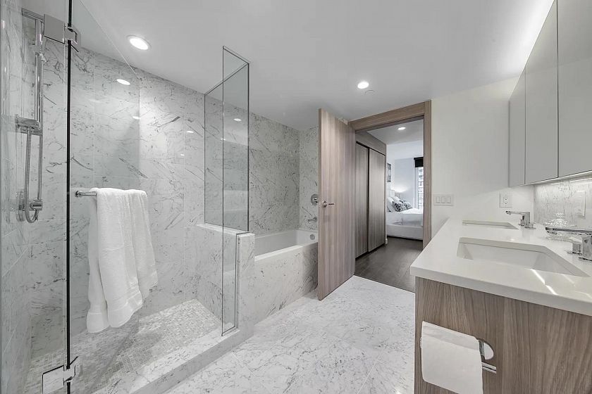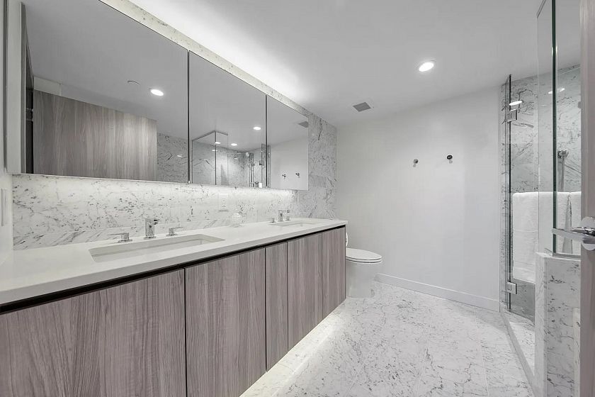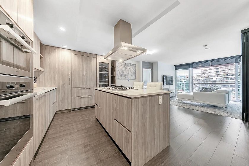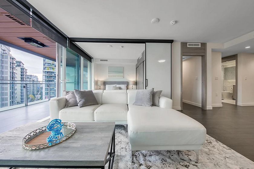 BEST Value in Avenue One. Rare park front property with spectacular views of False Creek. This home comes fully furnished and ready to move in. 2 bedroom, 2 full baths + den with over 210 sqft fully equipped Outdoor living room featuring outdoor solar shades, porcelain tile flooring, gas outlet, hose bib and wood look soffit ceiling with heaters for year round enjoyment. Integarated wood panels in the gourmet kitchen with SS Miele appliances, gas stove, quartz counters. Mstr with 5 piece ensuite and 2 closets with organizers. Extras include A/C , Smart thermostats to optimize energy efficiency, full size washer & dryer, remote to control outside shades, parking stall with EV.
