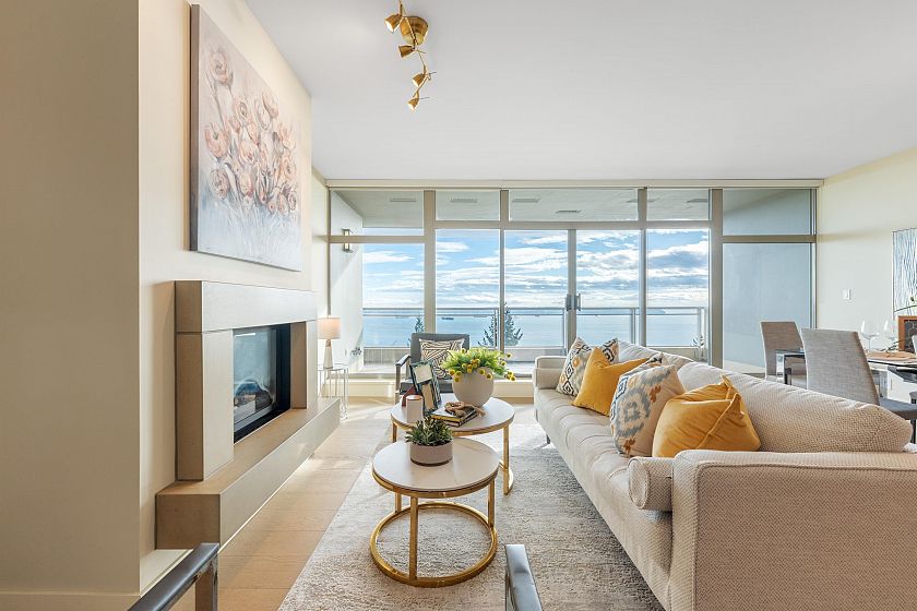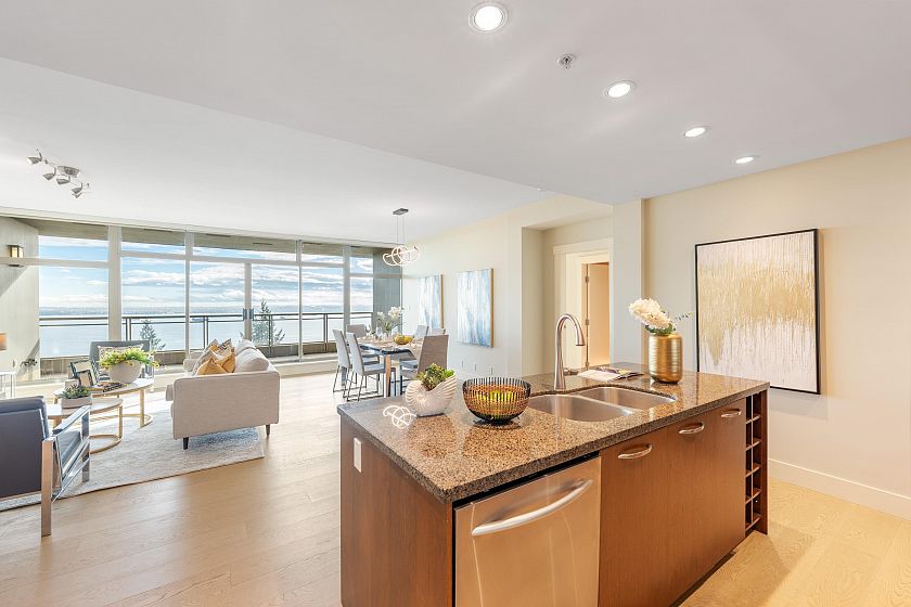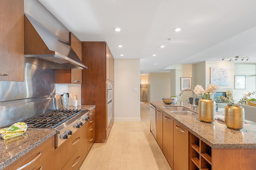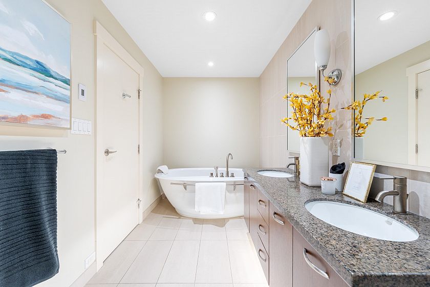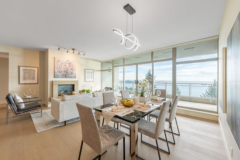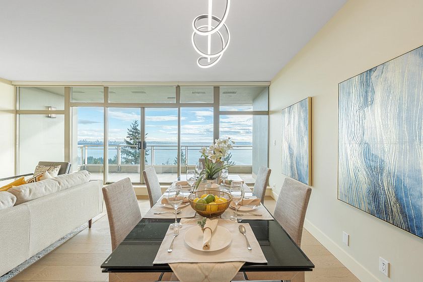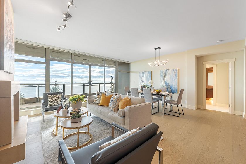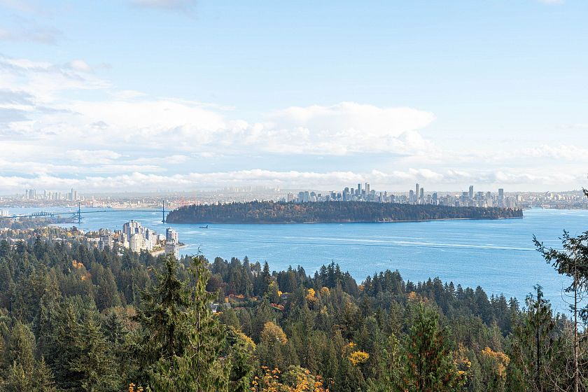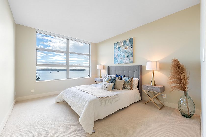 Panoramic Ocean, English Bay, Stanley park, DT and City views Unit in the StoneCliff-a luxury complex on 10 private acres! This South-Facing 2bdrm+2 full bathroom+1 open den has bright, open-design floor plan and comfortable living size with 9’ ceiling. Relax in the living, dinning and family rooms all while overlooking the sky-blue ocean. Stretching from the magnificent Mt. Baker, to the lush green Stanley Park, blending into the elegant English Bay, and flowing into the vast limitless Pacific Ocean. A gourmet kitchen with 6 burner gas stove, stainless steel appliance package. solid 7' Maple entry door, solid core interior doors, wall mounted cabinetry. New hard flooring in the living area and new painting. The Unit has built in AC Private 2 S/S car garage. O H NOV 2, 2-4PM