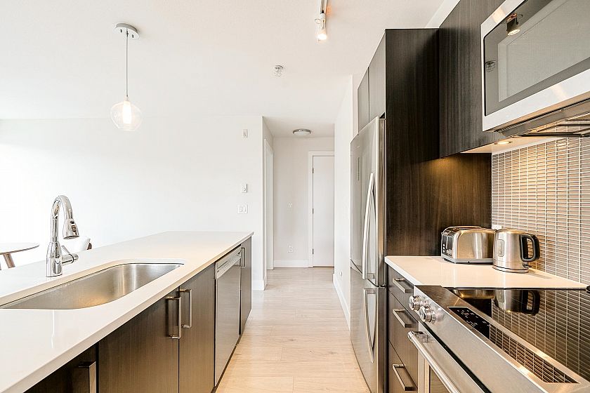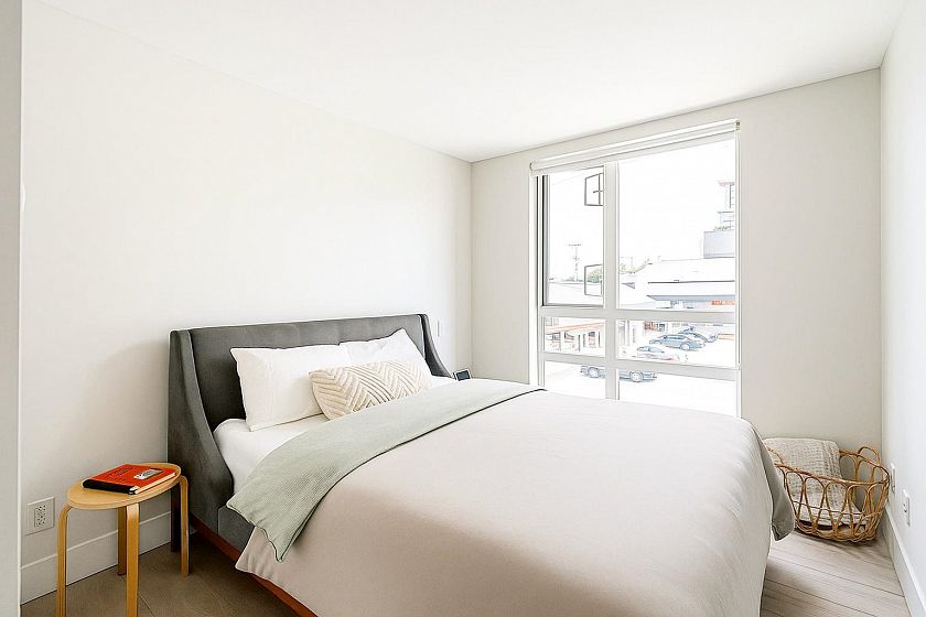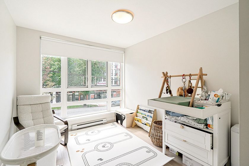 Welcome to this beautiful, well-designed 2 bed, 2 bath CORNER SUITE in MIDTOWN, a quality boutique building located in the heart of vibrant Mount Pleasant. This Home showcases a truly functional layout. Experience open-concept living as principal rooms of Kitchen, Dining, & Living flow seamlessly, enhanced by floor-to-ceiling windows allowing abundance of natural light in. Kitchen offers stainless steel appliances, quartz countertops, breakfast bar & modern cabinetry w/ ample built-in storage & covered balcony. Bedrooms expertly separated for privacy. Primary Bedroom fts. ensuite & closet organizers. Radiant in-floor heating for bathrooms. Steps to cafés, groceries, restaurants, shops, parks, & transit. 1 Parking & 2 Storage included. Rentals & Pets allowed. Book your showing today!