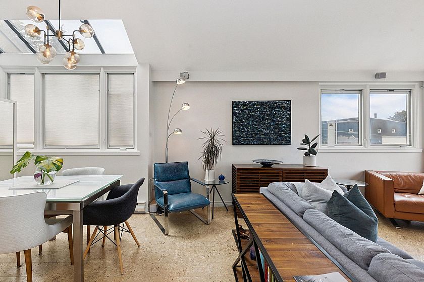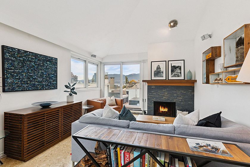 Kitsilano Living at its best, steps to Kits Beach, cafes, restaurants & bars almost perfect 95 walk-score! Beautiful, bright & open 2 bed + loft. Unit features over-height ceilings, skylights, wood-burning fireplace, dual balconies w/ stunning water & mountain views. Updated kitchen with oak cabinets, stone counters/ ss appliances. Primary bedroom with ensuite & walk out balcony. The Bright, glass clad open loft space, perfect as an office/den or guest room with sweeping views and abundant natural light. Building is well run with full envelope (roof, windows, cladding all replaced (2014/2015) Unit comes with 1 parking & storage locker. Pets ok (w/restrictions), rentals ok. Open Saturday Nov 6th 12:30-2pm