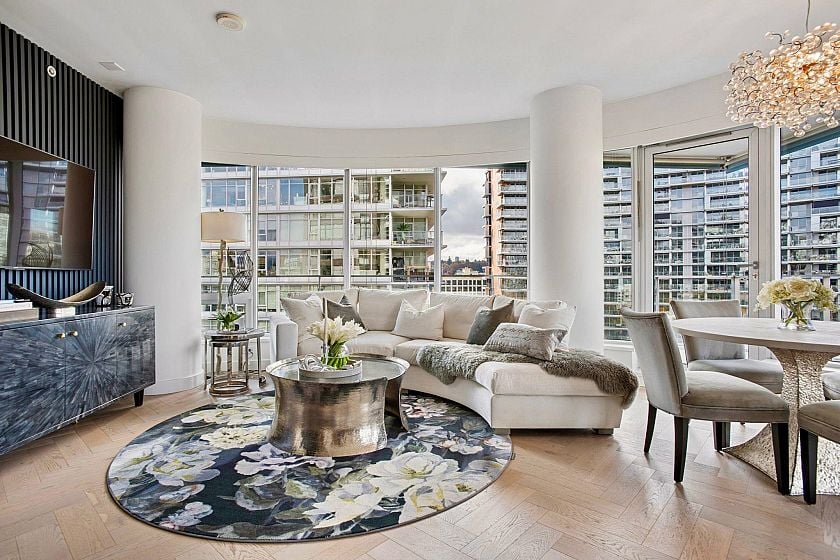 This stunning corner home in Olympic Village combines high design with everyday comfort. Curved floor-to-ceiling windows frame sweeping views of False Creek, city skyline & park space, while herringbone floors, feature-wall millwork & custom wallpaper bring refined character throughout. The open layout flows from the chef’s kitchen—Eggersman cabinetry, quartz counters, Miele/Sub-Zero appliances—to a bright living area opening to a spectacular 380+ sq ft terrace for entertaining. A large den offers flexible use, & bedrooms are perfectly separated for privacy. Enjoy Gold Medal Club access, fitness centre, lounge & concierge. Includes 2 parking with EV, & 2 lockers. Steps to the Seawall, cafés & shops—this is Olympic Village living at its best. ***OPEN HOUSE SAT 2-4PM***