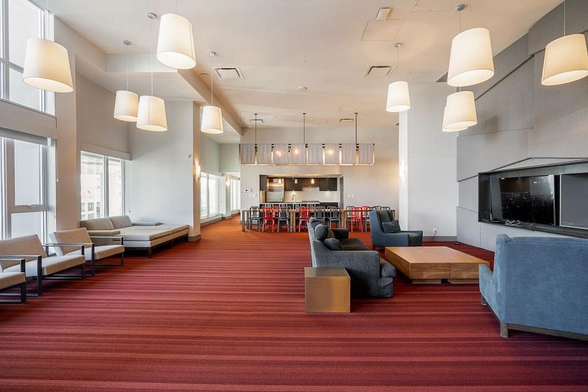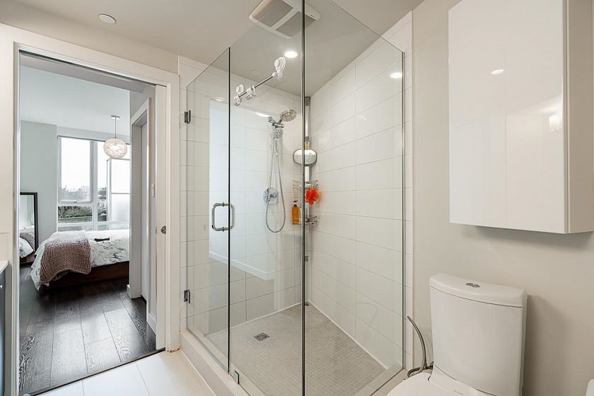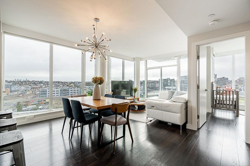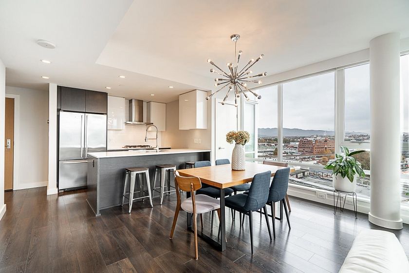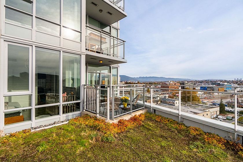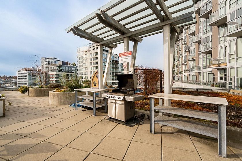 Podium-level corner 2bed/2bath + den unit at Central w/ an abundance of natural light & expansive east & south views, A/C & large patio ideal for entertaining. Unit backs onto rooftop terrace common area, extending your outdoor space. Spacious layout fits full-size dining table, 4 stools at island, large primary (dbl sinks, walk-in shower), 2nd bath newly reno’d. Custom in-suite storage (den). High-end finishings incl. JennAir appls, gas cooktop, wrap-around windows, beautiful flooring. Building offers 7,000 sqft wellness centre: gym, yoga, party/theatre/dining rooms w/ pro kitchen, steam/sauna, rooftop garden. Steps to Olympic Village shops, SkyTrain, & Seawall. 1 pkg, 1 locker, 1 bike locker. Open house 1 -3pm, Sat/Sun November 8/9