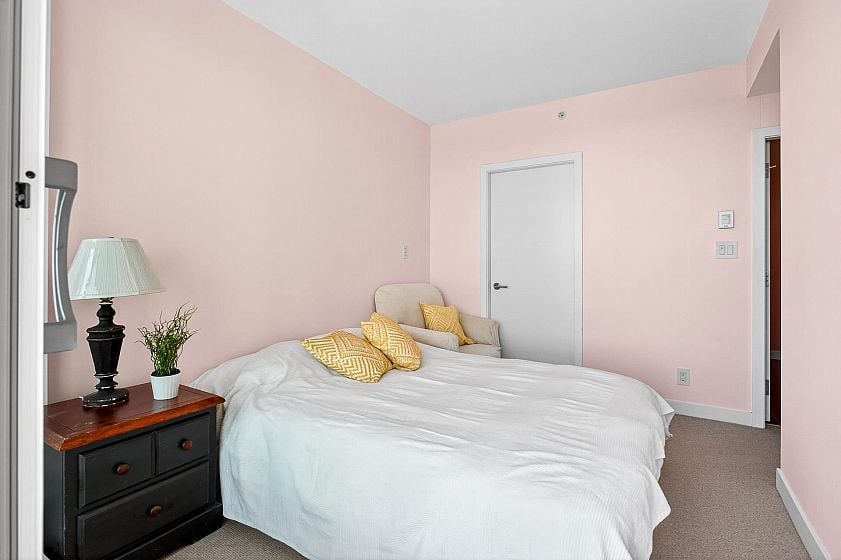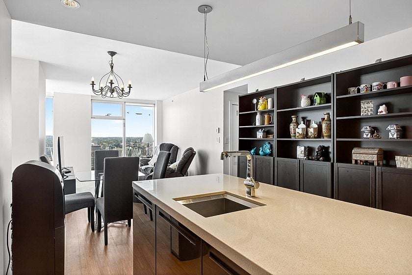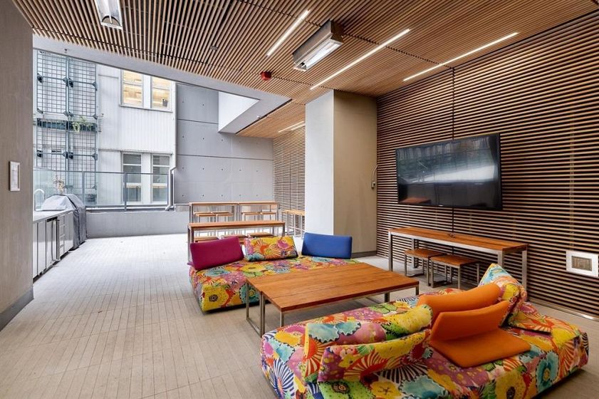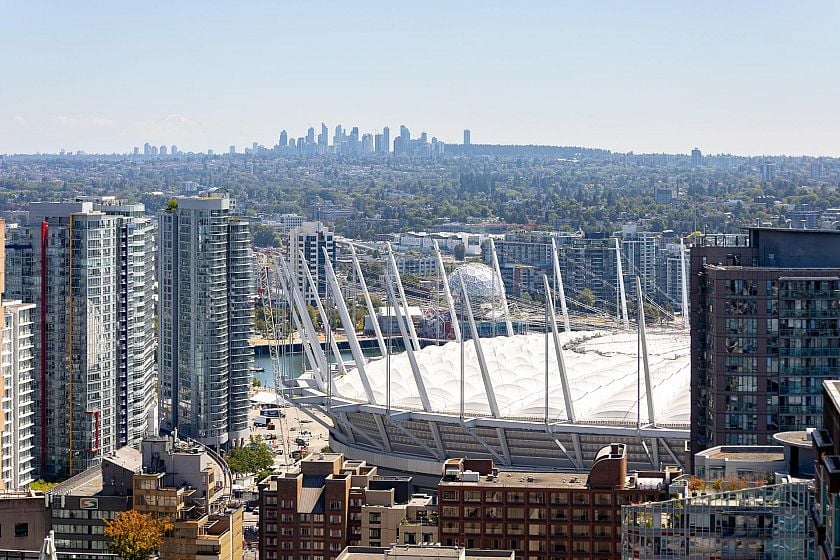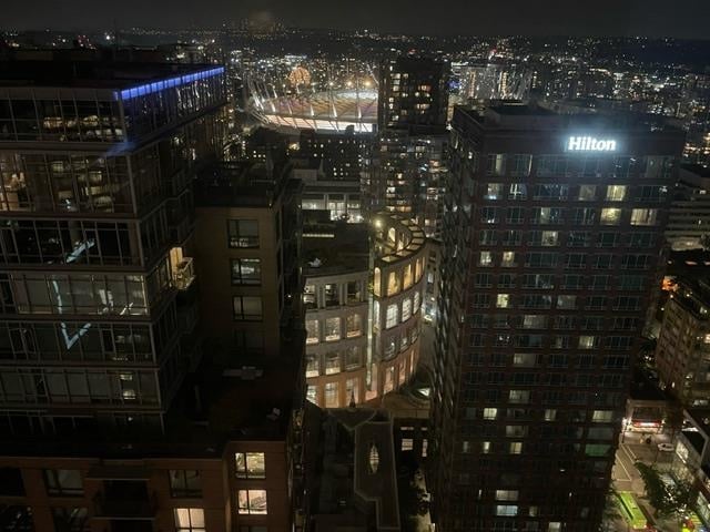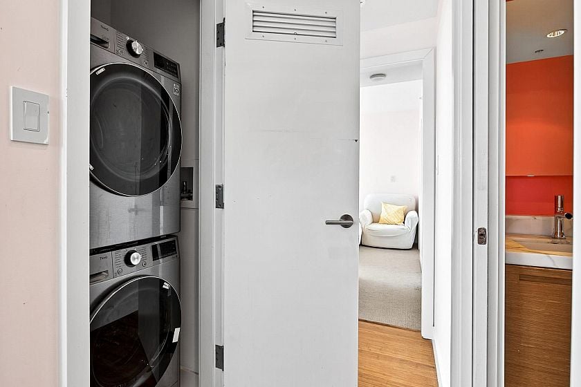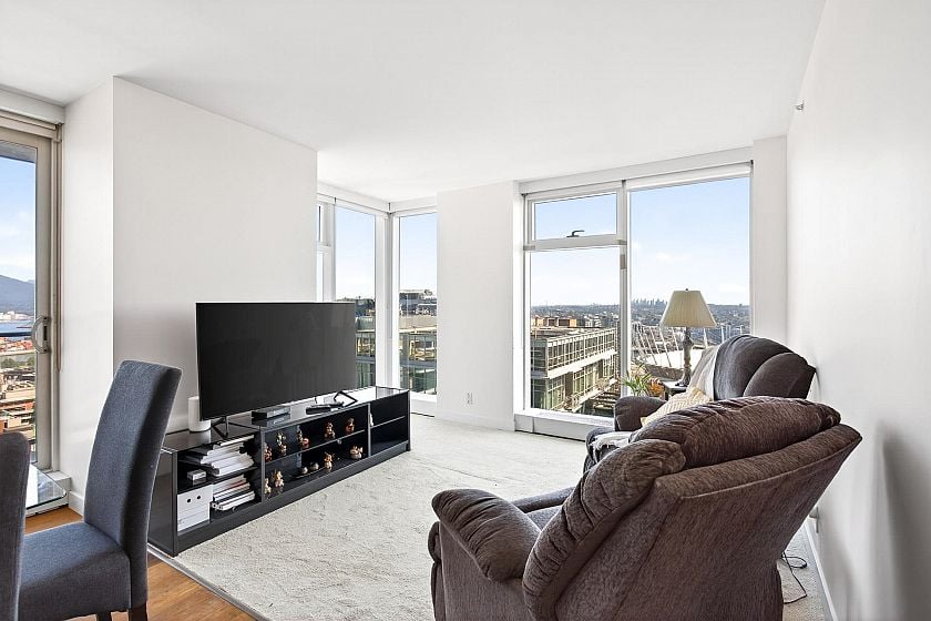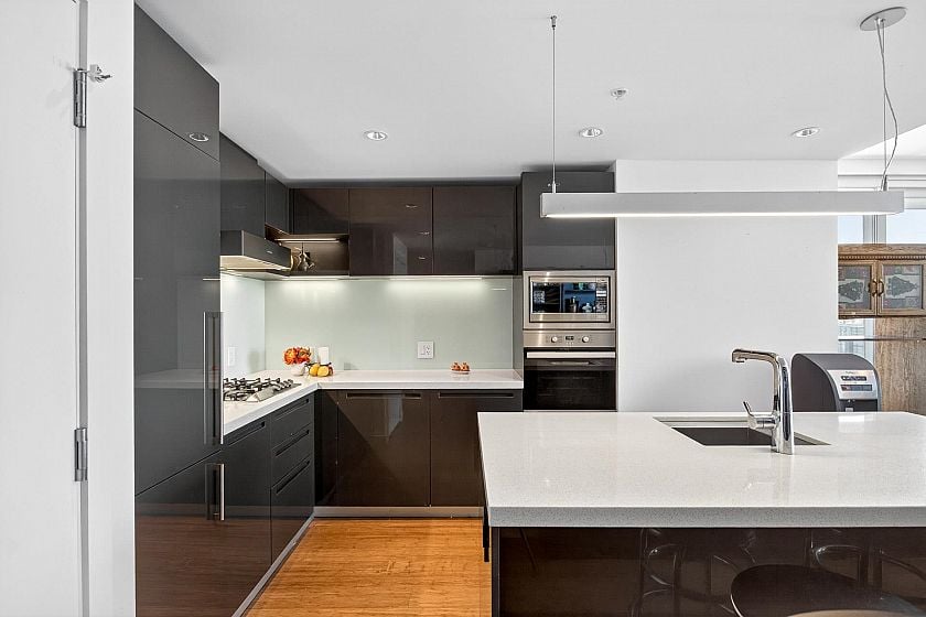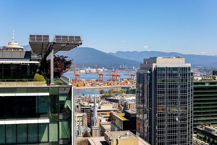 Elevate your downtown lifestyle in this stunning 2-bedroom "Garden Residences" Home. Stunning Panoramic ocean, mountain & city views await! Gourmet Miele kitchen w/island flows to open living/dining area & deck for effortless entertaining. Primary retreat has a huge walk-in closet, luxe ensuite with rain shower, soaker tub & dual vanities. Both bedrooms boast city skylines + a shared deck. Flex den is great for work from home or storage. A/C, in suite laundry, 1 parking stall incl. Luxury Resort like amenities include: 24/7 concierge, EV charging, gym/pool/hot tub/sauna, dog park. Walk to Vancouver's best eats/shops/transit! $4,000.00 decorating allowance for Buyer.