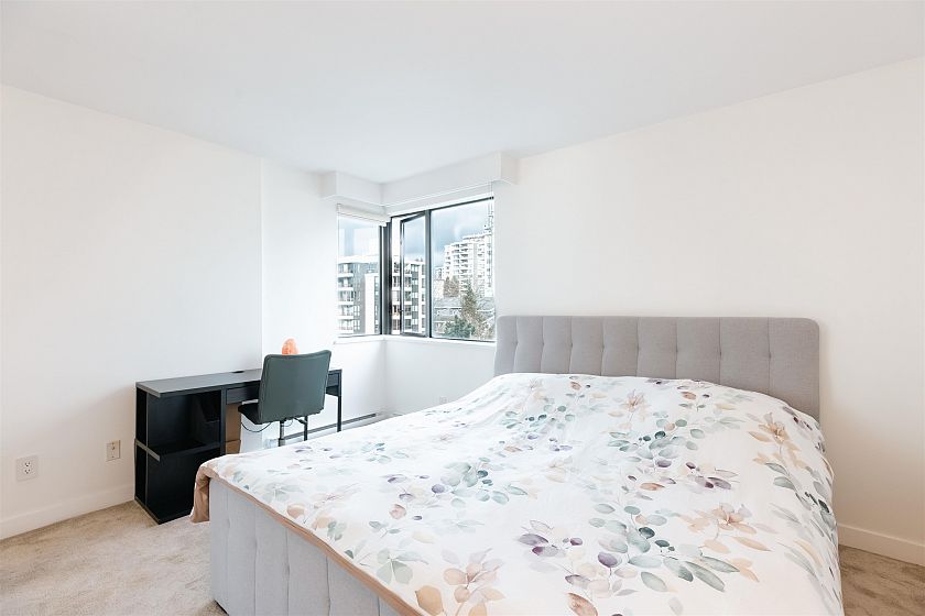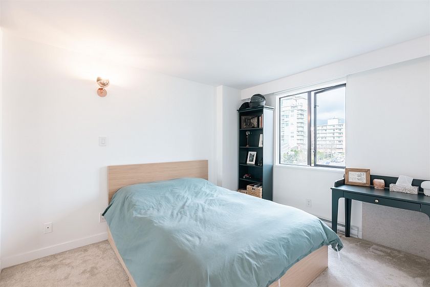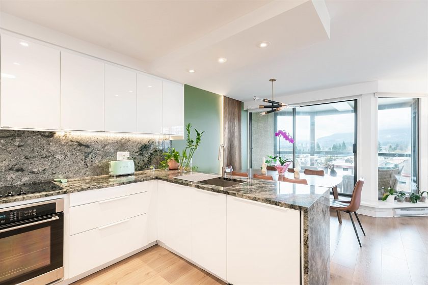 This rarely available concrete corner unit at The Royal Kensington has been completely renovated with high-quality finishes and exceptional craftsmanship throughout. A standout in Lower Lonsdale, where concrete buildings of this era are hard to find. Enjoy stunning water, downtown, Lions Gate Bridge, and mountain views from the main living spaces and the large balcony. The home offers generous room sizes, excellent storage, and a thoughtful layout enhanced by stylish and functional updates. The building is well-managed and features great amenities including an outdoor pool, indoor hot tub, sauna, fitness centre, and workshop. Unbeatable location just steps to restaurants, shops, the SeaBus. Includes one parking spot, a storage locker, and bike room. Rentals allowed. No pets.