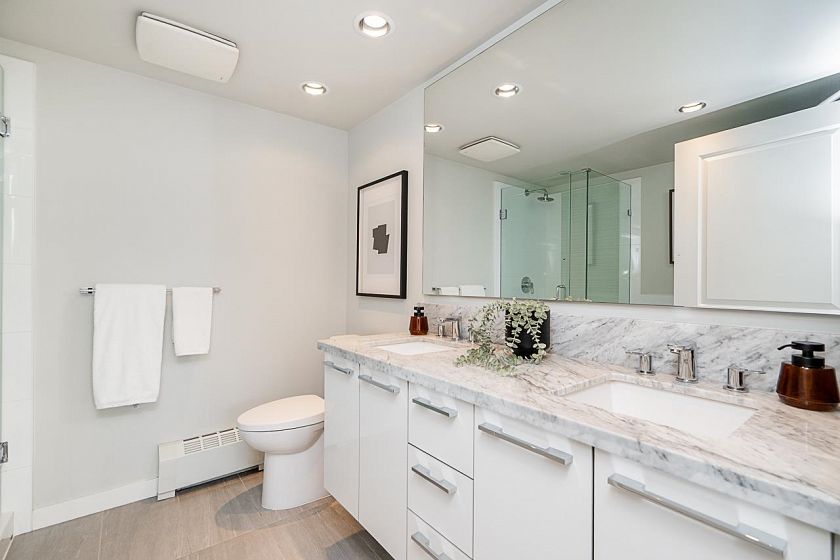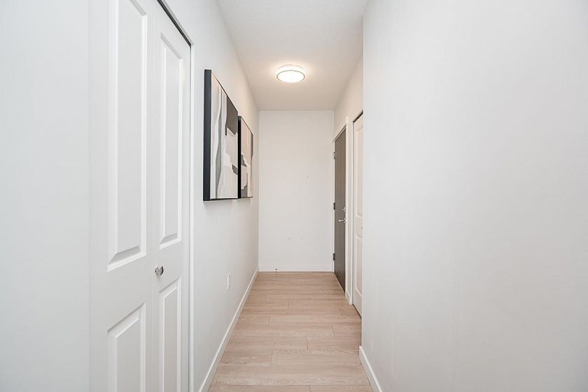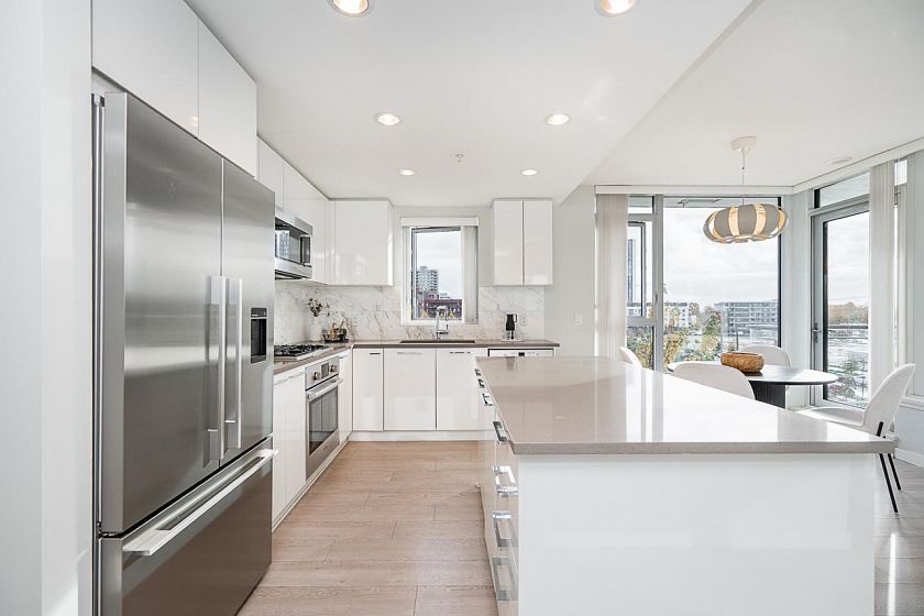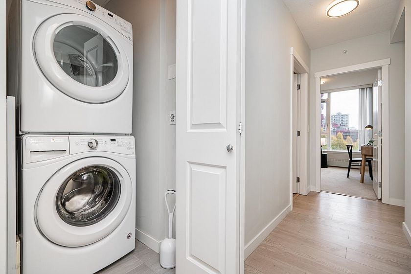 Step into luxury at Rhythm by Polygon! This stunning 5th-floor home offers over 1,000 sq. ft. of living space with unobstructed southern river and park views. Featuring 2 bedrooms, 2 bathrooms + office, this bright open-concept layout feels spacious and inviting. Upgraded with European hardwood laminate floors and custom California Closets. The chef’s kitchen showcases quartz countertops and stainless steel appliances. Enjoy summer evenings on your large private balcony, perfect for entertaining. Amenities include a fitness center, clubhouse, and lush garden. Steps to shops, restaurants, and transit — a perfect blend of comfort and convenience!