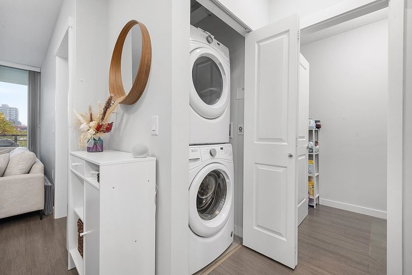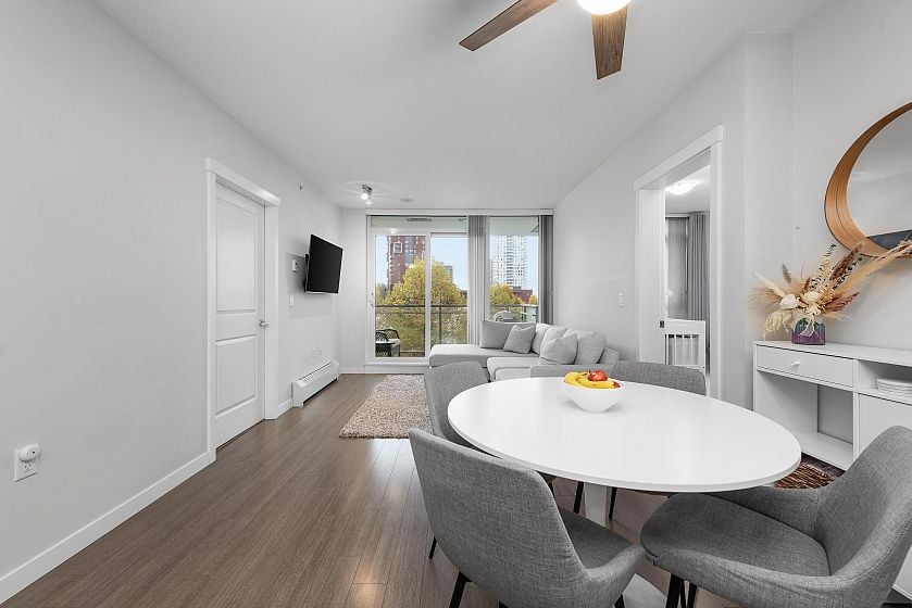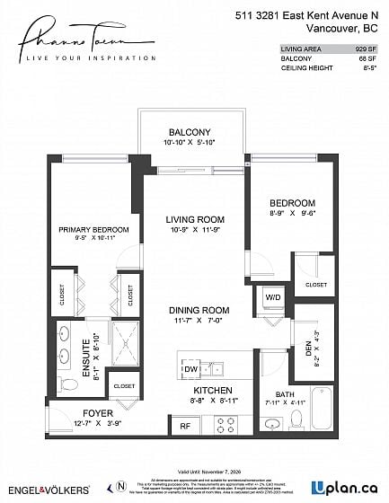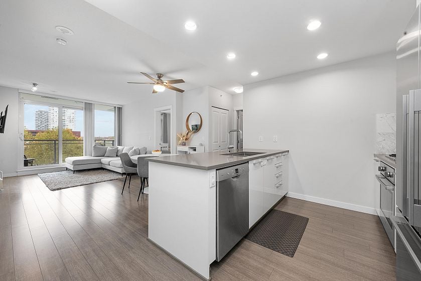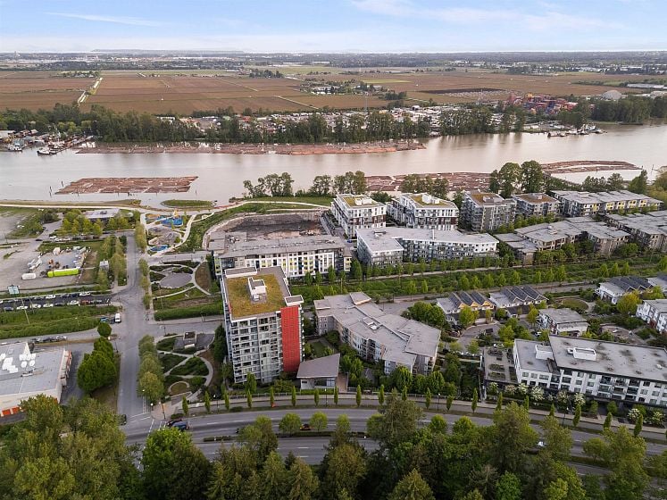 Welcome to Rhythm by Polygon, where modern design meets the calm of the Fraser River. This well-appointed 2 bed + den, 2 bath residence offers 929 sqft of airy, open living with a thoughtful split-bedroom layout for privacy. The kitchen blends style and function with polished quartz surfaces, stainless appliances, and generous cabinetry. A versatile den makes the perfect workspace or nursery. Step out onto your private balcony and take in serene views of the community and riverfront surroundings. Enjoy the Rhythm Club amenities—fitness studio, residents’ lounge, and courtyard retreat. Steps to River District Town Centre, cafés, parks, and trails. 1 parking, 1 locker. Easy access to Richmond, Burnaby, and New West.