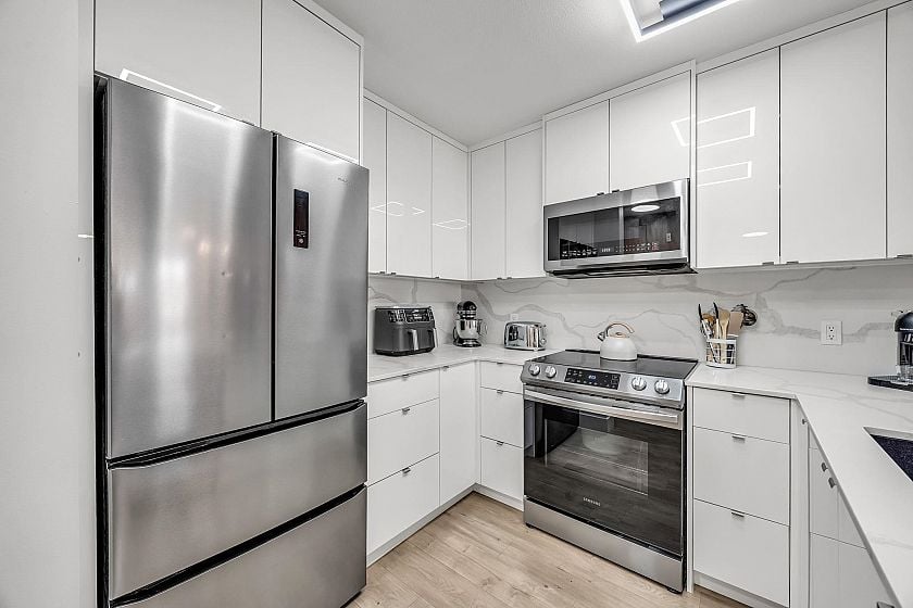 Welcome to this beautifully renovated 2 bed, 2 bath home with stunning Fraser River views. Every detail has been redone from top to bottom — kitchen, bathrooms, flooring, lighting, appliances, and paint — creating a bright, modern space that feels brand new. The open-concept layout features a spacious living and dining area that flows seamlessly to a covered balcony overlooking the river. The updated kitchen offers all new cabinetry and appliances, while the large primary bedroom includes a stylish ensuite. Enjoy peaceful riverside living just steps to River District’s shops, restaurants, cafés, parks, and amazing walking trails. A quiet, move-in-ready home in one of Vancouver’s best waterfront communities—perfect for those seeking modern living in a vibrant, connected neighborhood.
