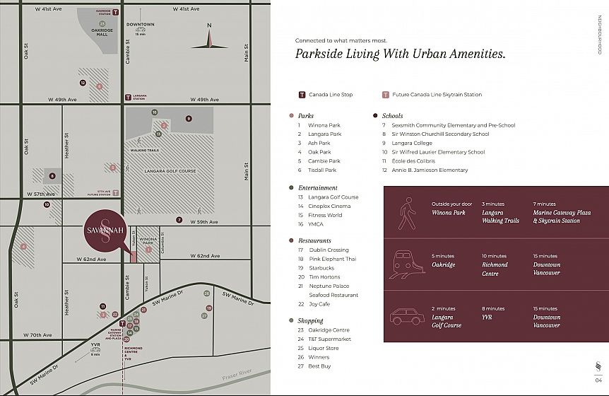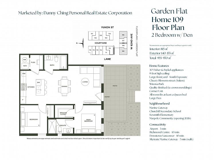 Assignment of Contract, completion est. May 2026. Welcome to Savanna by INAMI, where timeless Georgian-inspired architecture meets modern West Coast living. This elegant south-facing 815'sqft 2-bedroom + den corner home offers a generous private yard. Features include 9 ft ceilings, engineered hardwood flooring, crown moulding, and full air conditioning. The open-concept living and dining areas are complemented by Fisher & Paykel premium appliances, Kohler hardware, and exceptional craftsmanship. Ideally situated across Winona Park and just steps to Marine Gateway and the SkyTrain Station. 1x Parking 1x Locker. Churchill Secondary & Laurier Elementary