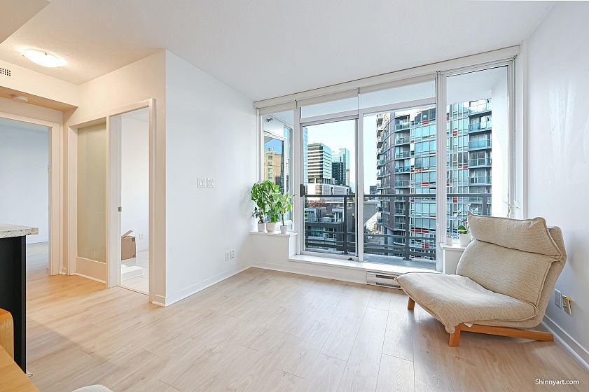 Bright NW-facing 2 bed + den + flex corner unit at Raffles on Robson. This well-designed home features mountains & city views, a covered balcony, and 3-year new laminate flooring. The modern kitchen offers granite counters, sleek cabinetry, and premium appliances by Miele. Bathrooms are finished with marble counters, porcelain tile, and a rain shower. Functional layout with in-suite storage and 1 parking included. Building amenities: gym, hot tub, rooftop BBQ area, media room, and more. Rentals and 1 pet (cat or dog) allowed. Steps to Yaletown, Seawall, transit, dining, and shops.