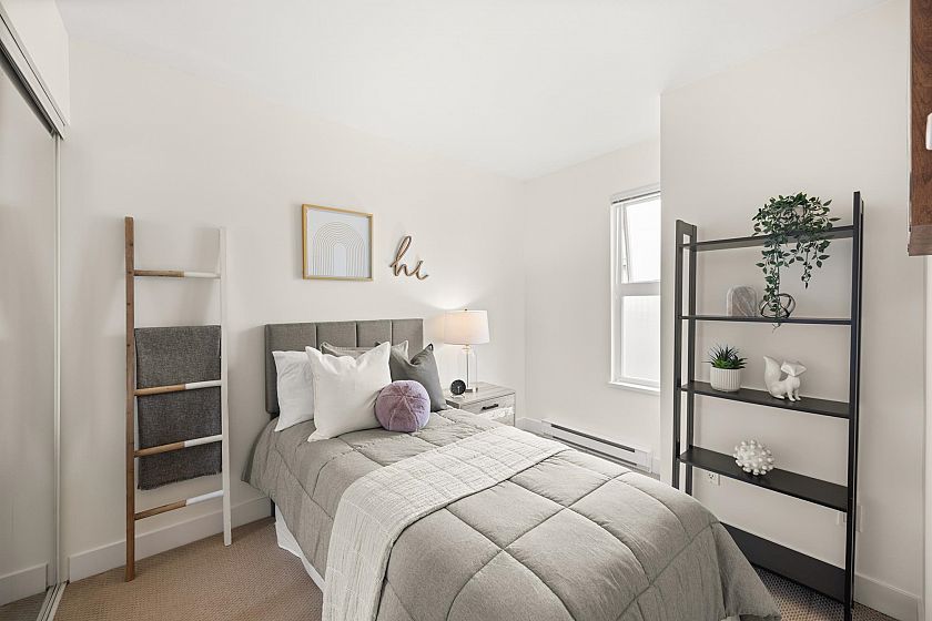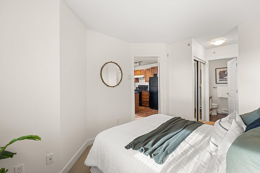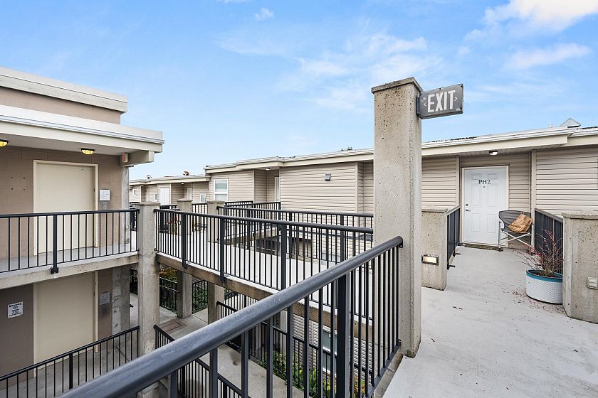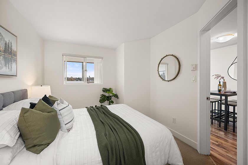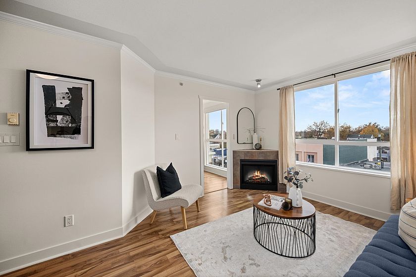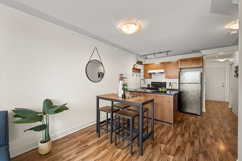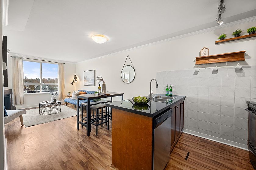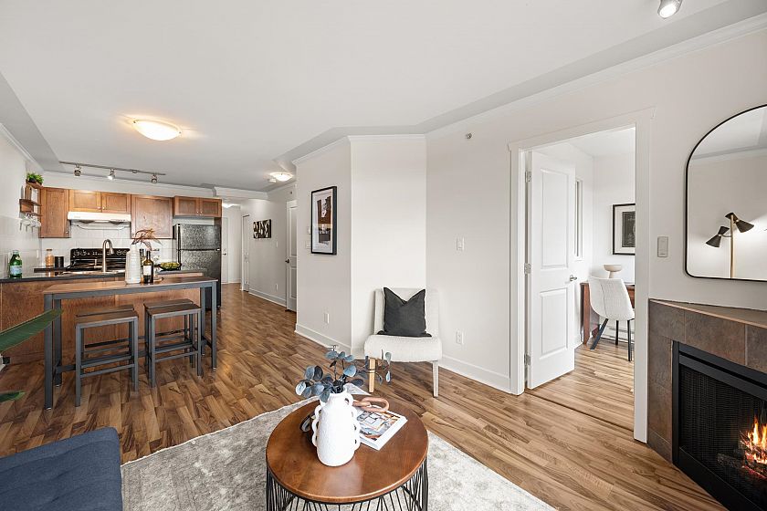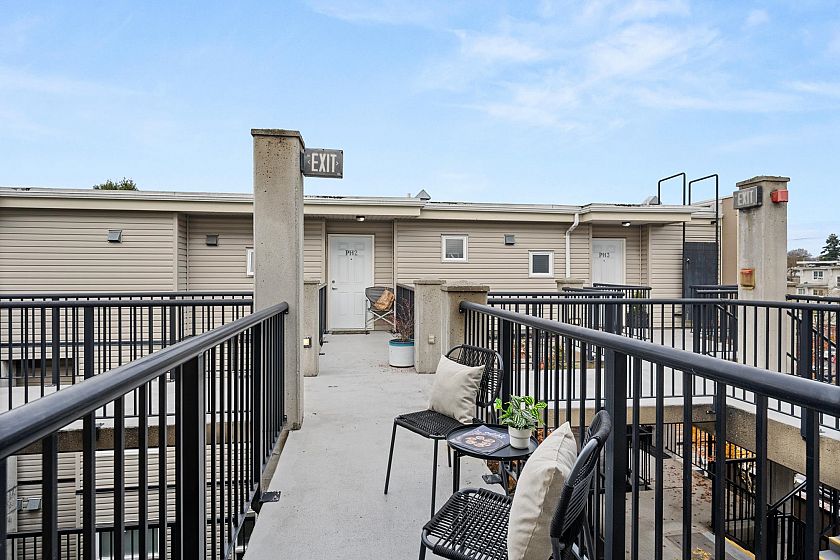 Welcome to Hastings Gate, a unique building in the heart of East Village! This freshly painted TOP-FLOOR 2 bed + den, 2 bath home offers an efficient layout with bright south and north exposures. Enjoy airflow from the peaceful inner courtyard & natural light throughout the day. The open kitchen features stone counters, full-size appliances & breakfast bar, flowing into a spacious living/dining area. Bedrooms are thoughtfully separated for privacy, w/den adding a useful bonus space. The large primary bedroom includes a walk-through closet and ensuite. In-suite laundry, secure parking and storage. Pet-friendly, proactive building steps to Pandora Park, cafés, eateries, shops & transit. A standout opportunity to call home or investment in a thriving, dynamic community! OPEN DEC. 7th 2:30-4pm