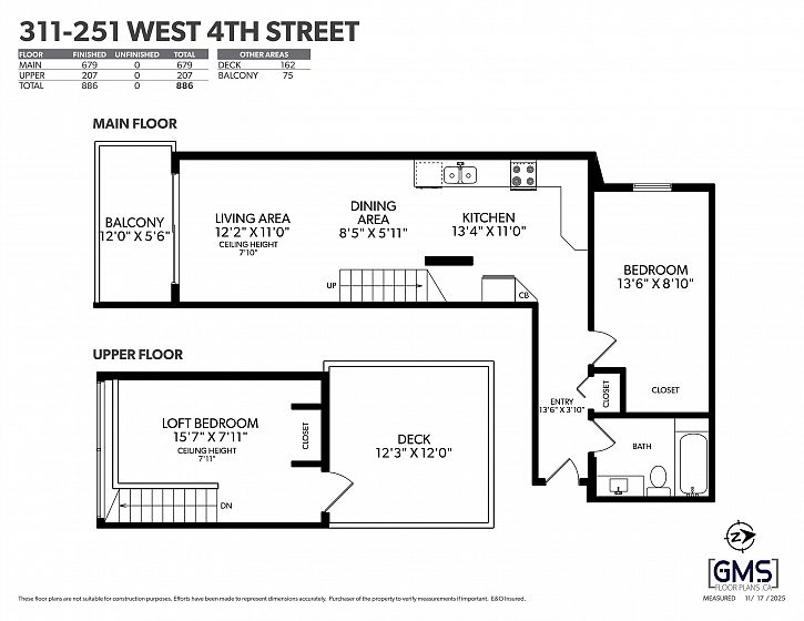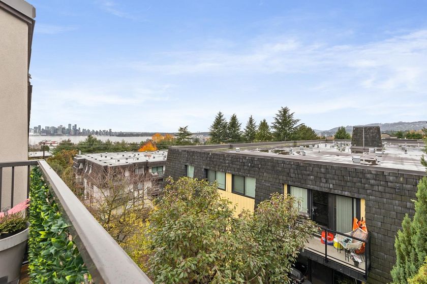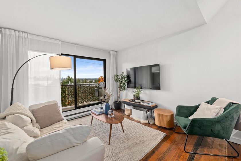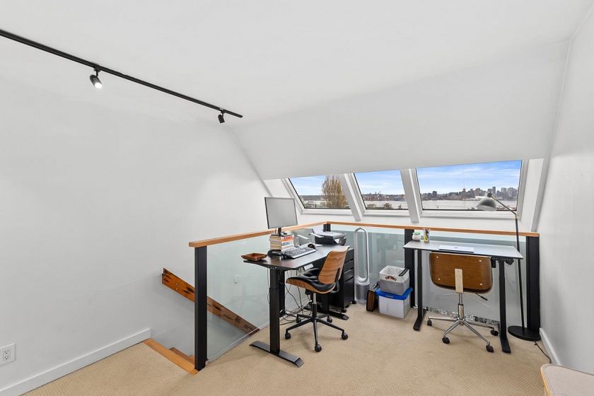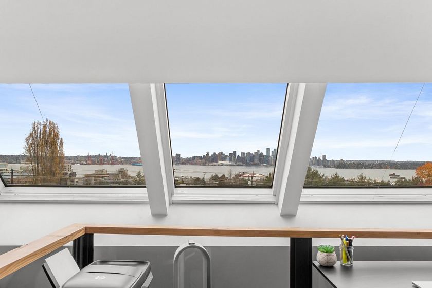 Character-filled 2-bedroom penthouse loft in the heart of Lower Lonsdale with unobstructed ocean and city views. This bright 2-level, 886 sq ft home features vaulted ceilings, skylights, exposed brick, and wood beams for a true New York–loft feel. The main level includes reclaimed fir floors from the North Shore Shipyards, an updated kitchen with custom cabinetry and stainless steel appliances, open dining/living space, a spacious bedroom, a brand-new bathroom, and a south-facing balcony. Upstairs, the loft bedroom offers sweeping skyline views and opens onto a large private rooftop deck with west-facing mountain and sunset views—perfect for relaxing or entertaining. Steps to The Shipyards, SeaBus, shops, and restaurants. This home is truly one-of-a-kind.